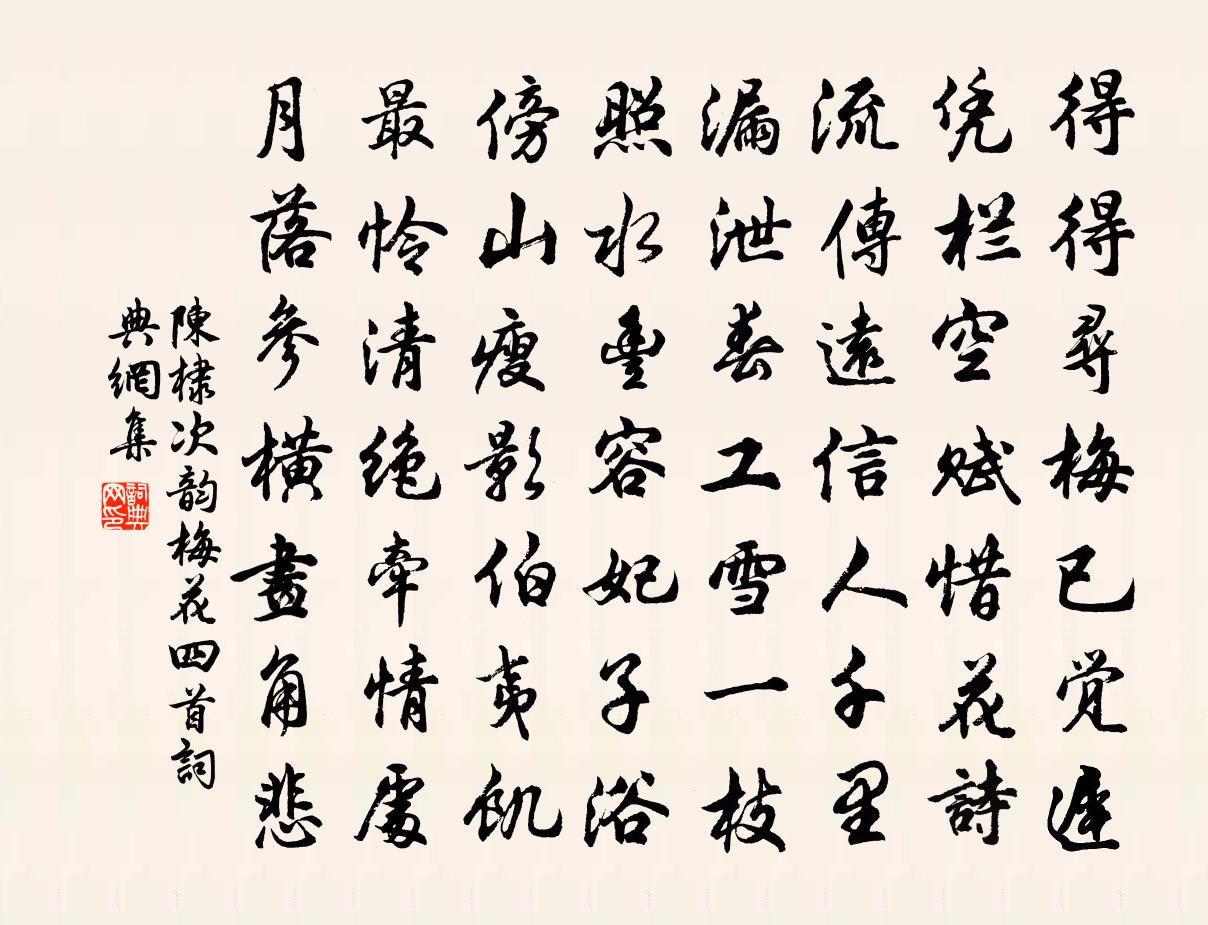 詩詞名句歷史字典書法欣賞書法字典國語詞典說文解字康熙字典古漢語字典標 題 作 者 詩 句 次韻梅花四首作者:陳棣 朝代:宋代次韻梅花四首原文得得尋梅已覺遲,憑欄空賦惜花詩。流傳遠信人千里,漏泄春工雪一枝。照水丰容妃子浴,傍山瘦影伯夷飢。最憐清絕牽情處,月落參橫畫角悲。詩詞問答問:次韻梅花四首的作者是誰?答:陳棣問:次韻梅花四首寫於哪個朝代?答:宋代陳棣次韻梅花四首書法欣賞次韻梅花四首書法作品詩詞推薦歲晏大風陳杰〔宋代〕羌管橫吹萬點梅,漢葭微透半銖灰。從知急景彫年駛,更著驚飈截道催。掠野已空征鳥厲,叫雲欲曙澤鴻哀。布食弟得臣歸覲并州梅堯臣〔宋代〕知君歸去心,已逐秋風起。明發登太行,遠望將汾水。藹藹白雲下,吾親正居此。拜慶曷為榮,新除一官美。【中呂】朝天曲_沛公,大風薛昂夫〔元代〕沛公,大風,也得文章用。卻教猛士嘆良弓,多了游雲夢。駕馭英雄,能擒能縱,無人出彀中。後宮,外宗,險把病癒看鏡陸游〔宋代〕鏡中稍復舊朱顏,一笑衰翁乃爾頑。三百瓮齏消未盡,不知更著幾年還?阮郎歸佚名〔宋代〕無心傍照台。導引佚名〔宋代〕九霄仙馭,四紀樂西清。游衍遍黃庭。雲軿萬里歸真室,上應泰階平。金輿玉像下瑤京。彩仗擁霓旌。天人感會千齊山僧舍孫邁〔宋代〕竹密通幽逕,橋橫逐澗斜。陰崖聳圭壁,古蔓引龍蛇。寺僻虛僧磬,亭荒足免罝。紫微今不見,著意采黃花。寄題南陵息亭蕖閣梅堯臣〔宋代〕竹里有清館,寺中多藕花。日光穿岸腳,水影射檐牙。柱穴蜂歸響,爐檀火過窊。已知民訟息,漉酒費巾紗。臨水亭丘均閭〔唐代〕高館基曾山,微冪生花草。傍對野村樹,下臨車馬道。清朗悟心術,幽遐備瞻討。回合峰隱雲,聯綿渚縈島。氣似紹定三年壽明仁福睿皇太后冊寶九首佚名〔宋代〕帝闕肅開,天階坦屐。霓旌羽蓋,導務坼術。匪夸雕琢,匪矜繁麗。茲謂盛行,億載千幾。灉湖山寺張說〔唐代〕楚老游山寺,提攜觀畫壁。揚袂指辟支,睩眄相鬥鬩。險哉透撞兒,千金賭一擲。成敗身自受,傍人那嘆息。至揚州文天祥〔宋代〕青衣山下汲荒泉,道遇腥風走不前。向晚歸來號且哭,胡兒只為解腰纏。檉桐二首張明中〔宋代〕石榴安敢擬檉桐,借問司花也不中。鶴頂丹砂猩血服,試評卻有此來紅。奉歸柳塘潘希白詩藁趙汝回〔宋代〕織柳縫花雅道衰,將題錦卷復敲推。夜寒吟苦冰澌合,境寂心融造化來。斸石崑崙攜玉下,乘槎河海到天回。今時頌十六首釋慧暉〔宋代〕參得五語,功勳始成。有時不說,恣中說行。有時不玄,空失妙正。有時不顯,才一氣生。有時不出,獨來水清。送可師歸西山兼簡法華無證釋慧空〔宋代〕半世幾離合,翛然無住身。又為一去客,元是再來人。野宿風鳴雪,江行梅破春。兩翁如問我,為話鬢毛新。水調歌頭周權〔元代〕亭小可容膝,真似寄鷯枝。客來休訝迫窄,老子只隨宜。鳧鶴短長莫問,鵬*逍遙自適,何暇論成虧。萬事一尊酒叔誨宿邀湖上之游以故不果往黃庭堅〔宋代〕芰荷采盡荇田田,湖光價當酒十千。主人邀客殊未來,西風枕簟廢書眠。睡罷書窗翻墨汁,龍蛇起陸雲雨濕。晚筵秦人謠古之奇〔唐代〕微生祖龍代,卻思堯舜道。何人仕帝庭,拔殺指佞草。奸臣弄民柄,天子恣衷抱。上下一相蒙,馬鹿遂顛倒。中國雨中遣興 其二王冕〔元代〕故人何日是歸年,又聽剛風洗瘴煙。驕馬北馳沙似雪,冥鴻南去水如天。莫愁弦絕蒲萄館,且喜歌生□□田。好在名句推薦阿婆還似初笄女,頭未梳成不許看。袁枚《遣興》 辛勤三十日,母瘦雛漸肥。白居易《燕詩示劉叟》 不信妾腸斷,歸來看取明鏡前。李白《長相思三首》 若似月輪終皎潔,不辭冰雪為卿熱。納蘭性德《蝶戀花·辛苦最憐天上月》 瑤池阿母綺窗開,黃竹歌聲動地哀李商隱《瑤池》 松樹千年終是朽,槿花一日自為榮。白居易《放言五首·其五》 子規啼徹四更時,起視蠶稠怕葉稀。謝枋得《蠶婦吟》 心似已灰之木,身如不系之舟。蘇軾《自題金山畫像》 修身者,智之府也;愛施者,仁之端也;取予者,義之符也;恥辱者,勇之決也;立名者,行之極也班固《漢書·傳·司馬遷傳》 自奉必須儉約,宴客切勿流連。朱柏廬《朱子家訓·全文》