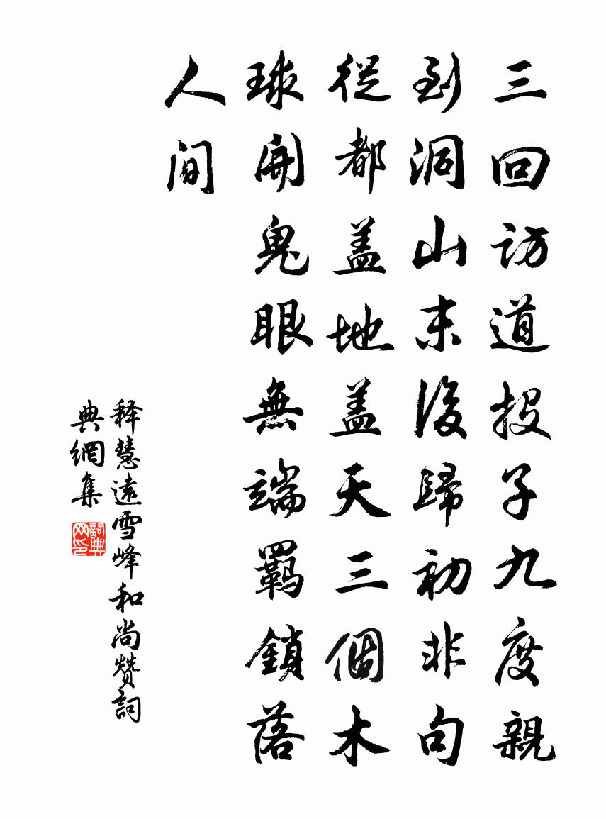 詩詞名句歷史字典書法欣賞書法字典國語詞典說文解字康熙字典古漢語字典標 題 作 者 詩 句 雪峰和尚贊作者:釋慧遠 朝代:宋代雪峰和尚贊原文三回訪道投子,九度親到洞山。末後歸初非句,從都蓋地蓋天。三個木球開鬼眼,無端羈鎖落人間。詩詞問答問:雪峰和尚贊的作者是誰?答:釋慧遠問:雪峰和尚贊寫於哪個朝代?答:宋代釋慧遠雪峰和尚贊書法欣賞雪峰和尚贊書法作品詩詞推薦范文正公黃素小楷昌黎伯夷頌蓋在青社時所書仇遠〔宋代〕古今一理是綱常,范筆韓文妙發揚。公臥首陽原不死,春風歲歲蕨薇香。謝答聞善二兄九絕句黃庭堅〔宋代〕阮籍醉睡不論昏,劉伶雞肋避尊拳。至今凜凜有生氣,飲酒真成不愧天。和寬居見懷韻王柏〔宋代〕北望戲馬台,荊榛滿中路。英氣一何多,懷古渺難泝。山河腥日月,虎豹沐雨露。累累楚猴冠,異哉天所賦。豈無偈六十九首釋道寧〔宋代〕數日寺門浩浩,全身走入荒草。五湖高士安禪,休要別處尋討。廊下喏諾分明,階前斛斟叫噪。勞生日用無私,般題袁州邵錄三老圖王義山〔宋代〕堂前活現老人星,兩個齊眉作壽朋。更有膝邊兒戲彩,此身都及見雲仍。再和四首吳芾〔宋代〕歸來深欲斷塵緣,常拜青詞密籲天。既幸此身無玷辱,更欣盡室得團圓。捫心只合安三徑,度力那能障百川。若也蝶戀花佚名〔宋代〕援可逾。既望之夕,張因梯樹而逾焉。達於西廂則戶半開矣。無幾紅娘復來,連曰:至矣,至矣。張生且喜且駭,題翁卷山居二首徐照〔宋代〕十年前有約,今卻在城居。羨爾能攜子,深山自結廬。引泉移岸石,栽藥就園蔬。見說高林外,樵人聽誦書。和余汝霖雪七絕胡寅〔宋代〕無數天花斗舞風,迷離玉色映寒空。共夸破臘逾三白,更喜新詩報屢豐。南坡口號十八首鄭清之〔宋代〕酷愛鳥鳴山更幽,牆陰風雨但颼颼。筠籠買得春禽語,不會憂時也白頭。寄蘇州徐處士弁陶弼〔宋代〕平南無策鬢如霜,七十峰前隱舊鄉。相約祝融孤頂上,借君吟筆畫瀟湘。藕花華岳〔宋代〕惜絲不肯織宮鞋,花月仙人謫不來。河伯借泥封玉腕,風神翻流沃香腮。無房不許蜂留宿,有蓋嘗令鷺自開。何事促促詞張籍〔唐代〕促促復促促,家貧夫婦歡不足。今年為人送租船,去年捕魚在江邊。家中姑老子復小,自執吳綃輸稅錢。家家桑麻上嶺汪炎昶〔宋代〕客程不遑息,犯暑凌嶺崯。微風不足涼,汗流被衣襟。忙行趁雲影,已過他山陰。疲極覺更高,攀躋力不任。幽蟬三國門蜀先主周曇〔唐代〕豫州軍敗信途窮,徐庶推能薦臥龍。不是卑詞三訪謁,誰令玄德主巴邛。題崔莊庵壁姚勉〔宋代〕碧潭見說有龍蟠,萬里滄溟氣欲吞。此去風雷轟蟄起,大施霖雨霈乾坤。送次公子之官安仁監稅楊萬里〔宋代〕汝仕今差晚,家庭莫恨離。學須官事了,廉忌世人知。爭進非身福,臨民只母慈。關征豈得已,龍斷欲何為。次韻朱景伯來見陳著〔宋代〕平生四海弟兄之,況是鄉關見白眉。方醉夢中能獨醒,自離亂後篤相知。溪山坎坎勞飛旆,風雨瀟瀟苦說詩。老耳代上折樞彥質生朝二首張元乾〔宋代〕天扶王室挺生申,瑞啟中興社稷臣。樽俎折衝常自任,廟堂康濟更何人。秋風玉帳軍容肅,冷月鈴齋夜宴新。願掃山居雜詩九十首曹勛〔宋代〕伏日更酷暑,當午劇炎烈。火雲凝不動,勢欲終歲熱。天公蘇赤子,雨隨震霆發。一掃回清涼,庭筠助騷屑。名句推薦千里之行,始於足下。老子《老子·德經·第六十四章》 擬把傷離情緒,待曉寒重說。納蘭性德《好事近·簾外五更風》 乘興南遊不戒嚴,九重誰省諫書函。李商隱《隋宮》 仁暴者,皆亡國者也。韓非及後人《韓非子·八說》 謂誰朝來不作意,狂風挽斷最長條。杜甫《絕句漫興九首·其一》 渡頭楊柳青青。枝枝葉葉離情。晏幾道《清平樂·留人不住》 飛鴻過也。萬結愁腸無晝夜。蔣氏女《減字木蘭花·題雄州驛》 今日大風寒,寒風摧樹木,嚴霜結庭蘭佚名《孔雀東南飛並序/古詩為焦仲卿妻作》 雲來氣接巫峽長,月出寒通雪山白。杜甫《古柏行》 有孫母未去,出入無完裙。杜甫《石壕吏》