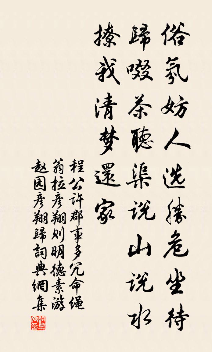 詩詞名句歷史字典書法欣賞書法字典國語詞典說文解字康熙字典古漢語字典標 題 作 者 詩 句 郡事多冗命繩翁拉彥翔則明德素游趙園彥翔歸作者:程公許 朝代:宋代原文俗氛妨人選勝,危坐待歸啜茶。聽渠說山說水,撩我清夢還家。詩詞問答問:《郡事多冗命繩翁拉彥翔則明德素游趙園彥翔歸》的作者是誰?答:程公許問:該詩寫於哪個朝代?答:宋代書法欣賞郡事多冗命繩翁拉彥翔則明德素游趙園彥翔歸書法作品詩文賞析【原題】:郡事多冗命繩翁拉彥翔則明德素游趙園彥翔歸以五章示教用韻詩詞推薦相和歌辭。銅雀台羅隱〔唐代〕強歌強舞竟難勝,花落花開淚滿繒。只合當年伴君死,免教憔悴望西陵。喜雨三首吳潛〔宋代〕晚上危樓望碧岑,雲煙開闔弄晴陰。見前鷗鷺移心法,何處鴟梟過耳音。好雨十分催暑駕,涼風一宿動秋砧。誰憐留題南樓二絕歐陽修〔宋代〕偷得青州一歲閒,四時終日面孱顏。須知我是愛山者,無一詩中不說山。夢裴相公白居易〔唐代〕五年生死隔,一夕魂夢通。夢中如往日,同直金鑾宮。仿佛金紫色,分明冰玉容。勤勤相眷意,亦與平生同。既寤聞崔倚旅葬劉言史〔唐代〕遠客那能返故廬,蒼梧埋骨痛何如。他時親戚空相憶,席上同悲一紙書。松桂堂蘇泂〔宋代〕伯夷能使鄙夫寬,此老傳家不在官。魂夢猶能教兒息,九原風節更高寒。平時兄弟間十三章四句送定叟弟之官桂林張栻〔宋代〕嶺海坐清靜,府公金玉姿。幕府省文書,簡編可委蛇。襄陽懷古鮑溶〔唐代〕襄陽太守沈碑意,身後身前幾年事。湘江千歲未為陵,水底魚龍應識字。漁家傲 贈寧生王哲〔元代〕夫喚三郎妻九姐。兩椽合得一間舍。骨作檣梁皮作瓦。休夸詫。父娘成就伊居也。兒願室家女願嫁。舅姑修葺何時首尾吟邵雍〔宋代〕堯夫非是愛吟詩,詩是堯夫睡覺時。夢後舊歡初仿佛,酒醒前事略依稀。任經生死心無異,雖隔江湖路不迷。因向枕上吟華岳〔宋代〕畫角梅花吸曉寒,數聲清徹碧雲端。誰知有客愁無寐,一掬鄉心不奈酸。讀楞嚴洪咨夔〔宋代〕人人有路證無還,一念才差隔萬山。識得吾儒無妄卦,筏城長語盡須刪。作夢陸游〔宋代〕作夢今逾七十年,平生懷抱尚依然。結茅杜曲桑麻地,覓句灞橋風雪天。驃騎向來求作佛,淮南末路望登仙。世間郊野戲題鄭谷〔唐代〕竹巷溪橋天氣涼,荷開稻熟村酒香。唯憂野叟相迴避,莫道儂家是漢郎。句吳潛〔宋代〕粲粲黃金裾,亭亭白玉膚。極知時好異,擬與歲寒俱。墮地良不忍,抱枝寧自枯。七言四韻十六首張伯端〔宋代〕萬卷仙經話總同,金丹只此是根宗。依他坤位生成體,種向乾家交感宮。莫怪天機俱漏盡,都緣學者盡迷濛。若人贈陸鬯浙西進詩除官章孝標〔唐代〕帝城雲物得陽春,水國煙花失主人。昨日天風吹樂府,六宮絲管一時新。登塔陸游〔宋代〕冷官無一事,日日得閒遊。壯哉千尺塔,攝衣上上頭,眼力老未減,足疾新有瘳,幸茲濟勝具,俯仰隘九州。雪山減字木蘭花(中秋)謝薖〔宋代〕尋常三五。坐待丹山飛玉兔。試問常娥。底事清光此夜多。尊空客滿。縱有鷫鸘無處換。不倒金荷。可奈金波瀲灩秋日同劉方明游石師岩李彌遜〔宋代〕翠合峰巒萬葉稠,雲擎佛屋出岩幽。秋光不到庭陰樹,曉日先明竹外樓。戶牖高低分世界,川原遠近失汀洲。陽休名句推薦厚者不毀人以自益也,仁者不危人以要名。劉向《戰國策·燕三·燕王喜使栗腹以百金為趙孝成王壽》 日往菲薇,月來扶疏。左思《三都賦》 為報今年春色好。花光月影宜相照。李清照《蝶戀花·上巳召親族》 受任於敗軍之際,奉命於危難之間諸葛亮《前出師表》 息徒蘭圃,秣馬華山。嵇康《贈秀才入軍·其十四》 那作商人婦,愁水復愁風。李白《長干行二首》 行出於己,名生於人。佚名《逸周書·卷六·諡法解》 乍聽得、鴉啼鶯弄,惹起新愁無限。呂渭老《薄倖·青樓春晚》 腸已斷,淚難收。相思重上小紅樓。辛棄疾《鷓鴣天·晚日寒鴉一片愁》 自古逢秋悲寂寥,我言秋日勝春朝。劉禹錫《秋詞》