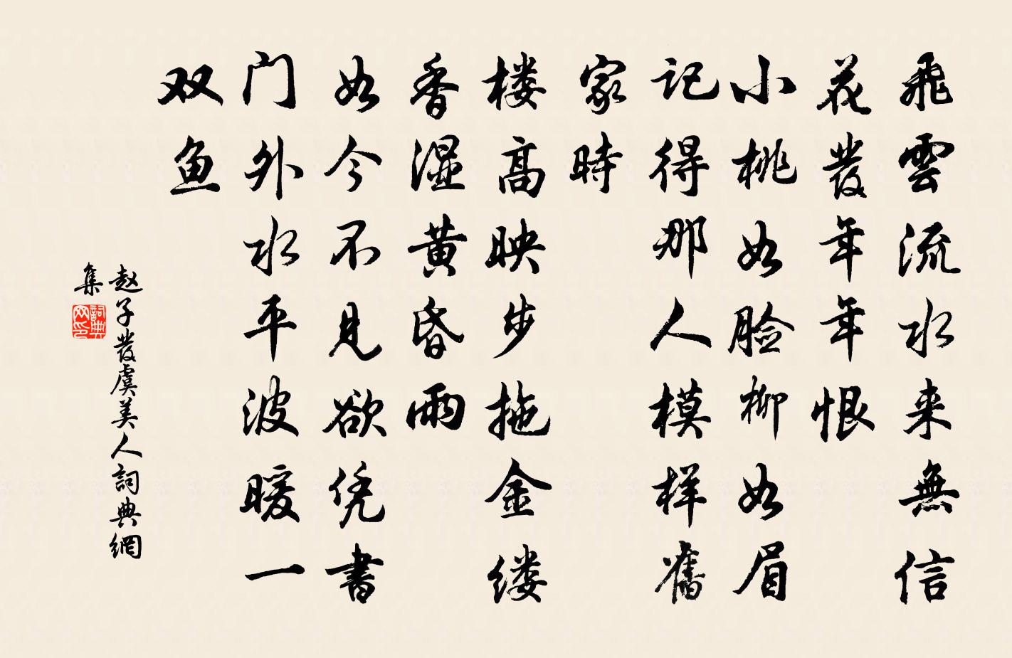 詩詞名句歷史字典書法欣賞書法字典國語詞典說文解字康熙字典古漢語字典標 題 作 者 詩 句 虞美人作者:趙子發 朝代:宋代虞美人原文飛雲流水來無信。花發年年恨。小桃如臉柳如眉。記得那人模樣、舊家時。樓高映步拖金縷。香濕黃昏雨。如今不見欲憑書。門外水平波暖、一雙魚。詩詞問答問:虞美人的作者是誰?答:趙子發問:虞美人寫於哪個朝代?答:宋代問:虞美人是什麼體裁?答:詞趙子發虞美人書法欣賞虞美人書法作品詩詞推薦嚴陵釣台錢聞詩〔宋代〕無復塵勞夢,猶蒙故舊知。寧辭萬鍾祿,不負一綸絲。石魚樓楊簡〔宋代〕多謝天工意已勤,四時換樣示吾人。碧桃丹杏分明了,綠艾紅榴次第陳。秋雁聲中休鹵莽,雪梅枝上莫因循。機關青玉案吳潛〔宋代〕十年三過蘇台路。還又是、匆匆去。迅景流光容易度。鷺洲鷗渚,葦汀蘆岸,總是消魂處。蒼煙欲合斜陽暮。付與江山送客次韻於石〔宋代〕依依柳色黯江亭,酒味離愁孰重輕。攜手忍著分手處,別時爭似見時情。百年離合悲歡事,一笑東西南北程。芳草真珠簾(近雅軒即事)張炎〔宋代〕雲深別有深庭宇。小簾櫳、占取芳菲多處。花暗水房春,潤幾番酥雨。見說蘇堤晴未穩,便懶趁、踏青人去。休去商歌羅與之〔宋代〕白屋釜生魚,青樓行細膾。靜思天地間,寧有私覆載。黃金台和吳實堂韻汪元量〔宋代〕把酒上金台,傷心淚落杯。君臣難再得,天地不重來。古木巢蒼鶻,殘碑枕碧苔。倚闌休北望,萬里起黃埃。和介甫明妃曲梅堯臣〔宋代〕明妃命薄漢計拙,憑仗丹青死悞人。一別漢宮空掩淚,便隨胡馬向胡塵。馬上山川難記憶,明明夜月如相識。月下瀟灑王冕〔元代〕漸覺離鄉遠,寧知出處迂。風流看隊馬,瀟灑入雙魚。誰解辭千乘,無人說二疏。老吾情不怯,漫讀古人書。送郭參軍赴絳州李端〔唐代〕登車君莫望,故絳柳條春。蒲澤逢胡雁,桃源見晉人。佐軍髯尚短,擲地思還新。小謝常攜手,因之醉路塵。子規朱繼芳〔宋代〕自身歸未得,卻勸別人歸。思婦心中事,征夫淚滿衣。蜀天知近遠,江樹間稠稀。幸自安雙翼,誰教大奮飛。賀新郎詠槐〔宋代〕綠長宮階蓂九。近黃鍾、薰晴愛日,漸添宮繡。乾鵲檐頭聲聲喜,催與東屏祝壽。怪一點、星明南斗。玉燕當年儲卜運算元佚名〔宋代〕雲雨陽台夢不成。梅花十絕句趙蕃〔宋代〕雨薄梅花似有情,定應憐我太飢生。不同玉屑和朝露,且效夕餐收落英。送彭秀才南遊徐鉉〔唐代〕問君孤棹去何之,玉笥春風楚水西。山上斷雲分翠靄,林間晴雪入澄溪。琴心酒趣神相會,道士仙童手共攜。他日釋奠詩應令江總〔隋代〕奠余幣久。辰良景暮。黍稷非馨。苹蘩式昨。崇敬台保。昭彰審諭。翠蓋移陰。斑輪徐渡。淨土院姚愈〔宋代〕勁節摩雲歲月深,冰霜不改舊時陰。靜浮香篆度幽徑,冷滴翠光生茂林。明月滿窗橫好墨,清風入指接黃金。箇中東歸擬再訪呂所盤不果所盤有詩因次韻丘葵〔宋代〕何處啼鵑送落暉,江山信美不如歸。子期死矣今安有,元亮來兮昨已非。世事悠悠春夢斷,人才落落曉星稀。白頭馬上作陸游〔宋代〕三十年前客帝城,城南結騎盡豪英。湖山冷落悲陳跡,文字流傳付後生。衰老更禁新臥病,塵埃時拂舊題名。馬頭沁園春(詠劉篁 栗碧蓮,時內子將誕)劉清夫〔宋代〕淺碧芙蓉,素艷亭亭,前身阿嬌。記湘濱露冷,酥容倍潔,華清水滑,酒暈全消。瑤剪豐肥,雲翻碎萼,白羽鮮明名句推薦驪宮高處入青雲,仙樂風飄處處聞。白居易《長恨歌》 至樂無樂,至譽無譽。莊子《莊子·外篇·至樂》 處世不退一步處,如飛蛾投燭、羝羊觸藩,如何安樂?洪應明《菜根譚·概論》 遙想江口依然,鳥啼花謝,今日誰為主。王瀾《念奴嬌·避地溢江書於新亭》 君子所,其無逸佚名《尚書·周書·無逸》 對酒當歌,強樂還無味。柳永《蝶戀花·佇倚危樓風細細》 採蓮時,小娘紅粉對寒浪。溫庭筠《荷葉杯·鏡水夜來秋月》 眾中聞謦欬,未語知鄉里。蘇軾《送金山鄉僧歸蜀開堂》 三十功名塵與土,八千里路雲和月。岳飛《滿江紅·寫懷》 長夏村墟風日清,檐牙燕雀已生成。張耒《夏日三首·其一》