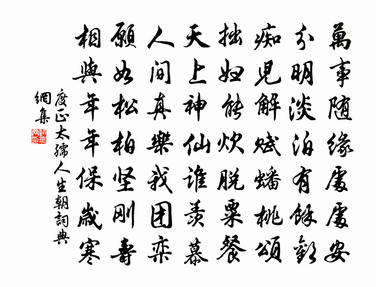 詩詞名句歷史字典書法欣賞書法字典國語詞典說文解字康熙字典古漢語字典標 題 作 者 詩 句 太孺人生朝作者:度正 朝代:宋代太孺人生朝原文萬事隨緣處處安,分明淡泊有餘歡。痴兒解賦蟠桃頌,拙婦能炊脫粟餐。天上神仙誰羨慕,人間真樂我團欒。願如松柏堅剛壽,相與年年保歲寒。詩詞問答問:太孺人生朝的作者是誰?答:度正問:太孺人生朝寫於哪個朝代?答:宋代度正太孺人生朝書法欣賞太孺人生朝書法作品詩詞推薦定風波(丙寅四月吳門西樓之集)蔡伸〔宋代〕老去情鐘不自持。篸花酌酒送春歸。玉貌冰姿人窈窕。一笑。清狂豈減少年時。欲上香車俱脈脈,半簾花影月平西夜宿倪庵坐雨二首陳著〔宋代〕連朝雲靄靄,一夜雨颼颼。漲霧黑天曉,洗山黃澗流。潤深麻長骨,濕重麥垂頭。春水可農事,只愁兵未休。贈高式顏杜甫〔唐代〕昔別是何處,相逢皆老夫。故人還寂寞,削跡共艱虞。自失論文友,空知賣酒壚。平生飛動意,見爾不能無。送盧拾遺歸華山徐夤〔唐代〕紫殿諫多防佞口,清秋假滿別明君。惟憂急詔歸青瑣,不得經時臥白雲。千載茯苓攜鶴劚,一峰仙掌與僧分。門前哭張融耿湋〔唐代〕早歲能文客,中年與世違。有家孀婦少,無子吊人稀。繐帳塵空暗,銘旌雨不飛。依然舊鄉路,寂寞幾回歸。九月九日堂紅葉二首汪元量〔宋代〕鳳凰山上少人家,紅葉漫山映落霞。卻笑陶潛歸栗里,東籬寂寞對黃花。脫京口出隘難文天祥〔宋代〕袖攜匕首學銜枚,橫渡城關馬欲猜。夜靜天昏人影散,北軍鼾睡正如雷。和經父寄張繢二首孔平仲〔宋代〕半通官職萬人才,卷蓄經綸未得開。鸞鳳托巢雖枳棘,神仙定籍已蓬萊。但存漆室葵心在,莫學荊山玉淚哀。倚伏送賈教授偉滿罷東歸王之道〔宋代〕妙年才氣擅超群,試吏來司泮水芹。行矣玉堂 * 直,忍將風袂與君分。別陳景明二首黃公度〔宋代〕冕旒目送出延英,鼓吹江喧引去程。三夏日遲心自急,百年恩重命還輕。賈胡久矣傳詩句,蠻長依然識姓名。丹鼎遺愛寺白居易〔唐代〕弄日臨溪坐,尋花繞寺行。時時聞鳥語,處處是泉聲。陳文懿公輓詞樓鑰〔宋代〕眾口推文伯,何人識吏師。義襟惟古有,心地只天知。至死終無玷,平生本不欺。在公亡可憾,猶恨哲人萎。雨晴步至山亭欲遂游東村不果陸游〔宋代〕村陋垣屋頹,歲晚風雨橫。泥塗絕還往,餐粥養衰病。藥囊雜書卷,白髮滿清鏡。一榻臥兼旬,不踐牆下徑。烏鵲齊優開籠飛去所獻楚王鵠崔樞〔唐代〕受命籠齊鵠,交歡獻楚王。惠心先巧辯,戢羽見迴翔。意適清風遠,憂除白日長。度雲搖舊影,過樹閱新芳。直取晝過荷葉浦二首陳造〔宋代〕一舟失得關生死,中夜何人肆奪攘。外此湖江多樂土,憶常通夕聽漁榔。山雞王安石〔宋代〕山雞照淥水,自愛一何愚。文採為世用,適足累形軀。嘉禾百詠高使君祠張堯同〔宋代〕一瞑移藩日,邦人昔被恩。步兵碑尚在,功業敢經綸。傅推官勸農七絕句擬和其五登嶺鄭剛中〔宋代〕一懷天邊兩角雲,嶺頭都見嶺南春。莫懷小魯東山意,祗是早來平地人。江上度元宵節袁說友〔宋代〕一舟元夕臥孤村,夜半相呼了不應。說與兒曹休誶語,黃州明日買殘燈。可惜丁開〔宋代〕日者今何及,天乎有不平。功高人共嫉,事定我當烹。父老俱嗚咽,天王本聖明。不愁唯黨禍,攜淚向孤城。名句推薦社下燒錢鼓似雷,日斜扶得醉翁回。范成大《春日田園雜興》 黃華自與西風約,白髮先從遠客生。元好問《秋懷》 去年夜半橫江夢,倚危檣,參差曾賦劉辰翁《桂枝香· * 人去》 腸斷月明紅豆蔻,月似當時,人似當時否?納蘭性德《鬢雲松令·枕函香》 年時俯仰過,功名宜速崇。張華《壯士篇》 德之不修,學之不講,聞義不能徙,不善不能改,是吾憂也。孔子弟子《論語·述而篇》 魏都接燕趙,美女夸芙蓉。李白《魏郡別蘇明府因北游》 林表明霽色,城中增暮寒。祖詠《終南望余雪》 蘭帳玉人睡覺,怪春衣、雪沾瓊綴。章楶《水龍吟·燕忙鶯懶芳殘》 古人不見今時月,今月曾經照古人。佚名《增廣賢文·上集》