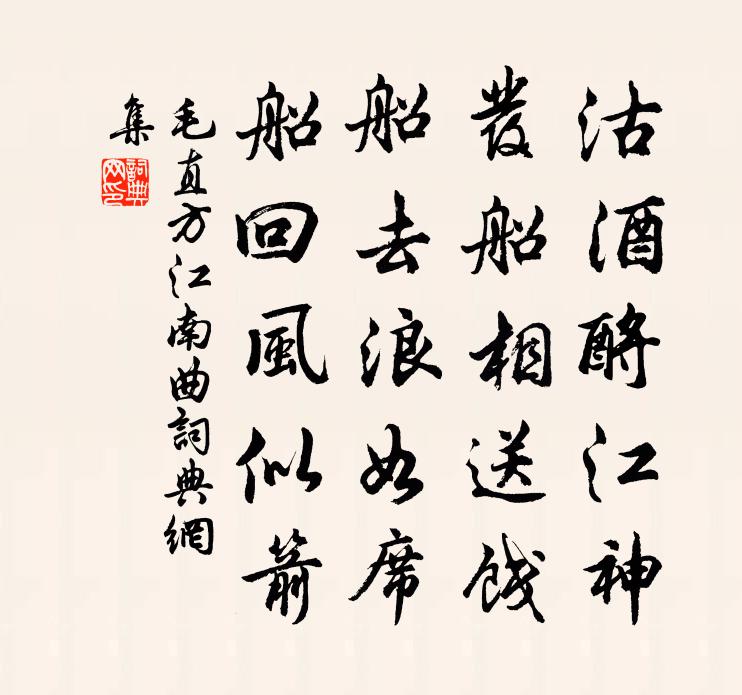 詩詞名句歷史字典書法欣賞書法字典國語詞典說文解字康熙字典古漢語字典標 題 作 者 詩 句 江南曲作者:毛直方 朝代:宋代江南曲原文沽酒酹江神,發船相送餞。船去浪如席,船迴風似箭。詩詞問答問:江南曲的作者是誰?答:毛直方問:江南曲寫於哪個朝代?答:宋代毛直方江南曲書法欣賞江南曲書法作品詩詞推薦頌古五首釋原妙〔宋代〕盡枯腸喪盡機,通身不掛一毫絲。清風步步隨身轉,明月誰分上下池。鷓鴣天(壽趙松廬)劉辰翁〔宋代〕占得春風五日先。至今住處是開元。寫真若遇丹元子,只著當時宮錦船。松戴雪,自蒼然。八公花下少如前。看來春晚客懷 其六王冕〔元代〕詩酒從時適,功名委壯圖。好山隨處有,閒客近來無。冠蓋駢三輔,烽塵暗四隅。餘生營計拙,且僦好樓居。朝退鄭獬〔宋代〕朝退洗雙耳,厭聞人是非。不知春意晚,時有燕聲歸。散木還容老,孤雲亦倦飛。趨時自疏闊,不是學忘機。游下岩崇封院程公許〔宋代〕鼓枻前春過下岩,空將目力寧雲端。而今真箇岩頭去,領取煙雲潑袂寒。佳雨應祈因思昔年諸友作詩今再敘舊朱長文〔唐代〕晏侯昔為州,歲旱慶霖雨。夫君與方子,吟思共清苦。不才輒繼聲,玉石愧同處。賡酬自邦君,高歌遍幕府。開編火田鄭次山貧士也有燕坐之處五為賦之觀小陳文蔚〔宋代〕一息萬里馳,白日天無光。歸來固吾圉,宇泰生吉祥。春日長安送從弟尉吳縣李嘉祐〔唐代〕春愁能浩蕩,送別又如何。人向吳台遠,鶯飛漢苑多。見花羞白髮,因爾憶滄波。好是神仙尉,前賢亦未過。句尤袤〔宋代〕送客漸稀城漸遠,歸途應減兩三程。次韻寅庵四首黃庭堅〔宋代〕未怪窮山寂寞居,此情常與世情疏。誰家生計無閒地,太半歸來已白須。不用看雲眠永日,會思臨水寄雙魚。公私荔支盛熟四絕劉克莊〔宋代〕曾攀玉李青冥上,亦摘蟠桃縹緲邊。定是三生有靈骨,謫歸猶作荔支仙。蟬虞世南〔唐代〕垂緌飲清露,流響出疏桐。居高聲自遠,非是藉秋風。次韻虞退夫除夕七絕句魏了翁〔宋代〕虞倩思親感歲年,歸心巫峽暮雲前。乖逢逝止那能料,靜倚閒雲看大川。宮詞王珪〔唐代〕天外明河翻玉浪,樓西涼月涌金盆。香銷甲乙床前帳,宮鎖玲瓏閉殿門。謝程帥袁制使陳造〔宋代〕好書飛墮前,客有記衰賤。蜀道六十舍,汗牛煩軺傳。端如枵腹人,品列睨嘉薦。常伯古賢風,凜凜眼中見。示逸二首趙蕃〔宋代〕菊種初猶落,及今當梢滋。晴多須灌溉,草蔓合耘治。夏欲助茗椀,秋當浮酒卮。落英如可拾,更得慰長飢。重到東齋二首項安世〔宋代〕人生底事非前定,我與東齋似有緣。別去風光只如昨,重來花木已經年。曾將問答趨參席,愧把才名據鄭氈。卻憶啄木二首梅堯臣〔宋代〕城頭啄枯楊,城下啄枯桑。朝啄不停咮,暮啄不充腸。寒風正洌洌,蠹穴蟲且殭。況茲園林迥,剝剝響何長。贈別何道士張耒〔宋代〕疏散多違久自知,形骸況復病先衰。全身倖免誅三獻,避世何勞賦五噫。聞說永嘉饒水石,便思輕帆向天涯。卻嗟叢台張舜民〔宋代〕荊棘芃芃百尺堆,路人云此是叢台。雨中漳浦明還滅,門外青山去又來。歌嘯且從今日樂,是非誰管後人哀。靚妝名句推薦此路無知己,明珠莫暗投。高適《送魏八》 數聲風笛離亭晚,君向瀟湘我向秦。鄭谷《淮上與友人別》 花隱掖垣暮,啾啾棲鳥過。杜甫《春宿左省》 荷葉出地尋丈,因列坐其下,上不見日。姜夔《念奴嬌·鬧紅一舸》 金風飄菊蕊,玉露泫萸枝。韋安石《奉和九日幸臨渭亭登高應制得枝字》 永懷愁不寐,松月夜窗虛。孟浩然《歲暮歸南山 / 歸故園作 / 歸終南山》 大者不能,小者不為,是棄國捐身之道也。荀子《荀子·大略》 文武之政,布在方策。其人存,則其政舉;其人亡,則其政息。子思《中庸·第二十章》 騁望因高雲外盡,鄉關回首愧煙蘿。石茂華《九月九日登長城關》 當關不報侵晨客,新得佳人字莫愁。李商隱《富平少侯》