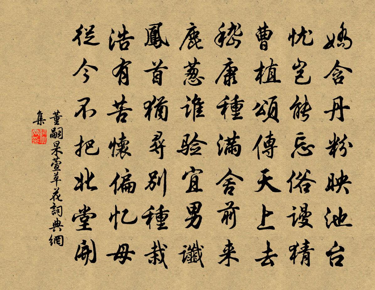 詩詞名句歷史字典書法欣賞書法字典國語詞典說文解字康熙字典古漢語字典標 題 作 者 詩 句 萱草花作者:董嗣杲 朝代:宋代萱草花原文嬌含丹粉映池台,憂豈能忘俗謾猜。曹植頌傳天上去,嵇康種滿舍前來。鹿蔥誰驗宜男讖,鳳首猶尋別種栽。浩有苦懷偏憶母,從今不把北堂開。詩詞問答問:萱草花的作者是誰?答:董嗣杲問:萱草花寫於哪個朝代?答:宋代董嗣杲萱草花書法欣賞萱草花書法作品詩詞推薦金剛隨機無盡頌一相無相分第九釋印肅〔宋代〕離欲心無苦,藥病皆拈卻。眼耳有觀音,豈用安手腳。題風雨樓顧逢〔宋代〕湖上晴看好,雨中猶更奇。無窮憑檻趣,正是捲簾時。鷗鷺飛相失,山林晚不知。煙雲多變態,難畫亦難詩。清平樂晏幾道〔宋代〕可憐嬌小,掌上承恩早。把鏡不知人易老,欲占朱顏長好。畫堂秋月佳期,藏鉤賭酒歸遲。紅燭淚前低語,綠箋花松棚陸游〔宋代〕松棚尋丈地,客至共開顏。堪笑杜陵老,坐思千萬間。游上天竺魏了翁〔宋代〕風波滿平地,世路繞羊腸。忽欲逃塵綱,遙登選佛場。雲深午猶暝,竹密夏生涼。興逸忘歸去,高眠借石床。送李舍人攜家歸江東覲省韓翃〔唐代〕二十青宮吏,成名似者稀。承顏陸郎去,攜手謝娘歸。夜月回孤燭,秋風試袷衣。扁舟楚水上,來往速如飛。題山居十絕平遠胡仲弓〔宋代〕萬里江山萬里天,沙平雁落遠相連。西風吹斷雲衣細,一葉飛不是釣船。非酒雍陶〔唐代〕人人慢說酒消憂,我道翻為引恨由。一夜醒來燈火暗,不應愁事亦成愁。浣溪沙 姜女廟納蘭性德〔清代〕海色殘陽影斷霓,寒濤日夜女郎祠。翠鈿塵網上蛛絲。澄海樓高空極目,望夫石在且留題。六王如夢祖龍非。題趙團練畫江乾晚景四絕秦觀〔宋代〕鳥外雲峰晚,沙頭草樹晴。想初揮灑就,侍女一齊驚。挽馬樞密母段氏許月卿〔宋代〕松罔新植瀧豐碑,千古哀榮誰似之。訓子斷機霜雪冷,退朝猶績月星戥。綠衣西府梅花落,素幄北堂萱草萎。何惜已亥雜詩 105龔自珍〔清代〕生還重喜酹金焦,江上騷魂亦可招。隔岸故人如未死,清樽讀曲是明朝。寄清曠兄弟鄧深〔宋代〕一別春三見,相思是幾回。自離夔府後,已過岳陽來。寒食還虛度,酴醾幸晚開。到時猶可及,應得共銜杯。侍讀給事王公輓辭三首蘇頌〔宋代〕禁序方尊寵,雍容侍紫宸。忽驚疇昔夢,遂失老成人。史稿留天閣,銘旌去國闉。龍門賓友散,揮涕想遺塵。陪尹子漸申安禮宿香山寺蔡襄〔宋代〕二月已強半,尋春登石樓。山光侵雨變,草色到雲休。歸鳥沈岩際,行人過樹頭。剝苔看石碣,因火認漁舟。漸夜遷學王洋〔宋代〕闕里荊榛一掃除,文明猶是舊規模。要令多士充庭賦,能識邦君此意無。十四日至節方回〔宋代〕錢塘多少富豪家,酒肉如山賞物華。野老入城□□□,□蘿蔔菜臘梅花。黃澄伯下第以詩來訪次韻陶夢桂〔宋代〕平塘水外竹三畝,古木陰中屋數間。天幸諸賢皆大用,分甘少病比長閒。百年世事皆前定,一枕清負無後艱。多謝太常樂章三十首其十四亞獻終獻送神並奏理安楊億〔宋代〕神之來兮風肅然,神之去兮升九天。排凌競兮還恍惚,羽旒紛兮蕭燔煙。久雨嘆曹彥約〔宋代〕誰為戎首起邊功,萬里生靈一擲中。天為憂之連作雨,人無識者驟歌風。所期壁地今城守,不善因糧卻火攻。古道名句推薦首夏猶清和,芳草亦未歇。謝靈運《游赤石進帆海》 一家之計在於和,一生之計在於勤。佚名《增廣賢文·上集》 霜威出塞早,雲色渡河秋。李白《太原早秋》 不茶不飯,不言不語,一味供他憔悴。蜀妓《鵲橋仙·說盟說誓》 獨有宦遊人,偏驚物候新。杜審言《和晉陵陸丞早春遊望》 遙憐故園菊,應傍戰場開。岑參《行軍九日思長安故園》 花謝花飛花滿天,紅消香斷有誰憐。曹雪芹《紅樓夢·第二十七回》 菡萏香連十頃陂,小姑貪戲採蓮遲。皇甫松《採蓮子·菡萏香蓮十頃陂》 舍其所爭,取其所棄,不亦君子乎?王通《中說·卷四·事君篇》 莫道讒言如浪深,莫言遷客似沙沉。劉禹錫《浪淘沙九首》