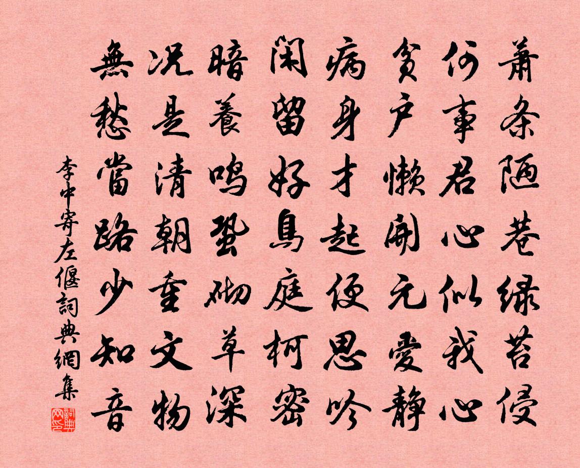 詩詞名句歷史字典書法欣賞書法字典國語詞典說文解字康熙字典古漢語字典標 題 作 者 詩 句 寄左偃作者:李中 朝代:唐代寄左偃原文蕭條陋巷綠苔侵,何事君心似我心。貧戶懶開元愛靜,病身才起便思吟。閒留好鳥庭柯密,暗養鳴蛩砌草深。況是清朝重文物,無愁當路少知音。詩詞問答問:寄左偃的作者是誰?答:李中問:寄左偃寫於哪個朝代?答:唐代李中寄左偃書法欣賞寄左偃書法作品注釋全唐詩:卷747-55詩詞推薦送劉坰登第赴調二首項安世〔宋代〕我老愚難改,年深病不瘳。鄉閭仗不雋,科甲慰窮愁。拾芥雖堪喜,看花且莫留。歸來修遠業,可以張吾州。芙蓉盛開,戲簡子文、克信楊萬里〔宋代〕芙蓉得雨一齊開,開盡秋花客不來。到得客來花已老,晚妝猶可兩三杯。句方翥〔宋代〕無端正踏江南路,暮雪蕭騷滿客衣。自題讀書堂周匡物〔唐代〕窗外捲簾侵碧落,檻前敲竹響青冥。黃昏不欲留人宿,雲起風生龍虎醒。行香子黃孝邁〔宋代〕一春花下,幽恨重重。又愁晴,又愁雨,又愁風。自述九首錢時〔宋代〕山翁何處是便宜,正是吟邊得句時。長向昇平風露裹,滿天和氣屬吾詩。送劉薄秩滿東歸劉宰〔宋代〕一官簿領十年間,此去青雲手可攀。勝日西湖浮畫舫,頻將卮酒酹孤山。青蛙辭陳普〔宋代〕古祠一區環槐榆,飛鼪在瓦狐樹居。鐵爐缺裂死灰冷,箕坐一寸青蟾蜍。平心定氣詳其來,頹垣古廁濁水渠。蛇驚孫季蕃死諸朝士葬之於西湖之上戴復古〔宋代〕卜宅西湖上,花翁死亦榮。詼諧老方朔,曠達醉淵明。風月生前夢,歌詩身後名。風流不可見,腸斷玉簫聲。永州城南一士夫家可愛李曾伯〔宋代〕二水城南路,誰人處士家。不為軒冕累,盡洗市廛華。庭立竹千個,牆留梅數花。吾廬歸未得,對此重咨嗟。洞庭湖君山頌呂岩〔唐代〕午夜君山玩月回,西鄰小圃碧蓮開。天香風露蒼華冷,雲在青霄鶴未來。文公書廚惠我光明陳普〔宋代〕釋我矜傳燈,老莊抱生白。自言摩尼珠,誰知黑如漆。荀楊不識性,依舊如夜行。萬世真日月,四書與五經。贈蘇十三中丞薛濤〔唐代〕洛陽陌上埋輪氣,欲逐秋空擊隼飛。今日芝泥檢征詔,別須台外振霜威。哭趙吏部胡仲弓〔宋代〕篇詩曾送恥齋行,豈料存亡隔此生。早控危衷敷鯁論,晚留遺愛在羊城。惜無金輅封同性,空有玉棺歸九京。篋笥送中甫兄之淮南韓元吉〔宋代〕老憶親朋別,貧知客寓愁。青燈耿遙夜,濁酒對窮秋。寒日催征騎,新霜倚縣樓。因君問淝水,莫渡北來舟。偈頌一百六十首釋宗杲〔宋代〕無邊剎境,自他不隔於毫端。十世古今,始終不離於當念。丈夫自有沖天志,休向如來行處行。西江月馬鈺〔元代〕大道都來六字。自然清靜無為。有人依得合希夷。視聽何須眼耳。清靜內容歡喜。無為功就神飛。自然雲步赴瑤池度秦嶺張舜民〔宋代〕 * 去中山,春盡抵馮翊。閏晦適石城,發軫蒙再謫。有姪佐晉陰,所幸在肘腋。兒女本天愛,未免各分北。同行登城歌張鎡〔宋代〕二月二十八,花開滿林鶯恰恰。春光誰遣插翅飛,雪 * 知添鬢髮。暄風隨我登古城,遠樹如簇山如縈。一川渺瀰醜婦吟胡仲參〔宋代〕君不見漢殿丹青未漫滅,馬上琵琶向誰說。又不見華清舞破霓裳衣,凌波竟墮嵬山血。從來艷色多累身,妾貌雖醜名句推薦習俗移志,安久移質。荀子《荀子·儒效》 宮衣亦有名,端午被恩榮。杜甫《端午日賜衣》 人有不為也,而後可以有為。孟子《孟子·離婁章句下·第八節》 江上旗亭,送君還是逢君處吳大有《點絳唇·送李琴泉》 落葉委埏側,枯荄帶墳隅。潘安《悼亡詩三首》 其進銳者,其退速。孟子《孟子·盡心章句上·第四十四節》 因依老宿發心初,半學修心半讀書。王建《寄舊山僧》 非我而當者,吾師也;是我而當者,吾友也。荀子《荀子·修身》 月既不解飲,影徒隨我身。李白《月下獨酌四首·其一》 若待上林花似錦,出門俱是看花人。楊巨源《城東早春》