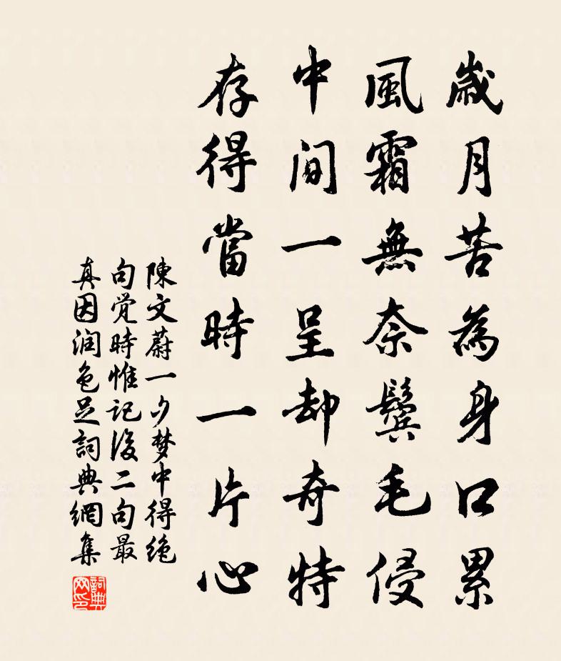 詩詞名句歷史字典書法欣賞書法字典國語詞典說文解字康熙字典古漢語字典標 題 作 者 詩 句 一夕夢中得絕句覺時惟記後二句最真因潤色足作者:陳文蔚 朝代:宋代原文歲月苦為身口累,風霜無奈鬢毛侵。中間一呈卻奇特,存得當時一片心。詩詞問答問:《一夕夢中得絕句覺時惟記後二句最真因潤色足》的作者是誰?答:陳文蔚問:該詩寫於哪個朝代?答:宋代書法欣賞一夕夢中得絕句覺時惟記後二句最真因潤色足書法作品詩文賞析【原題】:一夕夢中得絕句覺時惟記後二句最真因潤色足成之詩詞推薦挽別大參二首李曾伯〔宋代〕幾歷藩垣一節勤,歸來兩地會風雲。調知白雪陽春別,香到黃花晚節聞。夷鍬猶知問中立,朝廷惜竟老希文。台躔柳釋紹嵩〔宋代〕江頭楊柳麴塵姿,斜壓漁家短短籬。日暖遊絲飛絮落,和風得路合偏吹。句王欽若〔宋代〕須知堯歷初釐正,玉燭初從獻歲來。玩丹砂 本名浣溪沙,贊師叔玉蟾普明澄寂和馬鈺〔元代〕朴住虛無撮住空。豈分南北與西東。丹砂只在笑談中。性命不由天地管,一聲珍重別山侗。羽輪飈駕赴蓬宮。次韻子瞻對月見憶並簡崔度蘇轍〔宋代〕先師客陳未嘗飽,弟子於今敢言巧。敗牆破屋秋雨多,夜視 * 過畢昴。齏鹽冷落空杯盤,且依道士修還丹。丹田謁金門(送康伯檜)張元乾〔宋代〕清光溢。影轉畫檐涼入。風露一天星斗濕。無雲天更碧。滿引送君何惜。記取吾曹今夕。目斷秋江君到日。潮來風雲門過何山陸游〔宋代〕漠漠稻滿陂,蒙蒙雨沾衣。林花落更新,溪鳥止復飛。我作山中行,十日未擬歸。思酒過野店,念茶叩僧扉,眠枕次韻潘都乾水晶菊二首項安世〔宋代〕幕中安得野人園,種此晶熒白玉丹。冷淡雖無九春分,風流還得一冬看。銀杯共色深宜酒,紙帳圍香木怕寒。只向賦得攜手上河梁應詔詩江總〔隋代〕早秋天氣涼。分手關山長。雲愁數處黑。木落幾枝黃。鳥歸猶識路。流去不知鄉。秦川心斷絕。何悟是河梁。題邢惇夫扇黃庭堅〔宋代〕黃葉委庭觀九州,小蟲催女獻功裘。金錢滿地無人費,百斛明珠薏苡秋。琴曲歌辭。湘夫人李頎〔唐代〕九嶷日已暮,三湘雲復愁。窅藹羅袂色,潺湲江水流。佳期來北渚,捐玦在芳洲。和李果州同游茅山贈劉宰〔宋代〕我家荊溪東,矮屋 * 間。石田人不耕,自占水一灣。十年去城市,樂此清晝閒。飽聞西州英,奧學窺孔顏。見賢沁園春嚴羽〔宋代〕問訊溪莊,景如之何,吾為平章。自月湖不見,江山零落,驪塘去後,煙月淒涼。有老先生,如梅峰者,健筆縱橫偶書歐陽修〔宋代〕吾見陶靖節,愛酒又愛閒。二者人所欲,不問愚與賢。柰何古今人,遂此樂尤難。飲酒或時有,得閒何鮮焉。浮屠題四面雲山亭子乾隆〔清代〕四柱構峰巔,松蘿作扉闥。詰曲頻攀躋,造極心乃豁。一覽眾山小,左挹雲容活。鶴唳與鹿呦,饒伊相問答。見二十弟倡和花字漫興五首黃庭堅〔宋代〕官駝鳴鐸逐鹽車,只見風塵不見花。空作江南江北夢,辛夷躑躅倚山茶。匹鳥曲楊維楨〔元代〕建章宮中匹瓦飛,太液浮起雙紅衣。文塘小逕迎春歸,春紅蓮葉春猗猗。金丸嬌郎故驚起,白頭雙飛誓雙死。上林薛子舒墓葉適〔宋代〕悒悒西門路,樵歌占晚雲。燐迷王弼宅,蒿長孟郊墳。少病憐醫錯,題書與父分。又言重把筆,兼欲使余聞。憶秦娥陸游〔宋代〕玉花驄。晚街金轡聲璁瓏。聲璁瓏。閒敧烏帽,又過城東。富春巷陌花重重。千金沽酒酬春風。酬春風。笙歌圍里雨中宿靈峰寺陳與義〔宋代〕雁盪山中逢晚雨,靈峰寺里借繩床。只應護得綸巾角,還費高僧一炷香。名句推薦暗教愁損蘭成,可憐夜夜關情張炎《清平樂·候蛩淒斷》 陌上風光濃處。第一寒梅先吐。李彌遜《十樣花·陌上風光濃處》 世態便如翻覆雨,妾身元是分明月。文天祥《滿江紅·和王夫人滿江紅韻以庶幾後山妾薄命之意》 我心匪石,不可轉也。佚名《柏舟》 淚濕羅巾夢不成,夜深前殿按歌聲。白居易《後宮詞》 夫將者,人命之所縣也,成敗之所系也,禍福之所倚也。諸葛亮《將苑·卷二·假權》 亦余心之所善兮,雖九死其猶未悔。屈原《離騷》 明妃留在兩眉愁,萬古春山顰不盡元好問《玉樓春·驚沙獵獵風成陣》 一朵江梅春帶雪。玉軟雲嬌,姑射肌膚潔。趙鼎《蝶戀花·一朵江梅春帶雪》 樵人歸欲盡,煙鳥栖初定。孟浩然《宿業師山房期丁大不至 / 宿業師山房待丁大不至》