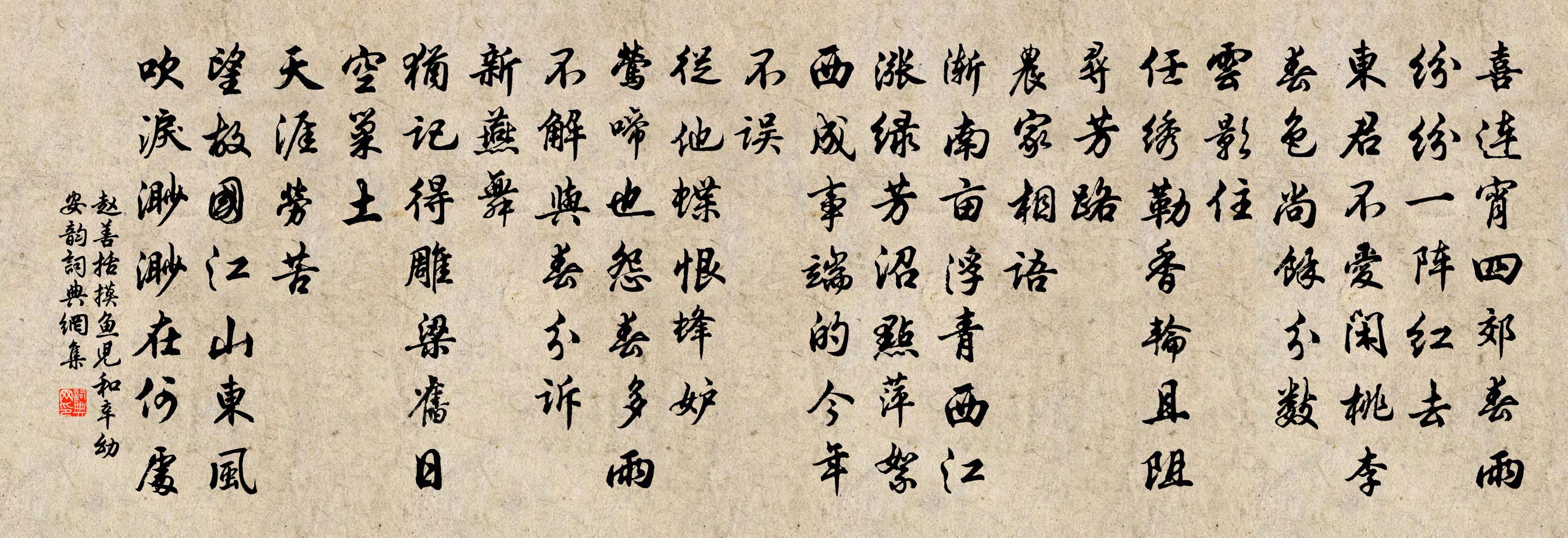 詩詞名句歷史字典書法欣賞書法字典國語詞典說文解字康熙字典古漢語字典標 題 作 者 詩 句 摸魚兒(和辛幼安韻)作者:趙善括 朝代:宋代摸魚兒(和辛幼安韻)原文喜連宵、四郊春雨。紛紛一陣紅去。東君不愛閒桃李,春色尚餘分數。雲影住。任繡勒香輪,且阻尋芳路。農家相語。漸南畝浮青,西江漲綠,芳沼點萍絮。西成事,端的今年不誤。從他蝶恨蜂妒。鶯啼也怨春多雨,不解與春分訴。新燕舞。猶記得、雕梁舊日空巢土。天涯勞苦。望故國江山,東風吹淚,渺渺在何處。詩詞問答問:摸魚兒(和辛幼安韻)的作者是誰?答:趙善括問:摸魚兒(和辛幼安韻)寫於哪個朝代?答:宋代問:摸魚兒(和辛幼安韻)是什麼體裁?答:詞趙善括摸魚兒(和辛幼安韻)書法欣賞摸魚兒(和辛幼安韻)書法作品詩詞推薦和黃雲甫韻陳普〔宋代〕志欲鑽研探三原,聖言爭奈遠如天。爬沙愧我遲而鈍,穿石輸君敏且專。方識立身須廣大,也知去道每輕儇。若將贈草庵禪師王禹偁〔宋代〕陽山山下草庵深,寂寂香燈對遠岑。莫怪相看總無語,坐禪為政一般心。送蜀客張祜〔唐代〕楚客去岷江,西南指天末。平生不達意,萬里船一發。行行三峽夜,十二峰頂月。哀猿別曾林,忽忽聲斷咽。嘉陵贈恭順皇后輓歌皇甫冉〔唐代〕徂謝年方久,哀榮事獨稀。雖殊百兩迓,同是九泉歸。詔使歸金策,神人送玉衣。空山竟不從,寧肯學湘妃。清心鏡 贈裴大器馬鈺〔元代〕修行人,要心善。奈業障相魔,裂他不轉。十二時、馬劣猿顛,沒巴避惡念。辦堅志,常鍛鍊。剿除絕跡,永無征和鄭國器六首曹勛〔宋代〕老境欣逢世路平,收回神觀遠逢迎。五更不復趨雙闕,六鑿都忘任七情。偈頌十八首釋師體〔宋代〕文殊三處度夏,彌勒一味放憨。善財走百十城,達磨九年面壁。恢闡拈花微笑,光揚布發掩泥。假中枉盧二十二書亦稱臥疾兼訝李二久不訪問…戲李二韋應物〔唐代〕微官何事勞趨走,服藥閒眠養不才。花里棋盤憎鳥污,枕邊書卷訝風開。故人問訊緣同病,芳月相思阻一杯。應笑金縷曲顧貞觀〔清代〕我亦飄零久!十年來,深恩負盡,死生師友。宿昔齊名非忝竊,只看杜陵窮瘦,曾不減,夜郎孱愁,薄命長辭知已送僧之華亭釋文珦〔宋代〕忽爾來相別,攜琴便出關。此行離日下,何事到雲間。郭外遙通海,舟前少見山。應思舊棲處,樵屋過秋閒。次韻李季章監簿泛湖樓鑰〔宋代〕仙舟共泛滄波去,且向蘇公堤下住。西風吹就芙蓉城,青鏡閒妝兩呈露。皇家家法崇儉素,宸心但欲乘商輅。離宮松江別詩盧祖皋〔宋代〕明月垂虹幾度秋,短蓬長是擊人愁。暮煙疏雨分攜地,更上松江百尺樓。歸庵王安石〔宋代〕稻畦藏水綠秧齊,松鬣初乾尚有泥。縱蹇尋岡歸獨臥,東庵殘夢午時雞。和總管姜知閣虞儔〔宋代〕五筆梅山漫不休,詩筒倏寄置書郵。分符我亦慚銅虎,問俗人誰忍佩牛。已洗圜扉亡久系,更教彩棒息群偷。年來秦虢夫人走馬圖二絕蘇轍〔宋代〕秦虢風流本一家,豐枝稼葉映雙花。欲分妍醜都無處,夾道遊人空嘆嗟。朱幀玉勒控飛龍,笑語喧譁步驟同。馳入生查子王予可〔元代〕夜色明河靜,好風來千里。水殿謫仙人,皓齒清歌起。前聲金中,後聲銀河底。一夜嶺頭雲,繞遍樓前水。辭世偈清溪沅禪〔宋代〕六十七年,無法可說。一片雲收,澄潭皎月。占巾子葉簡〔宋代〕近來好裹束,各自競尖新。稱無二三兩,因何號一斤。奉和襲美太湖詩二十首上真觀陸龜蒙〔唐代〕嘗聞升三清,真有上中下。官居乘佩服,一一自相亞。霄裙或霞粲,侍女忽玉奼。坐進金碧腴,去馳飆欻駕。今來到龍井寺鄭清之〔宋代〕竹門斜倚酒家簾,石路高低記水簾。炙背老農驚傴僂,乘肩痴女笑窺覘。數羝人立攀籬落,一蝶兒嬉掠繖檐。款約名句推薦江水漾西風,江花脫晚紅。王安石《江上》 一聲已動物皆靜,四座無言星欲稀。李頎《琴歌》 何謂享福之才,能讀書者便是;何謂創家之人,能教子者便是。王永彬《圍爐夜話·第一O四則》 如欲平治天下,當今之世,捨我其誰也。孟子《孟子·公孫丑章句下·第十三節》 桃李待日開,榮華照當年。李白《長歌行》 數回細寫愁仍破,萬顆勻圓訝許同杜甫《野人送朱櫻》 一張一弛,文武之道戴聖《禮記·雜記下》 富貴易生禍端,必忠厚謙恭,才無大患王永彬《圍爐夜話·第六三則》 冉冉年時暮,迢迢天路征。陸機《梁甫吟》 影孤憐夜永。永夜憐孤影。蘇軾《菩薩蠻·回文秋閨怨》