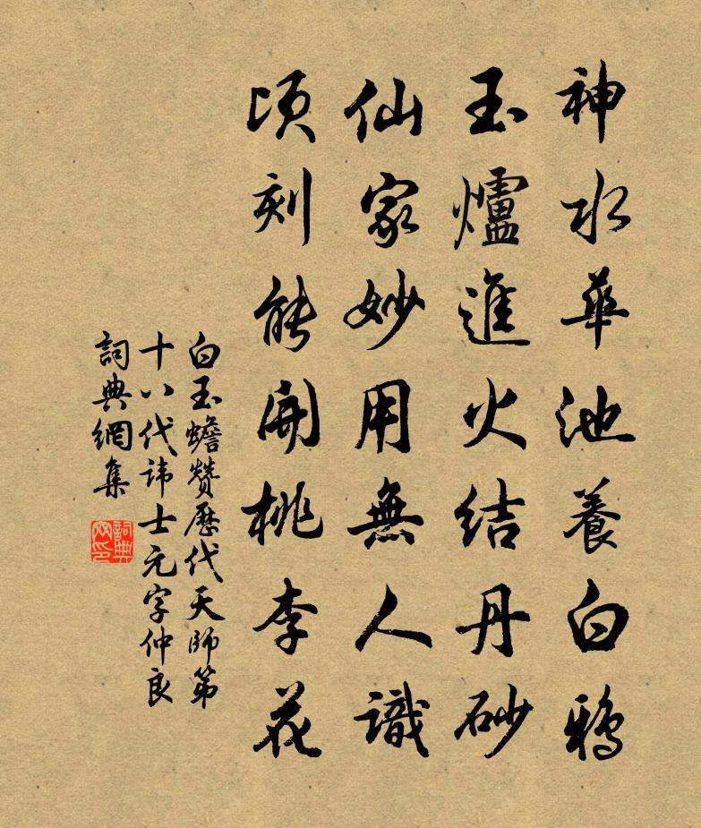 詩詞名句歷史字典書法欣賞書法字典國語詞典說文解字康熙字典古漢語字典標 題 作 者 詩 句 贊歷代天師第十八代諱士元字仲良作者:白玉蟾 朝代:宋代原文神水華池養白鴉,玉爐進火結丹砂。仙家妙用無人識,頃刻能開桃李花。詩詞問答問:《贊歷代天師第十八代諱士元字仲良》的作者是誰?答:白玉蟾問:該詩寫於哪個朝代?答:宋代問:該詩是什麼體裁?答:七絕書法欣賞贊歷代天師第十八代諱士元字仲良書法作品詩詞推薦奉送浙東德師侍御罷府西歸皮日休〔唐代〕建安才子太微仙,暫上金台許二年。形影欲歸溫室樹,夢魂猶傍越溪蓮。空將海月為京信,尚使樵風送酒船。從此挽楊真州母夫人二首劉宰〔宋代〕江頭千騎肅傅呼,五馬東來侍板輿。賸欲平反供母笑,不妨寬大奉君書。凝香堂上榮何限,戲彩圖中畫不如。底事將歸贈孟東野房蜀客(蜀客名次卿)韓愈〔唐代〕君門不可入,勢利互相推。借問讀書客,胡為在京師。舉頭未能對,閉眼聊自思。倏忽十七年,終朝苦寒飢。宦途句王遇〔宋代〕不知何處雨,已覺此間涼。送范西叔教授西歸張栻〔宋代〕乃祖至和間,忠謀書鼎彝。但知陛下聖,豈知吾言危。元佑愛君語,讀者猶涕洟。典刑今不亡,盛德故在茲。歲晚江城子元好問〔金代〕河堤煙樹渺雲沙。七香車。更天涯。萬古千秋,幽恨入琵琶。想到都門南下望,金縷暗,玉釵斜。津橋春水浸紅霞秋郊有懷陸游〔宋代〕檐頭買雙兔,市店取斗酒;還家掃北窗,歡言酌親友。家貧氣未餒,禮薄情更厚。高吟金石裂,健筆龍蛇走。酒闌不睡文天祥〔宋代〕頻搔白首強憂煎,細雨青燈思欲顛。南北東西三萬里,古今上下幾千年。只因知事翻成惱,未到放心那得眠。眼不送陸渾主簿趙宗儒之任姚系〔唐代〕山中眇然意,此意乃平生。常日望鳴皋,遙對洛陽城。故人吏為隱,懷此若蓬瀛。夕氣冒岩上,晨流瀉岸明。存亡成都遨樂詩二十一首寒食出城田況〔宋代〕郊外融和景,濃於城市中。歌聲留客醉,花意盡春紅。遊人一何樂,歸馭莫怱怱。頌古一○一首釋子淳〔宋代〕父子相逢眼倍明,靈苗叢里坦然行。箇中若為金毛子,已是監梅觸大羹。跋簡齋二帖陳造〔宋代〕夜光一百八十七,有底六丁忘下收。密勿端知紫皇側,鎮榱猶計子孫謀。牛背雙鸜鵒梅堯臣〔宋代〕牛背雙鸜鵒,煙陂共入時。草枯行解美,日晚趁群遲。閒載寧辭遠,相鳴不間雌。初驚牧人去,飛上野桑枝。句陸暢〔唐代〕蜀道易,易於履平地。蟬噪入雲樹,風開無主花。高宗郊前朝獻景靈宮二十一首真宗〔宋代〕帝既臨饗,聲茲精意。對越在天,爰升紫陛。孔容翼翼,保承丕緒。孝奉天們,永錫爾類。雜題十首劉克莊〔宋代〕雞絮交懽遠,琵琶寄恨深。早知胡地冷,永巷亦甘心。扶胥三首劉克莊〔宋代〕暘谷扶桑指顧間,馮夷得得報平安。為言博望乘槎至,莫作師襄擊磬看。並游梅堯臣〔宋代〕並出慚羸駕,康衢懶著鞭。蹇驢能勝馬,擘道去如煙。何用嗟遲疾,從來有後先。所期皆一至,我到爾應還。雜詩李復〔宋代〕先王急民事,分吏察壠畝。田荒宅 * ,置法責粟布。壤壤一歲勤,暴暴三年聚。農政久不修,幾家有禾黍。歸故園朱慶餘〔唐代〕桑柘駢闐數畝間,門前五柳正堪攀。尊中美酒長須滿,身外浮名總是閒。竹徑有時風為掃,柴門無事日常關。於焉名句推薦傷心橋下春波綠,曾是驚鴻照影來。陸游《沈園二首》 聖人不責人無過,唯多方誘之改過,庶人心可回也。王永彬《圍爐夜話·第二四則》 牆外行人,牆裡佳人笑。蘇軾《蝶戀花·春景》 雄州霧列,俊采星馳。王勃《滕王閣序》 凡治天下,必因人情。韓非及後人《韓非子·八經》 人間更有風濤險,翻說黃河是畏途。宋琬《渡黃河》 人煙寒橘柚,秋色老梧桐。李白《秋登宣城謝朓北樓》 男兒不展風雲志,空負天生八尺軀。馮夢龍《警世通言·卷四十》 憶昔霍將軍,連年此征討。高適《登百丈峰二首》 不覺碧山暮,秋雲暗幾重。李白《聽蜀僧濬彈琴 / 聽蜀僧浚彈琴》
