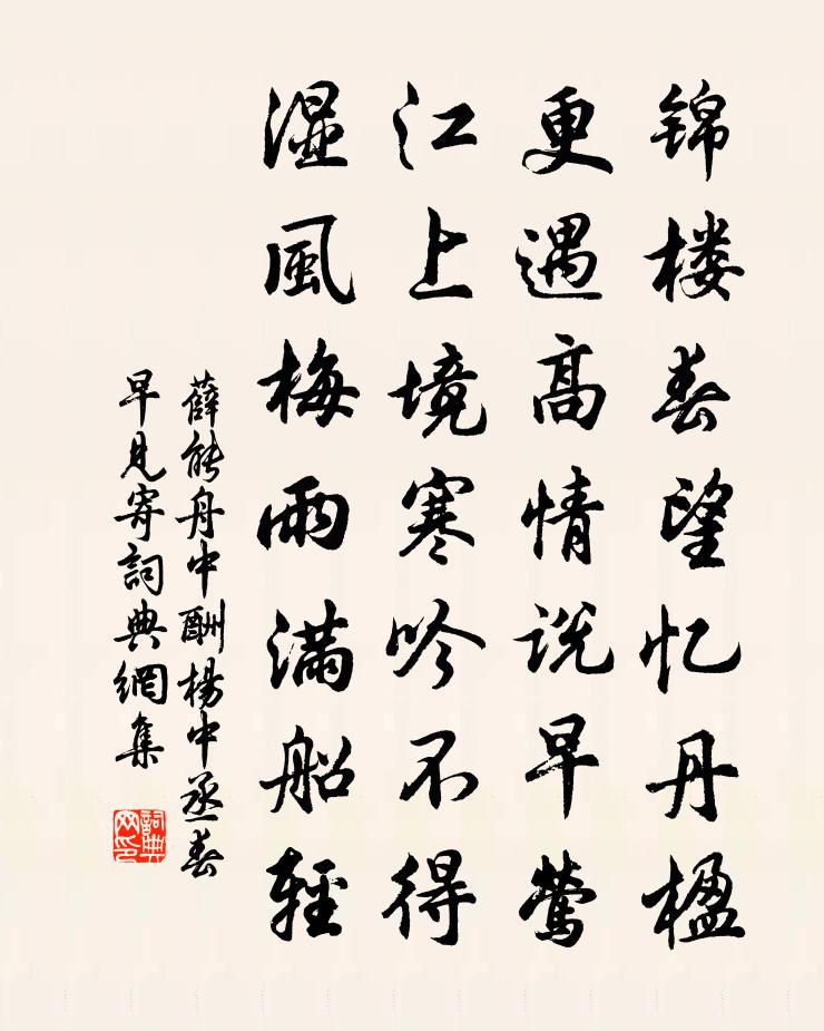 詩詞名句歷史字典書法欣賞書法字典國語詞典說文解字康熙字典古漢語字典標 題 作 者 詩 句 舟中酬楊中丞春早見寄作者:薛能 朝代:唐代舟中酬楊中丞春早見寄原文錦樓春望憶丹楹,更遇高情說早鶯。江上境寒吟不得,濕風梅雨滿船輕。詩詞問答問:舟中酬楊中丞春早見寄的作者是誰?答:薛能問:舟中酬楊中丞春早見寄寫於哪個朝代?答:唐代問:舟中酬楊中丞春早見寄是什麼體裁?答:七絕薛能舟中酬楊中丞春早見寄書法欣賞舟中酬楊中丞春早見寄書法作品注釋全唐詩:卷561-47詩詞推薦和孫廷平坦嵩山十首漁舟火韓維〔宋代〕拖網潭上歸,孤煙出峰背。稍沒寒霧中,微明秋雨外。起我江湖心,鱸魚方可膾。偈頌一百六十首釋宗杲〔宋代〕細不通風,大通車馬。突出當陽,孰辨真假。虛空{左木右覇}柄。無手人能把。破驢蹋倒摘茶輪,草庵卸下瑠璃夜飛鵲慢盧祖皋〔宋代〕驕嘶破清曉,分恨臨期。花下恁月明知。餘光是處散離思,最憐香靄霏霏。牽衣搵彈淚,問淒風愁露,劃地東西。瑞鶴仙(和丁基仲)佚名〔宋代〕畫樓簾卷翠。正柳約東風,搖盪東霽。緗桃雨才洗。似妝臨寶鏡。脂凝鉛水,雲遍髻子。墜釵梁、羞看燕壘。最堪別徐商老奉祠歸清江五首彭龜年〔宋代〕我歸不能休,公去不可挽。依依原隰間,相對意無限。贈端上人李覯〔宋代〕佛法本無二,誰論律與禪。水行到處入,月出有時圓。事去可嘗念,忙中不廢眠。松堂白日永,幡影自飄然。賀新郎(端午和前韻)勿翁〔宋代〕庭外瀟瀟雨。對空山、再度端陽,悄無情緒。舊日文君今瘦損,尋舊曲、不成腔譜。更不周郎回顧。尚喜庭萱春未那日獲詣芳園竊見新栽叢竹蕭然可愛不能無詩李至〔宋代〕節節皆勻葉葉疏,相門翻似子猷居。狂根或帶移時土,細草應勞種後鋤。醒酒韻寒初愜意,出牆梢健已凌虛。不須和傅粹梅岩之什梅開陳宓〔宋代〕人間飛葉送殘年,籬落逢春此地先。雖有柴門無鏁鑰,唐時竹洞豈其然。長相思胡翼龍〔宋代〕南山鍾。北山鍾。一聽鐘聲百念空。古今昏曉中。望秋風。數秋風。等得秋來等過鴻。燈前書一封。和秀卿梅二首張明中〔宋代〕月中仙子解征驂,不是株林見夏南。松竹不凋霜後翠,玉肌得共歲寒三。鵲踏枝/蝶戀花歐陽修〔宋代〕一曲尊前開畫扇。暫近還遙,不語仍低面。直至情多緣少見。千金不直雙回眄。苦恨行雲容易散。過盡佳期,爭向綠萼梅蘇泂〔宋代〕水仙分御六銖衣,雲作中單翠作蕤。占斷芳園無兩樹,月明倒影浸愁漪。後園桃李花梅堯臣〔宋代〕後園桃李花,灼灼復皎皎。南枝開已繁,北枝縈尚少。蘤萼相輝映,根本自鉤繞。無為驚風吹,紛紛逐飛鳥。偶倚柴隨亨〔宋代〕西風獨憑闌乾處,可是愁中鬢易華。老木不生秋後葉,孤燈空結夜來花。中原落日無歸雁,故國青山有去鴉。欲向答高博士詩何遜〔南北朝〕北窗涼夏首。幽居多卉木。飛蜨弄晚花。清池映疏竹。為宴得快性。安閒聊鼓腹。將子厭囂塵。就予開耳目。寄從兄遵韋莊〔唐代〕江上秋風正釣鱸,九重天子夢翹車。不將高臥邀劉主,自吐清談護漢儲。滄海十年龍景斷,碧雲千里雁行疏。相逢奉和過舊宅應制許敬宗〔唐代〕飛雲臨紫極,出震表青光。自爾家寰海,今茲返帝鄉。情深感代國,樂甚宴譙方。白水浮佳氣,黃星聚太常。岐鳳魚遊春水張元乾〔宋代〕芳洲生萍芷。宿雨收晴浮暖翠。煙光如洗,幾片段預告飛點淚。清鏡空餘白髮添,新恨誰傳紅綾寄。溪漲岸痕,浪吞沙金丹詩四十八首張繼先〔宋代〕忍辱多多日苦辛,閉門又被鬼 * 。不知牢鎖丹田固,爭奈魂狂紫府傾。陽氣旋衰難保壽,陰邪浸長易消兵。勸君名句推薦林外鳴鳩春雨歇,屋頭初日杏花繁。歐陽修《田家》 以五十步笑百步。孟子《孟子·梁惠王章句上·第三節》 尊前故人如在,想念我、最關情。周邦彥《綺寮怨·上馬人扶殘醉》 成事不說,遂事不諫,既往不咎。孔子弟子《論語·八佾篇》 雪雲散盡,放曉晴池院。楊柳於人便青眼。李元膺《洞仙歌·雪雲散盡》 欹枕數秋天,蟾蜍下早弦。納蘭性德《菩薩蠻·蕭蕭幾葉風兼雨》 筆落驚風雨,書成泣鬼神。馮夢龍《醒世恆言·卷二十一》 閒倚博山長嘆,淚流沾皓腕。韋莊《歸國遙·春欲晚》 西風稍急喧窗竹,停又續,膩臉懸雙玉。閻選《河傳·秋雨》 好名羈行,重利無虧。來俊臣《羅織經·保身卷第七》