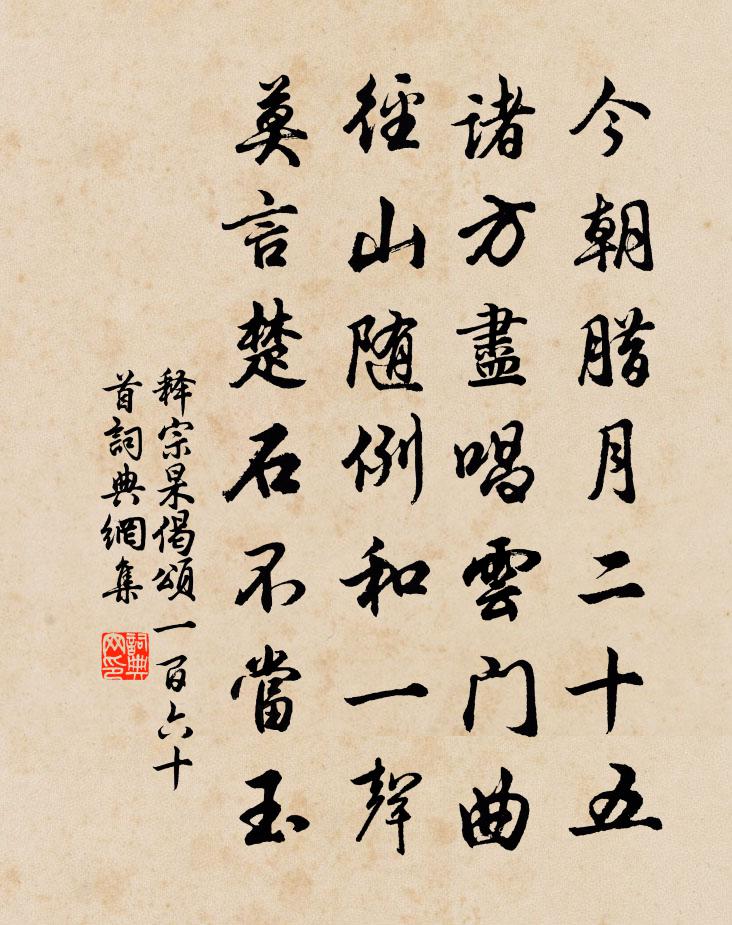 詩詞名句歷史字典書法欣賞書法字典國語詞典說文解字康熙字典古漢語字典標 題 作 者 詩 句 偈頌一百六十首作者:釋宗杲 朝代:宋代偈頌一百六十首原文今朝臘月二十五,諸方盡唱雲門曲。徑山隨例和一聲,莫言楚石不當玉。詩詞問答問:偈頌一百六十首的作者是誰?答:釋宗杲問:偈頌一百六十首寫於哪個朝代?答:宋代釋宗杲偈頌一百六十首書法欣賞偈頌一百六十首書法作品詩詞推薦越調 鬥鵪鶉王實甫〔元代〕閒對著綠樹青山,消遣我煩心倦目。潛入那水國漁鄉,早跳出龍潭虎窟。披著領箬笠蓑衣,堤防他斜風細雨。長則寓嘆陸游〔宋代〕五畝煙蕪過半生,還山自笑又躬耕。舂炊不繼兒啼飯,烹飪無方客絮羹。遊宦人間身愈困,讀書燈下目幾盲。退之齊天樂姜夔〔宋代〕庾郎先自吟愁賦。淒淒更聞私語。露濕銅鋪,苔侵石井,都是曾聽伊處。哀音似訴。正思婦無眠,起尋機杼。曲曲題曹溪祖師堂貫休〔唐代〕皎潔曹溪月,嵯峨七寶林。空傳智藥記,豈見祖禪心。信衣非苧麻,白雲無知音。大哉雙峰溪,萬古青沈沈。題僧畫草蟲釋師範〔宋代〕似則似矣,是則未是。若是伶俐衲僧,不作這般蟲豸。頌古釋慧空〔宋代〕不是風兮不是幡,祖師端的廣南蠻。夜深趁得曹溪渡,失卻番禺兩岸山。長至日上公獻壽張叔良〔唐代〕鳳闕晴鍾動,雞人曉漏長。九重初啟鑰,三事正稱觴。日至龍顏近,天旋聖歷昌。休光連雪淨,瑞氣雜爐香。化被病臥陸游〔宋代〕蕭條風雨又經旬,病臥真成不覿鄰。跨馬難酬四方誌,耽書空盡百年身。碧花引蔓緣疏竹,黃雀呼群啄破囷。君見晚春戴復古〔宋代〕春來涉幾日,又到落花時。老面羞看鏡,愁懷強作詩。雨牆蝸篆古,風樹鳥巢危。有客適相過,樽前一局橫。送黃仲委秉少卿知瀘州二首楊萬里〔宋代〕澧澦方如象,余皇底似飛。相將剌天去,收拾大名歸。西掖桐陰靜,瀘南荔子肥。未應經世具,便欲閉山扉。堠子辭楊維楨〔元代〕堠子個個復個個,十里五里官道課。行人捷逕行,不從官道過。吁嗟堠旁歧轉多,堠子荊棘如銅駝。抒懷張蠙〔唐代〕幾齣東堂謝不才,便甘閒望故山回。翻思未是離家久,更有人從外國來。觀承光殿玉瓮再作歌乾隆〔清代〕元史世祖至元間,初成瀆山大玉海,敕置廣寒碧殿中,逮今五百有餘載。青綠間以黑白章,雲濤水物相低昂,五山留別李貫之大著二首程公許〔宋代〕車馬紅塵里,閱人誰似君。洚流傾世論,砥柱倚斯文。籍甚詩書譽,超然利慾醺。相從期歲晚,蘭佩襲芳熏。擬陶馮坦〔宋代〕茅檐人幽徑,風雨聊可棲。喜無車馬喧,而有耒耜隨。南華書事詩朱翌〔宋代〕真覺止能留一宿,桐鄉今已在連宵。卻將膏雨下山去,聊助南溟早晚潮。即覺庵子中居士來訪妙峰之西既去作六言五首釋正覺〔宋代〕欲下前時雪磴,重開向日風翎。此去丁寧華鳥,莫來狼藉春庭。和林治中雪詩五首鄭清之〔宋代〕兒嬉怨東搦文貔,怒眥張唇狀崛奇。圖得形模規婦笑,絕憐冷落賦翁詩。幕談多暇堪娛目,喜色排寒為上眉。頗念高士詠混元皇帝吳筠〔唐代〕玄元九仙主,道冠三氣初。應物方佐命,棲真亦歸居。貽篇訓終古,駕景還太虛。孔父嘆猶龍,誰能知所如。月夜梧桐葉上見寒露戴察〔唐代〕蕭疏桐葉上,月白露初團。滴瀝清光滿,熒煌素彩寒。風搖愁玉墜,枝動惜珠乾。氣冷疑秋晚,聲微覺夜闌。凝空名句推薦爾來從軍天漢濱,南山曉雪玉嶙峋。陸游《金錯刀行》 在上不驕,高而不危;制節謹度,滿而不溢。孔子及其弟子《孝經·諸侯》 望君煙水闊,揮手淚沾巾。劉長卿《餞別王十一南遊》 智者不危眾以舉事,仁者不違義以要功。范曄《後漢書·列傳·竇融列傳》 桐葉晨飄蛩夜語。旅思秋光,黯黯長安路。陸游《蝶戀花·桐葉晨飄蛩夜語》 花意爭春,先出歲寒枝。辛棄疾《江神子·賦梅寄余叔良》 靈山多秀色,空水共氤氳。張九齡《湖口望廬山瀑布泉 / 湖口望廬山瀑布水》 未晚先投宿,雞鳴早看天。佚名《增廣賢文·上集》 關城榆葉早疏黃,日暮雲沙古戰場。王昌齡《從軍行七首》 君子愛財,取之有道。佚名《增廣賢文·上集》