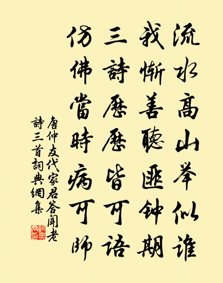 詩詞名句歷史字典書法欣賞書法字典國語詞典說文解字康熙字典古漢語字典標 題 作 者 詩 句 代家君答聞老詩三首作者:唐仲友 朝代:宋代代家君答聞老詩三首原文流水高山舉似誰,我慚善聽匪鍾期。三詩歷歷皆可語,仿佛當時病可師。詩詞問答問:代家君答聞老詩三首的作者是誰?答:唐仲友問:代家君答聞老詩三首寫於哪個朝代?答:宋代唐仲友代家君答聞老詩三首書法欣賞代家君答聞老詩三首書法作品詩詞推薦恩賜龜紫陸游〔宋代〕已掛朝衣神武門,暫紆紫綬拜君恩。兒孫賀罷還無事,雨笠煙蓑自灌園。晚春書懷簡陳巽叔二首王炎〔宋代〕花片已零落,綠陰遮短牆。園蔬春筍長,官酒臘醅香。揮麈故人少,杜門閒日長。不妨時過我,談笑倚繩床。水次蘚花梅堯臣〔宋代〕秋日日霏霏,碧花生疊疊。水邊有神女,妝去遺翠靨。岸側小家婦,不知所宜愜。未得未還人,自將渾面帖。用前韻改一二語自釋方回〔宋代〕南寒稍近折綿天,葵薺爭承小雨憐。凍合遠峰應有雪,炊殘荒市更無煙。未妨夜畫爐中箸,何苦晨呵袖裡鞭。人事晚入汴水崔顥〔唐代〕昨晚南行楚,今朝北溯河。客愁能幾日?鄉路漸無多。晴景搖津樹,春風起棹歌。長淮亦已盡,寧復畏潮波。臨江仙 對花懷洛陽舊遊元好問〔金代〕紫玉雙華相照映,錦兒仍是瓊兒。天邊誰與慰相思。洗妝無別物,只有斷腸詩。水北水南渾一夢,眼中紅袖烏絲。句劉申〔宋代〕一川帶繞三平島,萬巘環趨兩翠巒。春吟四絕張榘〔宋代〕花露半乾紅入戶,竹風微動綠侵床。翠屏殘夢不知處,幽鳥數聲春日長。偈頌一百零二首釋慧遠〔宋代〕新羅國裹打齋鍾,穩泛靈槎到月宮。仙侶不知何處去,秋聲依舊著梧桐。最高樓(春恨)毛滂〔宋代〕新睡起,熏過繡羅衣。梳洗了,百般宜。東風淡盪垂楊院,一春心事有誰知。苦留人,嬌不盡,曲眉低。漫良夜、送蔡十二之海上(時在衛中)高適〔唐代〕黯然何所為,相對但悲酸。季弟念離別,賢兄救急難。河流冰處盡,海路雪中寒。尚有南飛雁,知君不忍看。夜坐陸游〔宋代〕天公似欲假余齡,鍼石年來幸小停。微火暖爐娛獨夜,斷雲吐月縞中庭。眼前樂事寒醅綠,身後虛名蠹簡青。賴有和徐判院見惠詩篇姜特立〔宋代〕姚魏誰教混草萊,今朝老眼為君開。建安自有親衣缽,知道詩翁不姓梅。皇帝閣春帖子趙湘〔唐代〕醇酬浮金斝,柔蔬飣玉盤。嘗新兼介壽,齊奉兩宮歡。句陶弼〔宋代〕道近可憐駑馬駿,時平不見布衣雄。馬嵬坡鄭畋〔唐代〕玄宗回馬楊妃死,雲雨難忘日月新。終是聖明天子事,景陽宮井又何人。湯村逢陳安性晁補之〔宋代〕束裝清曉來江浦,瘦馬羸童犯山雨。解鞍入寺聞鐘聲,堂上僧齋日初午。故人聆我足音喜,紗帽相逢坐東廡。別來北都春日強至〔宋代〕日出車馬道,風來城市塵。關河應自昔,花草不知春。雲靜鳥翻翼,冰消魚動鱗。太平無一事,把酒勸耕民。悼妓崔涯〔唐代〕赤板橋西小竹籬,槿花還似去年時。淡黃衫子渾無色,腸斷丁香畫雀兒。阮郎歸 自洪還家梁寅〔元代〕歸來長嘯碧山河。結茅牽翠蘿。衰顏借問近如何。吳霜侵鬢多。衣短褐,臥行窩。眼前隨分過。一溪風月與煙波。名句推薦守身必謹嚴,凡足以戕吾身者宜戒之王永彬《圍爐夜話·第九八則》 寂寂聞猿愁,行行見雲收李白《尋高鳳石門山中元丹丘》 恨君不似江樓月,南北東西,南北東西,只有相隨無別離。呂本中《採桑子·恨君不似江樓月》 明日近長安,客心愁未闌。納蘭性德《菩薩蠻·白日驚飈冬已半》 萬歲山前珠翠繞,蓬壺殿里笙歌作岳飛《滿江紅·登黃鶴樓有感》 治於神者,眾人不知其功;爭於明者,眾人知之。墨子《墨子·50章 公輸》 愁一箭風快,半篙波暖,回頭迢遞便數驛周邦彥《蘭陵王·柳》 安居不用架高堂,書中自有黃金屋。趙恆《勸學詩》 冷艷全欺雪,余香乍入衣。丘為《左掖梨花》 白兔搗藥秋復春,嫦娥孤棲與誰鄰?李白《把酒問月·故人賈淳令予問之》