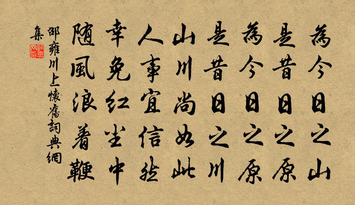 詩詞名句歷史字典書法欣賞書法字典國語詞典說文解字康熙字典古漢語字典標 題 作 者 詩 句 川上懷舊作者:邵雍 朝代:宋代川上懷舊原文為今日之山,是昔日之原。為今日之原,是昔日之川。山川尚如此,人事宜信然。倖免紅塵中,隨風浪著鞭。詩詞問答問:川上懷舊的作者是誰?答:邵雍問:川上懷舊寫於哪個朝代?答:宋代邵雍川上懷舊書法欣賞川上懷舊書法作品詩詞推薦賀新郎(虞萬州剛簡生日用所惠詞韻)魏了翁〔宋代〕久問閒邊著。對滄江、煙輕日淡,雨疏雲薄。一片閒心無人會,獨倚團團羊角。便舍瑟、鏗然而作。容室中間分明憶舊遊(過故園有感)張炎〔宋代〕記凝妝倚扇,笑眼窺簾,曾款芳尊。步屧交枝徑,引生香不斷,流水中分。忘了牡丹名字,和露撥花根。甚杜牧重戲題江心寺僧房壁陸游〔宋代〕史君千騎駐霜天,主簿孤舟冷不眠。也與史君同快意,臥聽鼓角大江邊。次韻張子華七夕陳著〔宋代〕郎自牽牛女自梭,駕言一歲一相過。不應妄念忘機杼,如此風波亦渡河。題李次仲庵中曹勛〔宋代〕杖藜乘興出江頭,自掛青錢買小舟。祈問仙翁餐玉法,便風一日到嚴州。驀山溪姬翼〔元代〕蹉跎十載,養就真無賴。事事不縈心,更絕盡、凡情世態。將迎冷淡,度日且閒閒,翻著襪,到穿衣,一任人憎愛和喻景山賦梅韻陳宓〔宋代〕質白偏能照玉船,體輕終愛舞蹁躚。眼前欲賦半妝額,夢裡須攜五色掾。愁對素蟾寒寂寞,故燒紅蠟暖清娟。寄聲素梅 五四王冕〔元代〕獨鶴高飛雪氣濃,梅煙清淺月朦朧。一聲簫管歸何處?人在瓊樓玉宇中。送廣州周判官張九齡〔唐代〕海郡雄蠻落,津亭壯越台。城隅百雉映,水曲萬家開。里樹桄榔出,時禽翡翠來。觀風猶未盡,早晚使車回。閒居十首陳造〔宋代〕仙仙弄影俯瓊瑤,月地香紅苦見撩。清夢定為蝴蝶去,杏花繁處宿良宵。念奴嬌(欲雪呈朱漕元順)張孝祥〔宋代〕朔風吹雨,送淒涼天氣,垂垂欲雪。萬里南荒雲霧滿,弱水蓬萊相接。凍合龍岡,寒侵銅柱,碧海冰澌結。憑高一絕句沈清友〔宋代〕昨天移棹泊垂虹,閒倚篷窗問釣翁。為底鱸魚低價賣,年來朝市怕秋風。留山間種藝十絕劉克莊〔宋代〕兩樹亭亭蘚砌傍,未論包貢奉君王。世無班馬堪薰炙,且嗅幽花亦自香。句歐陽鈇〔宋代〕天上張公子,雲間陸士龍。送畢郎中提點淮南茶場梅堯臣〔宋代〕汴中春絮亂,淮上鮆魚時。順水疾奔馬,出都猶脫羈。拜親將已近,食膾不言遲。到日問茶事,遍山開幾旗。戲友不識硯戴泰〔宋代〕古今天下多奇石,甲品從來只數端。千丈割雲潭影濕,一泓貯水月光寒。青瞳要辨生鴝眼,紫色須求死馬肝。鼠璞浪淘沙令(歇指調)柳永〔宋代〕有個人人。飛燕精神。急鏘環佩上華裀。促拍盡隨紅袖舉,風柳腰身。簌簌輕裙。妙盡尖新。曲終獨立斂香塵。應洞宮夕(一作華陽觀)陸龜蒙〔唐代〕月午山空桂花落,華陽道士雲衣薄。石壇香散步虛聲,杉雲清泠滴棲鶴。次前韻招鄭檢法項安世〔宋代〕人健萸真好,尊開菊自知。無聊念前日,一笑及斯時。高處雲如帽,愁邊雨欲絲。能來紙窗底,相伴賦新詩。句釋曉瑩〔宋代〕偶來清賞曲江頭。名句推薦一樹春風千萬枝,嫩於金色軟於絲。白居易《楊柳枝詞》 神女生涯原是夢,小姑居處本無郎。李商隱《無題·重幃深下莫愁堂》 平林漠漠煙如織,寒山一帶傷心碧。李白《菩薩蠻·平林漠漠煙如織》 多知而無親,博學而無方,好多而無定者,君子不與。荀子《荀子·大略》 今年游寓獨游秦,愁思看春不當春。杜審言《春日京中有懷》 檐流未滴梅花凍,一種清孤不等閒。鄭燮《山中雪後》 窮則獨善其身,達則兼善天下。孟子《孟子·盡心章句上·第九節》 治強生於法,弱亂生於阿。韓非及後人《韓非子·外儲說右下》 道不拾遺,民不妄取劉向《戰國策·秦一·衛鞅亡魏入秦》 沉舟側畔千帆過,病樹前頭萬木春。劉禹錫《酬樂天揚州初逢席上見贈》