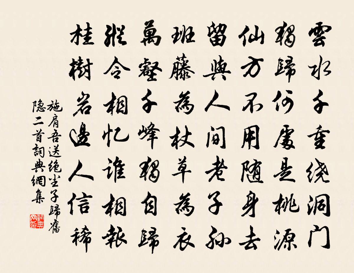 詩詞名句歷史字典書法欣賞書法字典國語詞典說文解字康熙字典古漢語字典標 題 作 者 詩 句 送絕塵子歸舊隱二首作者:施肩吾 朝代:唐代送絕塵子歸舊隱二首原文雲水千重繞洞門,獨歸何處是桃源。仙方不用隨身去,留與人間老子孫。班藤為杖草為衣,萬壑千峰獨自歸。縱令相憶誰相報,桂樹岩邊人信稀。詩詞問答問:送絕塵子歸舊隱二首的作者是誰?答:施肩吾問:送絕塵子歸舊隱二首寫於哪個朝代?答:唐代問:送絕塵子歸舊隱二首是什麼體裁?答:七絕施肩吾送絕塵子歸舊隱二首書法欣賞送絕塵子歸舊隱二首書法作品注釋全唐詩:卷494-98詩詞推薦訪楊湖州汪莘〔宋代〕一道西江隔水雲,夜瞻牛斗共天文。聖之清必先夫子,仁者勇須今使君。天下山川居一半,湖州風月占三分。錦囊少年走馬行釋文珦〔宋代〕少年走馬去如飛,大笑吾衰行走遲。吾同君健應無日,君似吾衰定有時。烏兔交馳猶急傳,能令海水桑田變。物之虞美人(和姚伯和)王千秋〔宋代〕風花南北知何據。常是將春負。海棠開盡野棠開。匹馬崎嶇、還入亂山來。尊前人物勝前度。誰記桃花句。老來情壽陽王花燭(一作宋之問詩)沈佺期〔唐代〕仙媛乘龍夕,天孫捧雁來。可憐桃李樹,更繞鳳凰台。燭送香車入,花臨寶扇開。莫令銀箭曉,為盡合歡杯。次韻上雪樓程侍御王奕〔宋代〕當年雪片大如席,獨立樓頭有此翁。集霰已知漫大地,行窗轉覺舞迴風。洛陽公子衾誰共,姑射仙人夢不同。且倚元豐己未三院東閣作己未九月予赴鞫御史聞蘇頌〔宋代〕早年相值浙江邊,多見新詩到處傳。樓上金蛇驚妙句,卷中腰鼓伏長篇。仳離歲月流如水,抑鬱情懷積似煙。今日胡小著克順知錄州惠安縣兼過南昌別墅楊億〔宋代〕平明束簡下蘭台,海縣鳴琴變滯才。厭說風塵住京洛,貪看雪浪架蓬萊。楚江歸思鱸魚鱠,隨岸離筵竹葉杯。通德句梁周翰〔宋代〕宿雨一番蔬甲拆,春山幾處茗旗香。雨後環波亭次韻四首次維得禽字韻曾鞏〔宋代〕丹杏一番收美實,綠荷無數放新花。西湖雨後清心目,坐到城頭泊暝鴉。失調名佚名〔宋代〕恨江南塞北,魚沈雁杳,空腸斷、書難寄。壽成惠聖慈佑太皇太后閣春帖子衛涇〔宋代〕北內風光別,仙家日月閒。紫皇天下養,金母在人間。子坦今秋鹽官市征當滿作絕句寄之陸游〔宋代〕八十老翁頭似雪,柯橋送汝淚頻揮。殘年豈料猶強健,卻向柯橋接汝歸。和仁仲舟中三絕胡寅〔宋代〕異代紛爭戰伐多,樓船贏負倚蒼波。如今天險如平地,讐虜深謀只用和。蠶婦辭陳普〔宋代〕東鄰採桑婦,西鄰養蠶女,年年役役為蠶苦。桐花如雪麥如雲,鳴鳩醉椹 * 雨。踏踏登竹梯,山煙鎖春樹。不管元旦與可大江行丘葵〔宋代〕日出潮回生紫煙,水光春色弄春妍。底須椒柏來為頌,且與鷗鳧敘隔年。風動微波靴面皺,苔粘枯石佛頭圓。老來懷素秋風帖贊岳珂〔宋代〕憭栗之秋,騷人所悲。彼僧何為,乃寫以辭。絕藝出塵,亦寄焉耳。雲煙蒼茫,在此幅紙。夢仙圖唐寅〔明代〕池塘春漲碧溶溶,醉臥香塵淺草中。一夢熟時鷗作伴,錦衾何必抱輕紅。句杜偉〔唐代〕忽睹邢武辭,泠其金石備。泥滑滑毛直方〔宋代〕泥滑滑,日已西。泥深屨滑涴征衣,征衣涴盡不肯歸。分明數聲行不得,請君更聽鷓鴣啼。登廬山唐彥謙〔唐代〕五老峰巔望,天涯在目前。湘潭浮夜雨,巴蜀暝寒煙。泰華根同峙,嵩衡脈共聯。憑虛有仙骨,日月看推遷。名句推薦絕代有佳人,幽居在空谷。杜甫《佳人》 母信者,其子必仁。劉向《列女傳·節義傳·楚昭越姬》 西登香爐峰,南見瀑布水。李白《望廬山瀑布水二首》 尺幅鮫鮹勞解贈,叫人焉得不傷悲。曹雪芹《紅樓夢·第三十四回》 後夜相思,塵隨馬去,月逐舟行。劉過《柳梢青·送盧梅坡》 花意爭春,先出歲寒枝。辛棄疾《江神子·賦梅寄余叔良》 顧謂戚夫人,彼翁羽翼成。李白《山人勸酒》 王顧左右而言他。孟子《孟子·梁惠王章句下·第六節》 興天下之利,除天下之害。墨子《墨子·12章 尚同(中)》 朱門酒肉臭,路有凍死骨。杜甫《自京赴奉先縣詠懷五百字 / 自京赴奉先詠懷五百字》