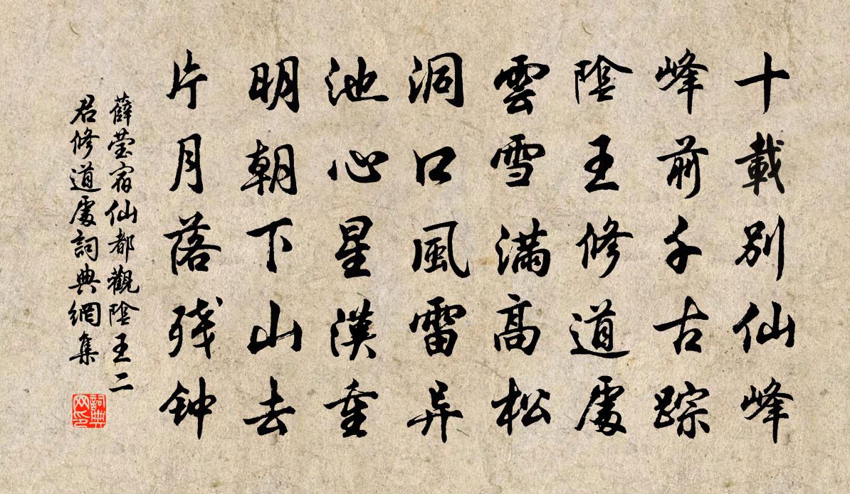 詩詞名句歷史字典書法欣賞書法字典國語詞典說文解字康熙字典古漢語字典標 題 作 者 詩 句 宿仙都觀陰王二君修道處作者:薛瑩 朝代:唐代宿仙都觀陰王二君修道處原文十載別仙峰,峰前千古蹤。陰王修道處,雲雪滿高松。洞口風雷異,池心星漢重。明朝下山去,片月落殘鍾。詩詞問答問:宿仙都觀陰王二君修道處的作者是誰?答:薛瑩問:宿仙都觀陰王二君修道處寫於哪個朝代?答:唐代問:宿仙都觀陰王二君修道處是什麼體裁?答:五律薛瑩宿仙都觀陰王二君修道處書法欣賞宿仙都觀陰王二君修道處書法作品注釋全唐詩:卷542-31詩詞推薦無妄吟邵雍〔宋代〕耳無妄聽,目無妄顧,口無妄言,心無妄慮。四者不妄,聖賢之具。予何人哉,敢不希慕。題趙別駕委齋劉克莊〔宋代〕乍看華扁費尋思,徐叩微言極坦夷。無可奈何安命者,吾非惡此欲逃之。萬羊賦祿渠前定,二鳥蒙恩彼一時。總被崔覲詩文同〔宋代〕崔覲者高幹,梁州城固人。讀書不求官,但與耕稼親。夫婦既已老,左右無子孫。一日召奴婢,盡又田宅均。俾之題琴台韓絳〔宋代〕車騎擁客安在哉,綺琴何事有遺台。當時卒困臨邛辱,異日寧知諭蜀才。園令官閒多病後,茂陵書奏{左亻右多}歸去詞王仲素〔宋代〕種松雨濯發,折筍春墮指。長嘯歸去來,滄江一天水。題汪尉立之快合王炎〔宋代〕傍檐古木綠陰陰,下有清溪可洗心。燕坐紅塵飛不到,何須風過一披襟。句崔子方〔宋代〕白日行空闊,青燈耿夜闌。寒食雨中,同舍約游天竺,得十六絕句呈陸務楊萬里〔宋代〕若道尋春被雨催,如何隨處兩三杯。晚晴曉雨如翻手,有底虧儂不好來。送友人得館游南康劉過〔宋代〕匏大從來速售難,依人高戴誤儒冠。江南又客諸侯去,梅子愁人四月寒。半世光陰旋蟻磨,百年舉子上魚竿。世間烏夜啼潘牥〔宋代〕無端小雪廉纖。入平檐。金鴨旋添龍餅,莫開簾。尋梅約。開還落。可曾忺。合作一年春恨,上眉尖。減字木蘭花黃庭堅〔宋代〕濃雲驟雨。巫峽有情來又去。今夜天開。不與姮娥作伴來。清光無外。白髮老人心自會。何處歌樓。貪看冰輪不轉送王廣淵司門出守絳州蘇頌〔宋代〕仕宦人言為郡樂,名藩古有絳台雄。居園幽絕刻樊記,分國盛強歌晉風。歷覽勝游千騎上,坐頒仁政兩河中。當年聞採石分司芸隱訃儲泳〔宋代〕忽聞千里訃,涕淚已交橫。遽奪英難去,不教功業成。人疑藏六甲,天使伴長庚。惆悵青山夢,分明坐兩楹。虎丘汪元量〔宋代〕維舟與客訪興亡,寺有殘僧說故王。寶物已銷龍虎氣,奎章猶射鬥牛光。為妖真女花藏墓,說法生公月滿堂。邂逅憶秦娥(初冬)趙長卿〔宋代〕寒蕭索。征鴻過盡離懷惡。離懷惡。江空天迥,夜寒楓落。有人應誤刀頭約。情深翻恨郎情薄。郎情薄。夢回長是鄭宋用前韻見示因亦和答四首韓元吉〔宋代〕臘里三看雪滿衢,使君當奉十行書。先生履敝人應笑,泥滑東家許借驢。偶書塔塢水中石何夢桂〔宋代〕白石兮磷磷,清泉兮泠泠。岸有蒲兮水有芹。敲竹筇兮金石聲,長嘯歌兮驚鬼神。世間豈無宦海之可航,仕路之可九日袁公濟有詩次其韻蘇軾〔宋代〕古來靜治得清閒,我愧真常也一班。舉酒東榮挹江海,回樽落日勸湖山。平生傾蓋悲歡里,早晚抽身簿領間。笑指句陳郁〔宋代〕地曠日難晚,海寬天欲浮。上元夜適勸至西禪觀燈蘇轍〔宋代〕三年不踏門前路,今夜仍看屋裡燈。照佛有餘長自照,澄心無法便成澄。追歡狂客去忘返,入定孤僧喚不譍。更到名句推薦關河底事空留客?歲月無情不貸人。于謙《立春日感懷》 天子臨軒賜侯印,將軍佩出明光宮。王維《少年行四首》 舟遙遙以輕颺,風飄飄而吹衣。陶淵明《歸去來兮辭·並序》 天勢圍平野,河流入斷山。暢當《登鸛雀樓》 我居北海君南海,寄雁傳書謝不能。黃庭堅《寄黃幾復》 春日遲遲,卉木萋萋。佚名《出車》 自知者不怨人,知命者不怨天;怨人者窮,怨天者無志。荀子《荀子·榮辱》 天門中斷楚江開,碧水東流至此回。李白《望天門山》 顧此耿耿存,仰視浮雲白。文天祥《正氣歌》 不登高山,不知天之高也;不臨深溪,不知地之厚也荀子《荀子·勸學》