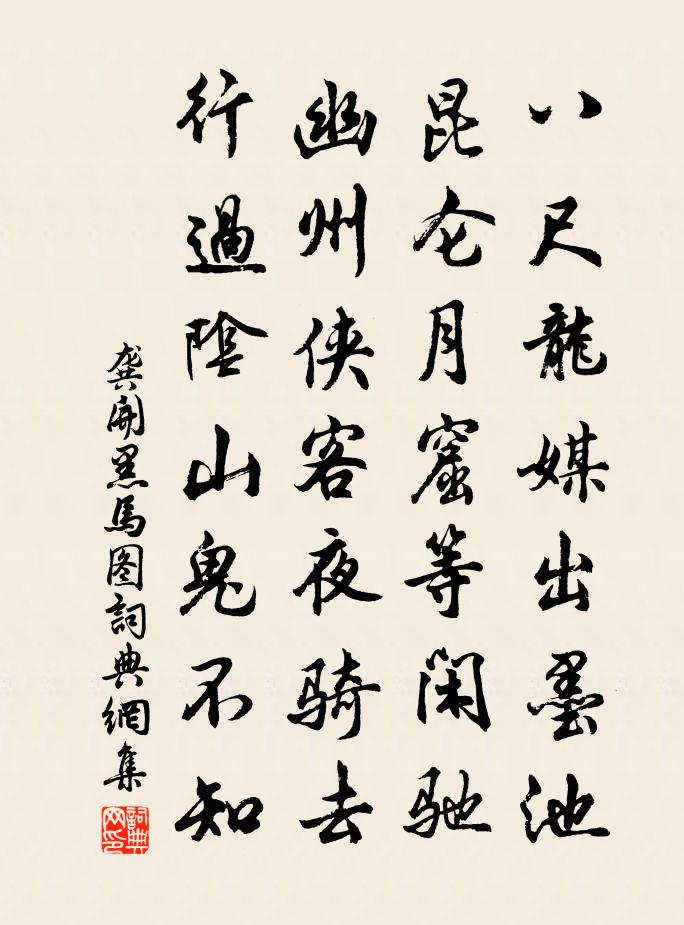 詩詞名句歷史字典書法欣賞書法字典國語詞典說文解字康熙字典古漢語字典標 題 作 者 詩 句 黑馬圖作者:龔開 朝代:宋代黑馬圖原文八尺龍媒出墨池,崑崙月窟等閒馳。幽州俠客夜騎去,行過陰山鬼不知。詩詞問答問:黑馬圖的作者是誰?答:龔開問:黑馬圖寫於哪個朝代?答:宋代龔開黑馬圖書法欣賞黑馬圖書法作品詩詞推薦資福寺劉錡〔宋代〕汛掃妖氛六合清,匣中寶劍氣猶橫。夜歡星斗鬼神泣,晝公風雲龍虎驚。重整山河歸北地,兩扶聖主到南京。山僧翁端朝輕利帖贊岳珂〔宋代〕結字清而峻,用筆精而穩。雖箋以粉,而墨跡猶未損。公之功名,予固未暇論。而所謂書法,要必有所本矣。一化士取血和墨寫藏經乞頌釋法薰〔宋代〕欲書火後舊時經,剔血和煤字字真。未舉筆前全藏了,聞弦應有賞音人。偈頌一百二十三首釋崇岳〔宋代〕春風浩蕩,古佛榜樣。春水潺湲,忽著眼看。燈籠跳入露柱,佛殿走出三門,撞著個無面目漢。卻道眾口難調,須再和楊公濟梅花十絕蘇軾〔宋代〕白髮思家萬里回,小軒臨水為花開。故應剩作詩千首,知是多情得得來。春日懷歷陽後園游兼寄宣城天使林逋〔宋代〕昔年行樂伴王孫,事盡清狂是後園。一榻竹風橫懶架,半軒花月到頑盆。佳人暗引鶯言語,芳草閒迷蝶夢魂。今日再題二首陳造〔宋代〕濤頭蜚過不斯須,只合朝昏展此圖。緬想海門才末勢,終然畎澮視江湖。沁園春舒頔〔元代〕多少閒情,桃源問蹊,柯山看棋。把杏花春雨,從頭吟了,木犀秋月,開戶邀之。氣捲風雲,眼空江海,萬古從前句張釜〔宋代〕遐想星軺思惘然。病來陸游〔宋代〕抱痾雖可驗,應接每安徐。正使須彈塞,寧當快掃除?寡言防禍始,省事養災余。一飽吾何欠?香粳薦美蔬。補樂歌十首大韶元結〔唐代〕森森群象兮,日見生成。欲聞朕初兮,玄封冥冥。洋洋至化兮,日見深柔。欲聞大濩兮,大淵油油。西上辭母墳陳去疾〔唐代〕高蓋山頭日影微,黃昏獨立宿禽稀。林間滴酒空垂淚,不見丁寧囑早歸。祝英台近·剪鮫綃文廷式〔清代〕剪鮫綃,傳燕語,黯黯碧草暮。愁望春歸,春到更無緒。園林紅紫千千,放教狼藉,休但怨、連番風雨。 謝橋路菊有黃花為彥逢弟壽王之道〔宋代〕正色憎桃李,凌霜見嫩黃。有同高士操,常占晚秋芳。裊裊金風軟,漙漙玉露光。君恩隆一束,時令應重陽。幸遇畫竹枝扇梅堯臣〔宋代〕石上老瘦竹,忽在紈扇中。執之意已涼,不待搖清風。小節未見粉,淚痕應合紅。日將炎暑退,畏蠹生秋蟲。答馬子山節推見寄文同〔宋代〕曾陪參畫從橐鞬,文雅當時最盛傳。玉掛好風橫飲簟,翠漪明月漾吟船。石渠金馬余何者,綠水紅蓮子尚然。好養對御書後一絕亞棲〔唐代〕通神筆法得玄門,親入長安謁至尊。莫怪出來多意氣,草書曾悅聖明君。已亥雜詩 29龔自珍〔清代〕觥觥益陽風骨奇,壯年自定千首詩。勇於自信故英絕,勝彼優孟俯仰為。送從叔牧永州盧綸〔唐代〕五侯軒蓋行何疾,零陵太守登車日。零陵太守淚盈巾,此日長安方欲春。虎府龍節照岐路,何苦愁為江海人。彼方雨過 其一王冕〔元代〕雨過山光潤,煙浮野色昏。清泉流近砌,黃葉擁衡門。世事憑誰論?高情只自存。忽思浣花老,又欲向東屯。名句推薦子規夜半猶啼血,不信東風喚不回。王令《送春》 豈能無意酬烏鵲,惟與蜘蛛乞巧絲。李商隱《辛未七夕》 人之所助者,信也。佚名《易傳·繫辭傳上·第十二章》 人之有能有為,使羞其行,而邦其昌。佚名《尚書·周書·洪範》 已忍伶俜十年事,強移棲息一枝安。杜甫《宿府》 蒼蒼竹林寺,杳杳鐘聲晚。劉長卿《送靈澈上人》 若為化得身千億,散上峰頭望故鄉。柳宗元《與浩初上人同看山寄京華親故》 七國三邊未到憂,十三身襲富平侯李商隱《富平少侯》 孤燈不明思欲絕,卷帷望月空長嘆。李白《長相思·其一》 枕前淚共階前雨,隔個窗兒滴到明。聶勝瓊《鷓鴣天·別情》