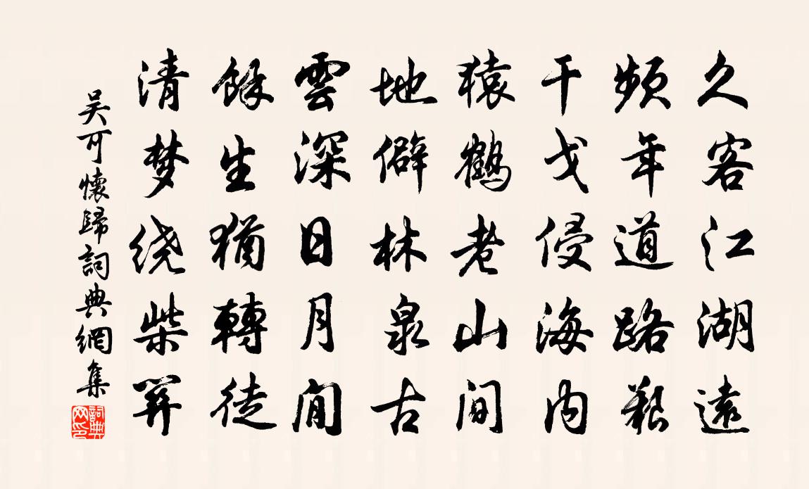 詩詞名句歷史字典書法欣賞書法字典國語詞典說文解字康熙字典古漢語字典標 題 作 者 詩 句 懷歸作者:吳可 朝代:宋代懷歸原文久客江湖遠,頻年道路艱。干戈侵海內,猿鶴老山間。地僻林泉古,雲深日月閒。餘生猶轉徒,清夢繞柴關。詩詞問答問:懷歸的作者是誰?答:吳可問:懷歸寫於哪個朝代?答:宋代吳可懷歸書法欣賞懷歸書法作品詩詞推薦與謬栓法同行口占分水嶺詩駱羅憲〔宋代〕勉強驅馳力不堪,筍車肱曲睡方酣。思歸夢逐來時路,無奈杜鵑聲兩三。詩九首托南劍劉教尋亦周墓焚之趙文〔宋代〕自出延平十八年,年年誰與酹荒阡。若為化得衰翁骨,去作壙中三百磚。芳草渡(般涉調)張先〔宋代〕雙門曉鎖響朱扉。千騎擁、萬人隨。風烏弄影畫船移。歌時淚,和別怨,作秋悲。寒潮小,渡淮遲。吳越路、漸天嘆花詞施肩吾〔唐代〕前日滿林紅錦遍,今日繞林看不見。空餘古岸泥土中,零落胭脂兩三片。林檎花董嗣杲〔宋代〕樹枝高墜展霞綃,妝點清明景物饒。帖上幸聯青李字,花頭不似海棠嬌。英英褪雨新紅淡,瓣瓣零風蝶粉綃。光景贈孫莘老七絕蘇軾〔宋代〕嗟予與子久離群,耳冷心灰百不聞。若對青山談世事,當須舉白便浮君。頌十六首釋慧暉〔宋代〕可憐多客滿堂僧,打睡送時亂佛承。悟入至今無一個,驀頭端的盡三乘。含雲寺書事六絕句楊時〔宋代〕獸駭禽鳴翳蔚中,難將此意問鴻蒙。縈迴小徑蒼苔滑,杖屨從今恐不通。平生張耒〔宋代〕平生壯節終難變,投老浮名信所遭。要路爭先寧遽福,從來率野屈吾曹。銅雀妓二首王勃〔唐代〕金鳳鄰銅雀,漳河望鄴城。君王無處所,台榭若平生。舞席紛何就,歌梁儼未傾。西陵松檟冷,誰見綺羅情。妾本蛾眉亭華岳〔宋代〕天邊新月覆雙彎,翠斂雲濃特地寒。我意兩山皆土木,詩人浪作有情看。送房元直赴北京嚴維〔唐代〕猶道樓蘭十萬師,書生匹馬去何之。臨岐未斷歸家目,望月空吟出塞詩。常欲激昂論上策,不應憔悴老明時。遙知二詩敬寄致政大夫先生趙蕃〔宋代〕不向薌林去,於今又四年。琴書故間止,草木想蒼然。安否音書曠,飄零日月還。禮加如下榻,興盡敢回船。夜與鄰幾持國歸梅堯臣〔宋代〕紅塵夜不息,橫衢若煙霧。朝見車馬來,暮見車馬去。車中目炯炯,馬上情遽遽。交相知是誰,飛先無覓處。同曹清父西郊紀事五首方回〔宋代〕掛粟枯桑杪,籬門晝掩關。晴霜開曠野,寒日曬荒山。指點村煙外,經行冢樹間。群豪故貪愎,竊發亦愚奸。訪雲端菴居程公許〔宋代〕夢想雲端路屈盤,幽尋今果雲端。三間矮屋煙霏擁,一片間情宇宙寬。上銼間搜靈藥煮,天壇不遣篆香殘。誰能好立春前二日獲雪宋祁〔宋代〕佳雪春前降,層陰臘外留。日昏霏霰集,風定舞花稠。浩氣皚皚遍,繁光袞袞流。灑林初亂塢,拂瓦暗平溝。洞矗頌證道歌證道歌釋印肅〔宋代〕莫將管見謗蒼蒼,井底蛙牛逞巨江。乾坤大地一隻眼,用來還似一毫芒。壽傅守釋若芬〔宋代〕秋入東籬破曉霜,黃花不肯媚重陽。花神愛惜緣何事,要向今朝薦壽觴。凌屯田知和州宋祁〔宋代〕坡殿程篇屬思精,飄飄老氣薄黔嬴。一台舊服郎官筆,千騎新提太守兵。候吏騰裝催去舸,故人引脰悵離觥。雲波名句推薦迢遞嵩高下,歸來且閉關。王維《歸嵩山作》 人情反覆,世路崎嶇。洪應明《菜根譚·概論》 燕歸花謝,早因循、又過清明。納蘭性德《紅窗月·燕歸花謝》 何處可為別,長安青綺門。李白《送裴十八圖南歸嵩山二首》 人之愛子,罕亦能均;自古及今,此弊多矣。顏之推《顏氏家訓·教子篇》 因可勢,求易道。韓非及後人《韓非子·觀行》 日高煙斂,更看今日晴未。李清照《念奴嬌·春情》 獨坐幽篁里,彈琴復長嘯。王維《竹里館》 人無禮則不生,事無禮則不成,國家無禮則不寧。荀子《荀子·修身》 莫買沃洲山,時人已知處。劉長卿《送方外上人/送上人》