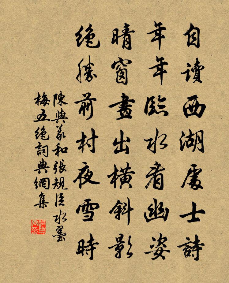 詩詞名句歷史字典書法欣賞書法字典國語詞典說文解字康熙字典古漢語字典標 題 作 者 詩 句 和張規臣水墨梅五絕作者:陳與義 朝代:宋代和張規臣水墨梅五絕原文自讀西湖處士詩,年年臨水看幽姿。晴窗畫出橫斜影,絕勝前村夜雪時。詩詞問答問:和張規臣水墨梅五絕的作者是誰?答:陳與義問:和張規臣水墨梅五絕寫於哪個朝代?答:宋代問:陳與義的名句有哪些?答:陳與義名句大全陳與義和張規臣水墨梅五絕書法欣賞和張規臣水墨梅五絕書法作品詩詞推薦何意晁說之〔宋代〕何意此閒居,逋亡且謾如。日高雞在樹,風靜雁拋蘆。雨露傳新令,兒童說故都。秋光金甲上,醜虜犯王誅。後江行十絕岳珂〔宋代〕遠村煙暝牛羊下,近岸波澄鷗鷺閒。一抹斜陽江似鏡,天移小景向人間。花自落(寓謁金門)張輯〔宋代〕春寂寞。簾底蕙爐煙薄。聽盡歸鴻書怎托。相思天一角。象筆鸞箋閒卻。秀句與誰商略。睡起愁懷何處著。無風花題觀城驛壁李若水〔宋代〕半篙寒碧秋垂釣,一笛疏風夜倚樓。多少巫山舊家事,老來分付與東流。和廬陵士尹八俊投贈韻程公許〔宋代〕白苧裁春衫,京塵可得緇。一麾江海去,何成復何虧。馳驅兩輪朱,蕭騷雙鬢絲。所欣歲功就,千里春台熙。素念度麾嶺寄莘老王安石〔宋代〕區區隨傳換冬春,夜半懸崖托此身。豈慕王尊能許國,直緣毛義欲私親。施為已壞生平學,夢想猶歸寂寞濱。風月八月十一夜作文起夜興汪莘〔宋代〕點墨揮毫勢始停,起來耳目共時醒。一窗月色元無響,四壁蟲聲不見形。十二月二十七日立春夜不寐楊萬里〔宋代〕冬夜嫌長只望春,春宵又永更何言。睫梢強合終無睡,腳底相摩也不溫。竟夕松風聽到曉,忽明燈火看來昏。擁紬新正吟邵雍〔宋代〕蘧瑗知非日,宣尼讀易年。人情止於是,天意豈徒然。立事情尤倦,思山興益堅。誰能同此志,相伴老伊川。句李若水〔宋代〕遠雁入空碧,孤舟浮淺清。晚春劉克莊〔宋代〕花事匆匆了,人家割麥初。雨多田有鸛,潮小市無魚。禿筆回僧簡,褒衣看古書。經年稀見客,磬折轉生疏。催雪方岳〔宋代〕作箋擬上朝元殿,為說梅須雪轉香。杯雋已生詩意思,硯寒更作夜商量。輕明玉費天工巧,頃刻花催帝子忙。醉夢次西和韻仇遠〔宋代〕貧是儒家事,生平畏四知。燈花空送喜,瓶粟不供炊。湖海心終在,田園計未遲。願同華山叟,驢背倒能騎。飯後登東山陸游〔宋代〕飯已茶未成,褰裳步山徑。雖雲筋力衰,掛杖猶濟勝。天高樓塔麗,霜落溝港淨。豈惟野實丹,已覺林筍迸,井桐代墨客卿自賦贈安城彭雲翼二首曾豐〔宋代〕決策初如媚灶然,觸機融理悟吹煙。從教時尚白之白,與道俱雲玄又玄。泰州海陵縣主簿許君墓志銘王安石〔宋代〕君諱平,字秉之,姓許氏。余嘗譜其世家,所謂今泰州海陵縣主簿者也。君既與兄元相友愛稱天下,而自少卓犖不次韻孔毅甫集古人句見贈五首蘇軾〔宋代〕羨君戲集他人詩,指呼市人如使兒。天邊鴻鵠不易得,便令作對隨家雞。退之驚笑子美泣,問君久假何時歸。世間贈盡梅竹劉信可李軏〔宋代〕劉兄胸次參元化,不發為文發為畫。心工入妙手通神,聲名直與僧繇亞。月宮拔得玉兔毫,縛成篆筆銛如刀。紛然旅泊吳門張賁〔唐代〕一舸吳江晚,堪憂病廣文。鱸魚誰與伴,鷗鳥自成群。反照縱橫水,斜空斷續雲。異鄉無限思,盡付酒醺醺。十五日明發石口,遇順風楊萬里〔宋代〕泝流淺水剌樓船,百棹千篙秪不前。一夜波聲喧到曉,北風氣力欲翻天。掛帆未了青泥過,轉眼相將玉笥邊。無數名句推薦離恨恰如春草,更行更遠還生。李煜《清平樂·別來春半》 魯女東窗下,海榴世所稀。李白《詠鄰女東窗海石榴》 望中酒旆閃閃,一簇煙村,數行霜樹。柳永《夜半樂·凍雲黯淡天氣》 秋風起兮木葉飛,吳江水兮鱸正肥。張翰《思吳江歌》 遊人不管春將老,來往亭前踏落花。歐陽修《豐樂亭遊春·其三》 夭夭園桃,無子空長。曹丕《煌煌京洛行》 家國興亡自有時,吳人何苦怨西施。羅隱《西施》 官河水靜闌乾暖,徙倚斜陽怨晚秋。史達祖《鷓鴣天·衛縣道中有懷其人》 雲無心以出岫,鳥倦飛而知還。陶淵明《歸去來兮辭·並序》 幾時能命駕,對酒落花前。賈島《清明日園林寄友人》
