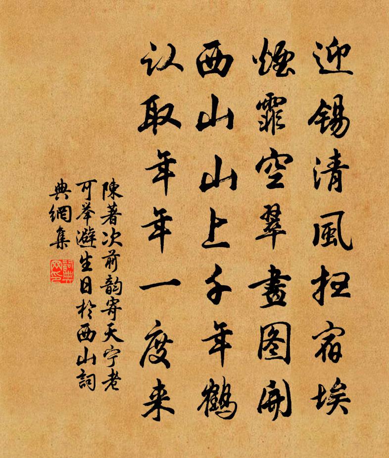 詩詞名句歷史字典書法欣賞書法字典國語詞典說文解字康熙字典古漢語字典標 題 作 者 詩 句 次前韻寄天寧老可舉避生日於西山作者:陳著 朝代:宋代原文迎錫清風掃宿埃,煙霏空翠畫圖開。西山山上千年鶴,認取年年一度來。詩詞問答問:《次前韻寄天寧老可舉避生日於西山》的作者是誰?答:陳著問:該詩寫於哪個朝代?答:宋代書法欣賞次前韻寄天寧老可舉避生日於西山書法作品詩詞推薦為茅峰崇禧主人景架岩贊王肖岩所寫喜容張榘〔宋代〕虬髯如雲眼如月,胸次毫端一泓雪。政恐儒冠或誤身,尚友虛無老莊列。松陰泉影綠悠悠,此時此意如何說。三真臨江仙(約同官出郊)侯置〔宋代〕一抹煙林屏樣展,輕花岸柳無邊。連朝春雨漲平川。冬冬迎社鼓,渺渺下陂船。同事多才饒我懶,乘閒縱飲郊園。頌一百則釋重顯〔宋代〕一拽石,二般土,發機須是千鈞弩。象骨老師曾輥毬,爭似禾山解打鼓。報君知,莫莽鹵,甜者甜兮苦者苦。冬暖絕句楊萬里〔宋代〕今歲無寒秪有暄,臘前渾似半春天。醉中苦有薰香癖,燒得春衫兩袖穿。山居即事釋紹嵩〔宋代〕永日翛然坐,春風苦喚行。筍輿穿樹色,竹塢度鍾聲。雨惡天光淡,山窮地勢傾。苔磯清境裹,花濕轉分明。題畫十首唐寅〔明代〕野水荒亭氣象幽,山深因少客來游。啼禽欲歇煙霞暝,一對西風落葉秋。送凝上人成都看藥市王灼〔宋代〕蜀山富奇藥,野老爭藏收。九日來成都,寒斷長儀樓。權豪競奪去,萬金未得酬。問師杖頭錢,免渠失笑不。久通六月六日侄孫輩同食大麥二首錢時〔宋代〕大麥新炊苜蓿盤,一壺春酒小團欒。金丹九死生靈命,莫作尋常糲飯看。禱雨胡寅〔宋代〕久閟天公澤,焦然品匯情。遏雲虹屢飲,擊海電空明。禱祀山川遍,薰修道釋並。帝心終閔物,國力未休兵。帽覆王正卿何道夫和嘉字韻詩至數十道夫贈予數篇李流謙〔宋代〕洗甲傾河漸可涯,北征猶記宋元嘉。石劉姓字非圖錄,軒嚳乾坤自我家。原上鼓旗寒朔吹,日邊詔令掞春華。舞乾食早荔七首劉克莊〔宋代〕薴蘿仙子絳紗裳,歲歲年年逞色香。不比阿環池上果,一千年得一番嘗。九日對菊有懷粹老在河上四首黃庭堅〔宋代〕黃花節晚猶可惜,青眼故人殊未來。金蕊飛觴無計共,香鈿滿地始應回。雁和彥山韻趙時韶〔宋代〕叫月聲聲到枕兒,稻粱雖飽豈能肥。夜深且傍瀟湘宿,明日晴空萬里飛。讀鄧魴詩白居易〔唐代〕塵架多文集,偶取一卷披。未及看姓名,疑是陶潛詩。看名知是君,惻惻令我悲。詩人多蹇厄,近日誠有之。京兆感舊白居易〔唐代〕晦叔墳荒草已陳,夢得墓濕土猶新。微之捐館將一紀,杓直歸丘二十春。城中雖有故第宅,庭蕪園廢生荊榛。篋中牡丹舒岳祥〔宋代〕九枝初拆御袍紅,艷質煌煌日正中。曾對集英瞻袞冕,孤臣灑淚立東風。除日獄空唯欠租監系頗眾因悉縱遣之期以開歲虞儔〔宋代〕訟牒日已稀,私幸庭無留。胡不了租稅,顧為此拘囚。催科迫星火,對案亦包羞。作苦念田家,歲莫得少休。羔酒讀何斯舉黃州秋居雜詠次其韻陸游〔宋代〕夜靜我欲歌,四座且勿喧。堯舜本得道,富貴何足捐?聖人久不作,學者墮語言,著書各專門,百家散如煙。一身題呂季升谷隱堂兼寄居仁李處權〔宋代〕莘野隱於耕,傅岩隱於築。叔夜隱於鍛,君平隱於卜。四子隱不同,抗志俱超俗。夫君無所事,掃跡隱於谷。優遊楊柳枝劉禹錫〔唐代〕花萼樓前初種時,美人樓上斗腰肢。如今拋擲長街里,露葉如啼欲恨誰?名句推薦豆雨聲來,中間夾帶風聲。蔣捷《聲聲慢·秋聲》 長安故人問我,道尋常、泥酒只依然。辛棄疾《木蘭花慢·滁州送范倅》 數枝門柳低衣桁,一片山花落筆床。岑參《山房春事二首》 眼孔淺時無大量,心田偏處有奸謀。馮夢龍《醒世恆言·卷一》 溪雲初起日沉閣,山雨欲來風滿樓。許渾《鹹陽城東樓 / 鹹陽城西樓晚眺 / 西門》 調角斷清秋,征人倚戍樓。張喬《書邊事》 日斜江上孤帆影,草綠湖南萬里情。劉長卿《別嚴士元》 雪洗虜塵靜,風約楚雲留張孝祥《水調歌頭·和龐佑父》 秋容淺淡映重門,七節攢成雪滿盆。曹雪芹《詠白海棠》 微雨過,小荷翻。榴花開欲然。蘇軾《阮郎歸·初夏》