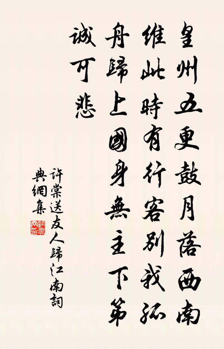詩詞名句歷史字典書法欣賞書法字典國語詞典說文解字康熙字典古漢語字典標 題 作 者 詩 句 送友人歸江南作者:許棠 朝代:唐代送友人歸江南原文皇州五更鼓,月落西南維。此時有行客,別我孤舟歸。上國身無主,下第誠可悲。詩詞問答問:送友人歸江南的作者是誰?答:許棠問:送友人歸江南寫於哪個朝代?答:唐代問:送友人歸江南是什麼體裁?答:五古許棠送友人歸江南書法欣賞送友人歸江南書法作品注釋全唐詩:卷604-68詩詞推薦題潮山海門圖王炎〔宋代〕潮來濺雪欲浮天,潮去奔雷又寂然。海上兩山元不動,更添此意畫中傳。中庭韓偓〔唐代〕夜短睡遲慵早起,日高方始出紗窗。中庭自摘青梅子,先向釵頭戴一雙。為游叔蕃覓苦椎羅公升〔宋代〕丘中有佳人,被褐抱白玉。百年老風雨,坐閱成毀速。霜余乃脫潁,磊落隱者屋。平生苦硬姿,卓爾受命獨。虞翻歐陽晦夫惠琴枕蘇軾〔宋代〕中郎不眠仰看屋,得此古椽圍尺竹。輪囷濩落非笛材,剖作袖琴徽軫足。流傳幾處到淵明,臥枕綸巾酒新漉。孤鸞臨刑賦楊損〔唐代〕聖主何曾識仲都,可嗟社稷在須臾。市東便是神仙窟,何必乘舟泛五湖。園鶴游九言〔宋代〕擲米不盈掬,群雀下階除。昂昂圃中鶴,飯糗不可呼。嬉翔白雲外,飲啄春山隅。日淡煙水鄉,風曬翎羽舒。群雞自悼薛令之〔唐代〕朝日上團團,照見先生盤。盤中何所有,苜蓿長闌乾。飯澀匙難綰,羹稀箸易寬。只可謀朝夕,何由保歲寒。送鄭寂上人南行許渾〔唐代〕儒家有釋子,年少學支公。心出是非外,跡辭榮辱中。錫寒秦嶺月,杯急楚江風。離怨故園裡,小秋梨葉紅。滿庭芳 師父畫骷髏相誘引稍悟馬鈺〔元代〕風仙化我,無限詞章。仍懷猶豫心腸。兒畫骷髏省悟,斷制從長。欲待來年學道,恐今年、不測無常。欲來日,恐送李頻之南陵主簿許棠〔唐代〕赴縣是還鄉,途程豈覺長。聽鶯離灞岸,盪槳入陵陽。野蕨生公署,閒雲拂印床。晴天調膳外,垂釣有池塘。句王晞鴻〔宋代〕峽覆琵琶彎水帶,山歌氈帽送江聲。紅塵紫陌江聲外,綠嶂青嵐書幾間。送平江守蔣宣卿奉祠歸宜興仲並〔宋代〕二年環堵賴餘波,相和兒童襦褲歌。還復攀轅逢此日,敢忘推轂意如何。十行行矣重徵霸,三徑歸歟暫景坡。旦晚雨後十小絕以一雨洗殘暑萬家生早涼為韻章甫〔宋代〕喔詩思遠人,欲往無羽翰。焚香閉門睡,睡起香未殘。秋晚早發新定杜牧〔唐代〕解印書千軸,重陽酒百缸。涼風滿紅樹,曉月下秋江。岩壑會歸去,塵埃終不降。懸纓未敢濯,嚴瀨碧淙淙。讀中興碑秋隱里叟〔宋代〕辭本春秋作,聱翁策固長。漫嗟褒貶跡,孰繼老汾陽。和吳中丞悼笙妓李群玉〔唐代〕麗質仙姿煙逐風,鳳凰聲斷吹台空。多情草色怨還綠,無主杏花春自紅。墮珥尚存芳樹下,余香漸減玉堂中。唯應題都亭驛施宜生〔金代〕江梅的爍未全開,老倦無心上將台。人在江南望江北,斷鴻聲里送潮來。新成小齋曰剡雪舟以興有所思也舒岳祥〔宋代〕銀河枕上客星來,殘夢西窗水鳥啼。身入布衾如臥雪,當年曾泛戴公溪。眼兒媚 賦秋日海棠,分韻得闌字劉敏中〔元代〕春來應怪洗妝慳。故作兩回看。風流依舊,檀心暈紫,翠袖凝丹。玉容寂寞欄乾淚,細雨豆花寒。多情誰管,今宵孔平仲著作江州官舍小庵蘇轍〔宋代〕近山不作看山計,引水新成照水庵。閉口忘言中自飽,安心度日更誰參。簡編圍繞穿書蠹,窗戶低回作繭蠶。我亦名句推薦寂寂花時閉院門,美人相併立瓊軒。朱慶餘《宮詞 / 宮中詞》 世界微塵里,吾寧愛與憎。李商隱《北青蘿》 騷人可煞無情思,何事當年不見收。李清照《鷓鴣天·桂花》 紫艷半開籬菊靜,紅衣落盡渚蓮愁。趙嘏《長安晚秋 / 秋望 / 秋夕》 饒人不是痴漢,痴漢不會饒人。佚名《增廣賢文·上集》 幽蘭旋老,杜若還生,水鄉尚寄旅。吳文英《鶯啼序·春晚感懷》 鍥而舍之,朽木不折;鍥而不捨,金石可鏤。荀子《荀子·勸學》 隔座送鉤春酒暖,分曹射覆蠟燈紅。李商隱《無題·昨夜星辰昨夜風》 士雖有學,而行為本焉。墨子《墨子·02章 修身》 機不密,禍先行。馮夢龍《醒世恆言·卷二十》