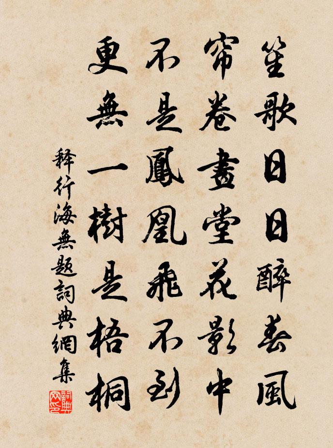 詩詞名句歷史字典書法欣賞書法字典國語詞典說文解字康熙字典古漢語字典標 題 作 者 詩 句 無題作者:釋行海 朝代:宋代無題原文笙歌日日醉1|1春1/1風,簾卷畫堂花影中。不是鳳凰飛不到,更無一樹是梧桐。詩詞問答問:無題的作者是誰?答:釋行海問:無題寫於哪個朝代?答:宋代釋行海無題書法欣賞無題書法作品詩詞推薦春晴白玉蟾〔宋代〕宿靄縈余凍,鬆陰挾嫩晴。朝來花萬福,鶯奏起居聲。猿杜牧〔唐代〕月白煙青水暗流,孤猿銜恨叫中秋。三聲欲斷疑腸斷,饒是少年須白頭。同王九題就師山房孟浩然〔唐代〕晚憩支公室,故人逢右軍。軒窗避炎暑,翰墨動新文。竹蔽檐前日,雨隨階下雲。同游清蔭偏,吟臥夕陽曛。江靜木蘭花慢周密〔宋代〕恰芳花菲夢醒,漾殘月、轉湘花。正翠崦收鍾,彤墀放仗,台榭輕煙。東園。夜遊乍散,聽金壺、逗曉歇花簽。花齊天樂(端午和韻)劉辰翁〔宋代〕枝頭雨是青梅淚。翻作一江春水。魚腹魂銷,龍舟叫徹,不了湖亭張戲。滿庭芳芷。正艾日高高,葛風細細。試比論詩三十首元好問〔金代〕望帝春心托杜鵑,佳人錦色怨華年。詩家總愛西崑好,獨恨無人作鄭箋。水調歌頭佚名〔宋代〕明月雙溪上,勝景號金華。當年此夕,多少鸞鳳雜雲霞。共擁飄飄仙伯,來作人間英傑,王謝舊名家。綸紼妙文采鷓鴣天劉敏中〔元代〕一段清香雲錦秋。雙花開處盡風流。只應無語常相併,卻是多情不自由。湘水怨,漢濱愁。淡煙斜日兩悠悠。凌波滿江紅(自和)李曾伯〔宋代〕自入春來,花信費、幾番風了。先付與、紅妝萬點,蒼顏一笑。舊說沈香亭北似,今雖濯錦江頭少。最可人、枝上滿庭芳 寄鄠縣晏公及道眾馬鈺〔元代〕山侗馬鈺,閒吟閒詠。不是夸強逞俊。謂見人居火院,受苦不忍。時時詩詞勸化。啟丹誠、闡開玄徑。常哭告,望予家畜狸花二貓一日狸者獲鼠未食而花者私竊強至〔宋代〕狸貓得鼠活未食,戲局之地或前後。貓欺鼠困縱不逐,豈防厥類怠其守。花貓狡計伺狸怠,帖耳偷銜背之走。家人賦汪先輩昆仲聽雨軒姜特立〔宋代〕堂堂兩蘇公,秀峙自西蜀。一朝入京師,聲價喧寥廓。聯翩取膴仕,鳴鳳在阿閣。方乾赤霄上,忽向青雲落。黑風皇雅十首《大鹵》二章尹洙〔宋代〕冀州之疆,粵惟大鹵。俗忮而專,地扼而固。協比幽都,盪搖邊圉。三垂既夷,凶威弗沮。帝御六師,百萬貔虎。代柬濟鼎同年約其早飯曹涇〔宋代〕小人難與作緣,惡食不妨志道。猶勝杜陵岳陽,一飯欲從人討。楊處乾輓詩魏了翁〔宋代〕丁年已分與時違,便把書棚囑付兒。峨嶺秋寒千古意,符溪春暖一筒詩。彩雲來往吾何與,草露消磨我自知。含笑禍福姜特立〔宋代〕君子兒短拙,動或福隨之。小人最狡獪,往往觸禍機。巧者極人力,拙者無所為。巧拙不必問,天道自平夷。關中高蟾〔唐代〕風雨去愁晚,關河歸思涼。西遊無紫氣,一夕九迴腸。送王相公之幽州皇甫冉〔唐代〕自昔蕭曹任,難兼衛霍功。勤勞無遠近,旌節屢西東。不選三河卒,還令萬里通。雁行緣古塞,馬鬣起長風。遮虜大觀三年釋奠六首佚名〔宋代〕道德淵源,斯文之崇。功名糠秕,素王之風。碩兮斯牲,芬兮斯酒。綏我無疆,興天為久。出見京華之盛而作晁說之〔宋代〕飄零羇客尚驚魂,乍見王居白玉城。三市盡迷南北向,入騶爭禁短長行。花栘陸海春常在,樓接神山月不傾。安得名句推薦擊鼓其鏜,踴躍用兵。佚名《擊鼓》 眾芳搖落獨暄妍,占盡風情向小園。林逋《山園小梅二首》 何事春風容不得?和鶯吹折數枝花。王禹偁《春居雜興·兩株桃杏映籬斜》 漢臣曾此作縲囚,茹血衣毛十九秋。汪遵《詠北海》 勞心者治人,勞力者治於人。孟子《孟子·滕文公章句上·第四節》 群芳過後西湖好,狼籍殘紅。歐陽修《採桑子·群芳過後西湖好》 楊柳乍如絲,故園春盡時。納蘭性德《菩薩蠻·問君何事輕離別》 雨停荷芰逗濃香,岸邊蟬噪垂楊。閻選《臨江仙·雨停荷芰逗濃香》 一切都是命,半點不由人。佚名《增廣賢文·上集》 衝波突出人齊譀,躍浪爭先鳥退飛。盧肇《競渡詩 / 及第後江寧觀競渡寄袁州剌史成應元》