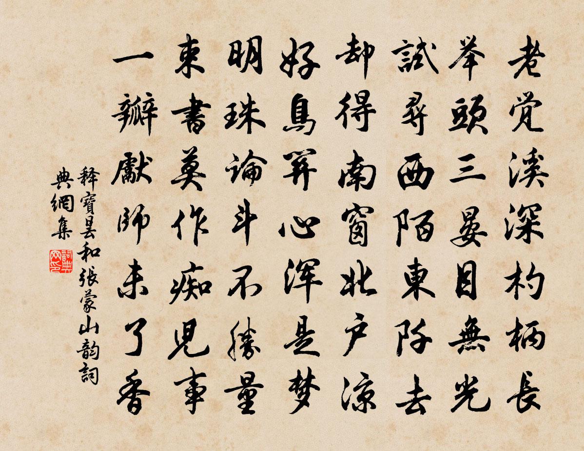 詩詞名句歷史字典書法欣賞書法字典國語詞典說文解字康熙字典古漢語字典標 題 作 者 詩 句 和張蒙山韻作者:釋寶曇 朝代:宋代和張蒙山韻原文老覺溪深杓柄長,舉頭三晏目無光。試尋西陌東阡去,卻得南窗北戶涼。好鳥關心渾是夢,明珠論斗不勝量。束書莫作痴兒事,一瓣先師未了香。詩詞問答問:和張蒙山韻的作者是誰?答:釋寶曇問:和張蒙山韻寫於哪個朝代?答:宋代釋寶曇和張蒙山韻書法欣賞和張蒙山韻書法作品詩詞推薦點絳唇仇遠〔宋代〕黃帽棕鞋,出門一步為行客。幾時寒食。岸岸梨花白。馬首山多,雨外青無色。誰禁得。殘鵑孤驛。撲地春雲黑。蝶戀花(即景)何夢桂〔宋代〕風信花殘吹柳絮。柳外池塘,乳燕時飛度。漠漠輕雲山約住。半村煙樹鳩呼雨。竹院深深深幾許。深處人閒,誰識句張孝芳〔宋代〕三十六峰天與寄,雲間只欠我題詩。悟南柯 繼重陽韻馬鈺〔元代〕立遇心通徹,清香味得餐。水中紅焰結成團。雪裡瓊花,爛漫不凋殘。性燭明金闕,神丹晃玉盤。齊修六度與三壇送玉堂守永嘉曾由基〔宋代〕袞袞諸公塞要津,獨當椽笑演絲綸。久職清禁聊均佚,誰道明河不可親。畿郡喜迎賢太守,帝旁卻欠直詞臣。逸才春日山居章甫〔宋代〕流轉情何限,艱難老見侵。兒啼妨午睡,花落攪春心。得句從誰說,開尊只自斟。移家近城市,湖水幾時深。宋江都研高似孫〔宋代〕數雨清純玉不如,入婆陶發冷蕭疏。千金爛抵荊山鵲,一璞深刳渭水魚。墨帶花香臨近澗,泓沉灑影了殘書。從來高宗郊祀前廟朝享太廟三十首真宗〔宋代〕熙事既成,嘉籩告嚴。洋洋來臨,藹藹布列。配帝其功,在天對越。允集叢釐,萬邦和悅。江神子/江城子李之儀〔宋代〕惱人天氣雪消時。落梅飛。日初遲。小閣幽窗,時節聽黃鸝。新洗頭來嬌困甚,才試著,夾羅衣。木梨花拂淡燕脂代宗輓歌李端〔唐代〕祖庭三獻罷,嚴衛百靈朝。警蹕移前殿,宮車上渭橋。寒霜凝羽葆,野吹咽笳簫。已向新京兆,誰雲天路遙。丙子兵禍台溫為烈寧海雖經焚掠然耕者不廢丁舒岳祥〔宋代〕事過清眠足,心寬緩步宜。古人無限事,煙蹙幾修眉。釣台戴復古〔宋代〕赤符新領舊乾坤,多謝君王問故人。暫作客星侵帝座,終為漁父老江濱。層台不啻幾千仞,直釣何曾掛一鱗。莫道淵明圖唐寅〔明代〕五柳先生日醉眠,客來清賞榻無氈。酒資盡在東籬下,散貯黃金萬斛錢。辛酉正月初八日入郡赴高校書之約二十二日出汪莘〔宋代〕竹籬茅屋兩三家,白晝青春自歲華。碧縠水邊搓柳線,綠羅天畔繡桃花。雨夜與鄰翁飲用前輩韻陸游〔宋代〕老人閱世真悠哉!八十已過九十來。茆檐參差映煙樹,蕭條雞犬三家聚。一樽鄰翁迭賓主,醉語豈憂多謬誤。我作成都遨樂詩二十一首三月三日登學射山田況〔宋代〕麗日照芳春,良會重元已。陽濱修祓除,華林程射技。所尚或不同,茲俗亦足喜。門外盛車徒,山半列鄽市。彩堋華清宮杜常〔唐代〕行盡江南數十程,曉風殘月入華清。朝元閣上西風急,都入長楊作雨聲。同魯山韓丞觀女靈廟前險石晃沖之〔宋代〕群不見魯陽之西兩山麓,十里連岡寫平陸。青林白晝暗古祠,雀啅虛檐蛛綱屋。屋子邊怪石何瑰奇,鳳筋上黃連肌閒居示友人釋智圓〔宋代〕冷淡誰知趣,閒房枕水湄。秋窗開暮景,孤枕夢天涯。道直時流笑,心清夜月知。何當學支遁,共約買山期。依韻和永叔子履冬夕小齋聯句見寄梅堯臣〔宋代〕遙知夜相過,對語冷無火。險辭斗尖奇,凍地抽筍笴。唫成欲寄誰,談極唯思我。學術窮後先,文字少許可。敢將名句推薦野渡舟橫,楊柳綠陰濃。謝逸《江神子·杏花村館酒旗風》 江南可採蓮,蓮葉何田田。佚名《江南》 今年歡笑復明年,秋月春風等閒度。白居易《琵琶行 / 琵琶引》 泰山不要欺毫末,顏子無心羨老彭。白居易《放言五首·其五》 休問梁園舊賓客,茂陵秋雨病相如。李商隱《寄令狐郎中》 王粲登臨寥落際。雁飛不斷天連水。王庭筠《鳳棲梧·衰柳疏疏苔滿地》 山光忽西落,池月漸東上。孟浩然《夏日南亭懷辛大》 山中也有千年樹,世上難逢百歲人。佚名《增廣賢文·上集》 總把春山掃眉黛,不知供得幾多愁?李商隱《代贈二首》 食必常飽,然後求美;衣必常暖,然後求麗劉向《說苑·反質》