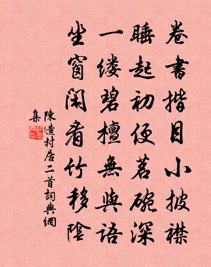 詩詞名句歷史字典書法欣賞書法字典國語詞典說文解字康熙字典古漢語字典標 題 作 者 詩 句 村居二首作者:陳造 朝代:宋代村居二首原文卷書揩目小披襟,睡起初便茗碗深。一縷碧檀無與語,坐窗閒看竹移陰。詩詞問答問:村居二首的作者是誰?答:陳造問:村居二首寫於哪個朝代?答:宋代陳造村居二首書法欣賞村居二首書法作品詩詞推薦次韻上勉元規張繼先〔宋代〕優遊且消遣,認取本來人。痛苦邊是妄,杳冥中有真。煎煩徒自累,恬惔即長春。君豈知予念,予身非子身。偶題二首劉言史〔唐代〕金榜榮名俱失盡,病身為庶更投魑。春娥慢笑無愁色,別向人家舞柘枝。得罪除名謫海頭,驚心無暇與身愁。中使天寧長老新齋堂請轉語吳潛〔宋代〕慧公幻出一齋堂,巨棟危梁壓十方。更有心堂無量闊,闊中別有好思量。首尾吟邵雍〔宋代〕堯夫非是愛吟詩,詩是堯夫可愛時。已首意時仍著意,未加辭處與加辭。物皆有理我何者,天且不言人代之。代了趙周卿送菜曹勛〔宋代〕虛老空山學圃翁,荷鋤頭白雪蓬鬆。芥台如臂何曾夢,菜腦生筋漫自供。不料官園蒼玉束,絕勝禁臠紫駝峰。更煩代書寄周愚卿二首趙蕃〔宋代〕友於閣上友於人,忽忽分攜又兩春。剩欲作書書不得,舊知吾懶是吾真。種藥強至〔宋代〕百藥吾誰辨,農皇舊有經。傾金購善種,按譜驗真形。易地防根瘦,他時欲劑靈。天時縱不雨,灌溉賴園丁。酬君山遠上人送別陶夢桂〔宋代〕戀戀君山未解維,高僧來送贈行詩。誰知歸去陶元亮,又遇當年遠法師。蓮社欲留聽說法,菊籬那忍負歸期。臨岐月中觀梅方岳〔宋代〕何物蒼頭不自量,踏梅踏月上山堂。月明幸是無痕跡,可惜瓊瑤一徑香。傳言玉女晁沖之〔宋代〕一夜東風,吹散柳梢殘雪。御樓煙暖,正鰲山對結。簫鼓向晚,鳳輦初歸宮闕。千門燈火,九街風月。繡閣人人,禁中夜作書與元九白居易〔唐代〕心緒萬端書兩紙,欲封重讀意遲遲。五聲宮漏初鳴後,一點窗燈欲滅時。感皇恩(送林縣尉)趙長卿〔宋代〕碧水浸芙蓉,秋風楚岸。三歲光陰轉頭換。且留都騎,未許匆匆分散。更持杯酒殷勤勸。休作等閒,別離人看。且樂語王義山〔宋代〕龍樓日永,鶴禁風薰,拂曉壽星光現。無限霞裾,欣傳帝母,與佛同生華旦。佳氣慈闈,看龍顏歡動,玉卮親勸。長安退將項斯〔唐代〕塞晚沖沙損眼明,歸來養病住秦京。上高樓閣看星坐,著白衣裳把劍行。常說老身思斗將,最悲無力制蕃營。翠眉題潛菴白玉蟾〔宋代〕已把功名等風絮,鶴氅星冠懶成趣。谷口人尋虎跡來,林間菴正猿啼處。好向青山白雲中,參取翠竹黃花句。道人題華山麻處士所居於鄴〔唐代〕貴賤各擾擾,皆逢朝市間。到此馬無跡,始知君獨閒。冰破聽敷水,雪晴看華山。西風寂寥地,唯我坐忘還。句釋惠臻〔宋代〕禍來患至不由人,土地伽藍固弗靈。投從叔補闕杜荀鶴〔唐代〕吾宗不謁謁詩宗,常仰門風繼國風。空有篇章傳海內,更無親族在朝中。其來雖愧源流淺,所得須憐雅頌同。三十僧求詩往平江王洋〔宋代〕一瓶一缽遠山寒,野路梅花已向殘。自古吳門十萬戶,莫疑開口告人難。詩一首張浚〔宋代〕三相當年鎮廟堂,江山草木亦增光。一時主宰權衡重,千古人間姓字香。名句推薦城頭鐵鼓聲猶震,匣里金刀血未乾。王昌齡《出塞二首》 京國多年情盡改,忽聽春雨憶江南。虞集《聽雨》 報君黃金台上意,提攜玉龍為君死!李賀《雁門太守行》 關山正飛雪,烽火斷無煙。王維《隴西行》 流水翻催淚,寒灰更伴人。胡皓《和宋之問寒食題臨江驛》 旦別河橋楊柳風,夕臥伊川桃李月。宋之問《寒食還陸渾別業》 榮螈,蜥蜴。佚名《爾雅·釋魚》 積善三年,知之者少,為惡一日,聞於天下。房玄齡《晉書·帝紀·第一章》 甚荒唐,到頭來都是為他人作嫁衣裳!曹雪芹《紅樓夢·第一回》 古人今人若流水,共看明月皆如此。李白《把酒問月·故人賈淳令予問之》