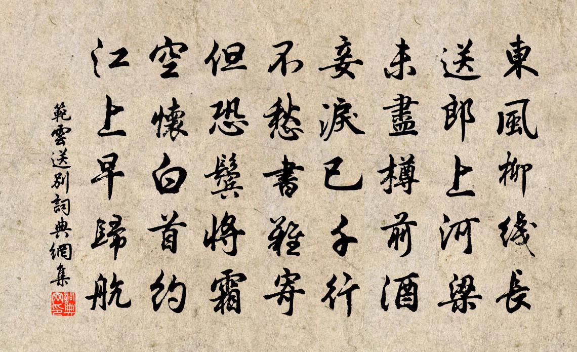 詩詞名句歷史字典書法欣賞書法字典國語詞典說文解字康熙字典古漢語字典標 題 作 者 詩 句 送別作者:范雲 朝代:南北朝送別原文東風柳線長,送郎上河梁。未盡樽前酒,妾淚已千行。不愁書難寄,但恐鬢將霜。空懷白首約,江上早歸航。詩詞問答問:送別的作者是誰?答:范雲問:送別寫於哪個朝代?答:南北朝范雲送別書法欣賞送別書法作品詩詞推薦過潼關邵雍〔宋代〕禁密因離亂,機閒為太平。山河雖設險,道德豈容爭。不究千一義,空傳百二名。遐方久無外,何復用雞鳴。送韓祗嚴戶曹得替省親成都蘇轍〔宋代〕宦遊東土暫相依,政役頻煩會合稀。每恃詳明容老病,不堪羈旅送將歸。思親道路寧論遠,入蜀山河漸覺非。我有園蔬十詠芋劉子翬〔宋代〕分得蹲鴟種,連根占地腴。曉吹黏玉糝,深碗啖模糊。太清宮燒香歐陽修〔宋代〕清晨琳闕聳漓岏,弭節齋坊暫整冠。玉案拜時香裊裊,畫廊行處佩珊珊。壇場夜雨蒼苔古,樓殿春風碧瓦寒。我是自歷陽泛江至赤埭訪別曹解賀鑄〔宋代〕我訪故人不待招,滄江謂廣才容舠。離城五點寒更急,著岸兩竿晴日高。別來書尺正坐嬾,老去鞍馬何堪勞。明年村飲陸游〔宋代〕白稻登場喜食新,太倉月廩厭陳陳。叢祠懹肉有歸遺,官道橫眠多醉人。小市孤村真送老,浩歌起舞最關身。鹽醯賭春曲楊維楨〔元代〕鬥草歸來後,開筵又賭春。階前撒珠戲,誰是得雙人?復謔廷裕李搏〔唐代〕曾隨風水化凡鱗,安上門前一字新。聞道蜀江風景好,不知何似杏園春。招里巷友和韻李曾伯〔宋代〕小有家林適,歸來已恨遲。引杯懷楚舞,飽飯和陶詩。慷慨多新語,綢繆半舊知。夜深橋雪滑,亟命短筇支。挽秦國夫人李流謙〔宋代〕久矣鴻飛渚,翩然雁字峰。九重疏異渥,萬里合幽封。引柩烏銜壤,馴阡鹿護松。他時人下馬,有子是夔龍。發淮安楊士奇〔明代〕岸蓼疏紅水荇青,茨菰花白小如蓱。雙鬟短袖慚人見,背立船頭自采菱。和文與可洋州園亭三十詠其二十七此君庵蘇轍〔宋代〕風梢繞檐匝,霜幹當窗淨。遙知素壁上,醉墨森相映。雨中陸游〔宋代〕孤村風雨連三日,秋暑如焚一洗空。睡覺房櫳燈漸暗,卻尋殘夢雨聲中。柳梢青趙師俠〔宋代〕料峭餘寒。元宵欲過,燈火闌珊。宿酒難醒,新愁未解,搖兀吟鞍。深林百舌關關。更雨洗、桃紅未乾。野燒痕青淨眾院嘗荔支蔡襄〔宋代〕霞樹珠林暑後新,直疑天意別留春。京華百世爭鮮貴,自是芳根著海濱。九日陰雨不止病中把酒示諸子三首蘇轍〔宋代〕九日不能飲,呦呦覺胃寒。妻孥勸把盞,萸菊正堆盤。懶極久成病,年高終鮮歡。道人嫌服藥,心息自相安。七交七首尹書記歐陽修〔宋代〕師魯天下才,神鋒凜豪雋。逸驥臥秋櫪,意在騤騤迅。平居弄翰墨,揮灑不停瞬。談笑帝王略,驅馳古今論。良工出合肥北門二首王之道〔宋代〕淮水東來沒踝無,只今南北斷修塗。東風卻與人心別,布暖吹生遍八區。菩薩蠻李彌遜〔宋代〕餘霞收盡寒煙綠。江山一片團明玉。敧枕畫樓風。愁生草際蛩。金莖秋未老。兩鬢吳霜早。忍負廣寒期。清尊對語即事張嵲〔宋代〕落日邊書急,秋風戰鼓多。私憂真過計,長算合如何。盡欲清淮戍,仍收瀚海波。棲遲一尊酒,幽恨滿關河。名句推薦道傍榆莢仍似錢,摘來沽酒君肯否。岑參《戲問花門酒家翁》 花明月暗籠輕霧,今宵好向郎邊去。李煜《菩薩蠻·花明月暗籠輕霧》 唯願當歌對酒時,月光長照金樽里。李白《把酒問月·故人賈淳令予問之》 獨抱濃愁無好夢,夜闌猶剪燈花弄。李清照《蝶戀花·暖雨晴風初破凍》 自笑堂堂漢使,得似洋洋河水,依舊只流東陳亮《水調歌頭·送章德茂大卿使虜》 鳳林關里水東流,白草黃榆六十秋。張籍《涼州詞三首·其三》 亞夫營畔柳濛濛,隋主堤邊四路通。汪遵《楊柳》 惜別傷離方寸亂。忘了臨行,酒盞深和淺。李清照《蝶戀花·淚濕羅衣脂粉滿》 如夢,如夢,殘月落花煙重。李存勖《如夢令·曾宴桃源深洞》 春來遍是桃花水,不辨仙源何處尋。王維《桃源行》