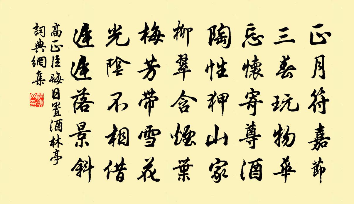 詩詞名句歷史字典書法欣賞書法字典國語詞典說文解字康熙字典古漢語字典標 題 作 者 詩 句 晦日置酒林亭作者:高正臣 朝代:唐代晦日置酒林亭原文正月符嘉節,三春玩物華。忘懷寄尊酒,陶性狎山家。柳翠含菸葉,梅芳帶雪花。光陰不相借,遲遲落景斜。詩詞問答問:晦日置酒林亭的作者是誰?答:高正臣問:晦日置酒林亭寫於哪個朝代?答:唐代問:晦日置酒林亭是什麼體裁?答:五律高正臣晦日置酒林亭書法欣賞晦日置酒林亭書法作品注釋全唐詩:卷72_1詩詞推薦送資政侍讀侍郎西赴陝郊宋庠〔宋代〕君欲歸休未得休,再持符節定西侯。深嚴殿籍恩圖舊,蔽芾棠歌野續謳。洛浦神仙觀送客,崤陵風雨避傳騶。高懷過故宜城項安世〔宋代〕我行熊繹故王都,十里南牆俯赤湖。想見當時寧有晉,那知此地更逃吳。宮門自昔通城北,墓碑多年立路隅。欲仗次王玠投贈韻三首劉克莊〔宋代〕兩被宸奎擢史官,曾參豹尾屬車間。不能直筆公褒貶,安敢高談到畫珊。老有丹心猶戀闕,死無一字可藏山。兒童水調歌頭佚名〔宋代〕玉斧折丹桂,錦繡拂銀河。蟠胸虹氣千丈,捧硯喚宮娥。三度花攢五馬,一笑毫揮萬字,何處不恩波。試問老仙壽我從山中游於石〔宋代〕我從山中游,歸來林壑暝。澗水凍不流,月出四山靜。柴扉不敢敲,恐驚孤鶴醒。徘徊踏明月,倚杖看松影。題妙智院朱利賓〔宋代〕江南景物可人意,夢裡家山喚客愁。歲月幾何春欲暮,水雲深處寺偏幽。賀新郎(再用前韻)劉克莊〔宋代〕放逐身藍縷。被門前、群鷗戲狎,見推盟主。若把士師三黜比,老子多他兩度。袖手看、名場呼五。不會車邊望塵偈頌一百零九首釋可湘〔宋代〕娑羅雙樹間,瞿曇展會睡。一睡二千年,而今醒也未。醒了也,足觀瞻。山花開似錦,澗水湛如藍。鳳凰閣(己酉歸舟衡陽作)趙師俠〔宋代〕正薰風初扇,雨細梅黃暑溽。並搖雙槳去程速。那更黃流浩淼,白浪如屋。動歸思、離愁萬斛。平生奇觀,頗快江過吳門登簡孚堂有感吳芾〔宋代〕三十年前此宦遊,經從偶得駐扁舟。回頭歲月如駒隙,到眼風煙獨虎丘。無復故人論舊事,卻因陳跡惹新愁。此生贈卜道人二首袁燮〔宋代〕道人怪我年如許,宿債胡為未盡償。寧識吾心烈於火,得歸要下便清涼。好事近·搖首出紅塵朱敦儒〔宋代〕搖首出紅塵,醒醉更無時節。活計綠蓑青笠,慣披霜沖雪。晚來風定釣絲閒,上下是新月。千里水天一色,看孤鴻贈月堂徐相士姚勉〔宋代〕衡門選龍首,摸索未容易。龍首許黃扉,卻亦非難事。濟物乃素心,好爵豈予志。時來亦不辭,焉用早諛媚。句孫何〔宋代〕早晚無塵事。西庵夜坐釋雲岫〔宋代〕一室寒燈坐夜長,八千里路到梅陽。西山固不如洋嶼,也道薰風殿閣涼。於眉州輓詩魏了翁〔宋代〕老雁長雲橫蜀道,歸鴉落日倚江城。摩挲少日生祠記,忍聽虞歌薤露聲。南鄉子·畫舸停橈歐陽炯〔唐代〕畫舸停橈,槿花籬外竹橫橋。水上遊人沙上女,回顧,笑指芭蕉林里住。驀山溪(怨別)趙孟堅〔宋代〕桃花雨動,測測輕寒小。曲檻面危闌,對東風、傷春懷抱。酒邊心事,花下舊閒情,流年度,芳塵杳,懊惱人空老元老和示小詩自謂非戰之罪復作一絕並坐具還蘇轍〔宋代〕請君卻領彌天具,不欲終收陷虎名。莫道昏沉非戰罪,何如不戰屈人兵。送田道士使蜀投龍宋之問〔唐代〕風馭忽泠然,雲台路幾千。蜀門峰勢斷,巴字水形連。人隔壺中地,龍游洞裡天。贈言回馭日,圖畫彼山川。名句推薦雁聲不到東籬畔,滿城但、風雨淒涼吳文英《惜黃花慢·菊》 菩薩應如是布施。不住於相。鳩摩羅什譯《金剛經·妙行無住》 致君堯舜上,再使風俗淳。杜甫《奉贈韋左丞丈二十二韻》 風急桃花也似愁,點點飛紅雨。如晦《楚天遙過清江引·有意送春歸》 國破山河在,城春草木深。杜甫《春望》 文章已滿行人耳,一度思卿一愴然。李忱《吊白居易》 碧雲天,黃葉地,秋色連波,波上寒煙翠。范仲淹《蘇幕遮·懷舊》 多少六朝興廢事,盡入漁樵閒話。張昪《離亭燕·一帶江山如畫》 長歌吟松風,曲盡河星稀。李白《下終南山過斛斯山人宿置酒》 武皇去金閣,英威長寂寞江淹《銅爵妓》