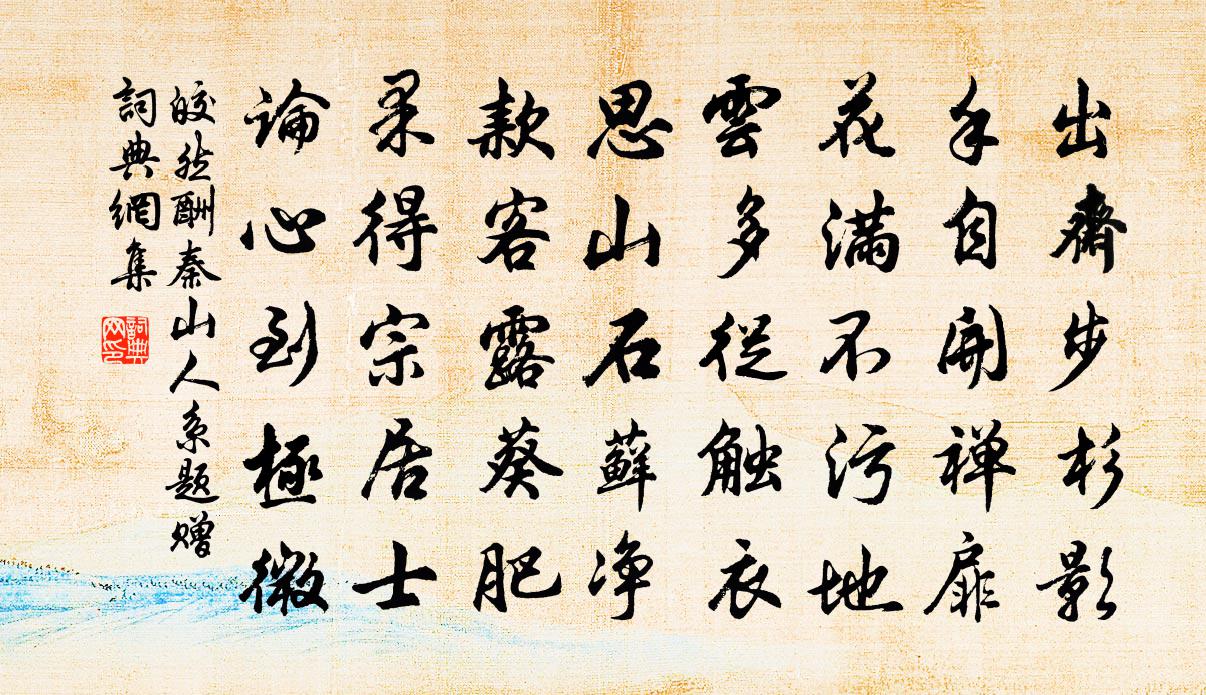 詩詞名句歷史字典書法欣賞書法字典國語詞典說文解字康熙字典古漢語字典標 題 作 者 詩 句 酬秦山人系題贈作者:皎然 朝代:唐代酬秦山人系題贈原文出齋步杉影,手自開禪扉。花滿不污地,雲多從觸衣。思山石蘚淨,款客露葵肥。果得宗居士,論心到極微。詩詞問答問:酬秦山人系題贈的作者是誰?答:皎然問:酬秦山人系題贈寫於哪個朝代?答:唐代問:酬秦山人系題贈是什麼體裁?答:五律皎然酬秦山人系題贈書法欣賞酬秦山人系題贈書法作品注釋全唐詩:卷815-15詩詞推薦喜涼章甫〔宋代〕老去孤黃嬭,愁來賴麴生。客居宜落寞,寒事費經營。歲稔鍛聲急,夜長燈影明。深懷不成寐,四壁候蟲鳴。答公孫及李復〔宋代〕輾轉臥不周,遙夜何漫漫。娟娟竹間月,照我影零亂。繁蟲哀陰壁,輕風泛幃幔。節物自感人,寤言興永嘆。頹坐儀真道中三首李彌遜〔宋代〕長天漠漠水邊空,雲淡風微兩兩鴻。南北不知緣底事,一生半落往來中。惜餘春慢/選冠子陳德武〔宋代〕不語佳人,多才名友,天遣伴吾幽獨。令姿潘岳,太素何郎,爭似一叢紅玉。誰為織雲錦裳,天孫巧處,暗空機軸天平山白雲泉錢藻〔宋代〕白雲岩靜最深隈,泉溜泓溶石竇開。宿霧不生澄曉月,殘風輕漾蟄寒雷。源從天漢星邊落,流自鰲峰海上回。莫謂斷酒黃滔〔唐代〕未老先為百病仍,醉杯無計接賓朋。免遭拽盞郎君謔,還被簪花錄事憎。絲管合時思索馬,池塘晴後獨留僧。何因劍聯句范仲淹〔宋代〕聖人作神兵,以定天下厄。蚩憂發靈機,干將構雄績。橐籥天地開,鑪冶陰陽闢。南帝輪火精,西皇降金液。炎炎題人畫扇十首曹勛〔宋代〕柳已如眉拂上林,細風吹動綠煙深。東君巧欲裝春色,更引黃鸝囀好音。壽遂寧李漕李曾伯〔宋代〕自從岳牧著民庸,十載岷峨帝眷隆。草帶雨鋤周圃綠,粟和煙挽漢關紅。活人陰德深無盡,壽國良方用不窮。一轉挽黃修職杜范〔宋代〕宰士當年棣萼情,世科心許白頭登。詩書早已傳家學,場屋誰知負夜燈。老矣尚余英氣在,嗟哉獨慕善人稱。一經臨江仙劉辰翁〔宋代〕睡過花陰一丈,愁深酒力千鍾。夢魂不得似游蜂。瓶花無密約,到處自神通。天上西湖似錦,人間驕馬如龍。今年瑞鶴仙樓采〔宋代〕凍痕銷夢草。又招得春歸,舊家池沼。園扉掩寒峭。倩誰將花信,遍傳深窈。追游趁早。便栽卻、輕衫短帽。任殘夸父逐日佚名〔先秦〕夸父與日逐走,入日;渴,欲得飲,飲於河、渭;河、渭不足,北飲大澤。未至,道渴而死。棄其杖,化為鄧林。魏丞相輓詩三首王炎〔宋代〕士論崇高節,宸心眷朴忠。調元才玉鉉,均佚即琳宮。補痛嘉謀密,平衡道揆公。惜哉當國淺,不及究成功。青溪任希夷〔宋代〕青溪不見麗華留,遺恨空餘故國羞。璧月只應明結綺,春風只不上迷樓。賦得浮雲起離色,送鄭述誠韋應物〔唐代〕遊子欲言去,浮雲那得知。偏能見行色,自是獨傷離。晚帶城遙暗,秋生峰尚奇。還因朔吹斷,匹馬與相隨。浪淘沙(秋夜感懷)劉辰翁〔宋代〕無葉著秋聲。涼鬢堪驚。滿城明月半窗橫。惟有老人心似醉,未曉偏醒。起舞故無成。此恨難平。正襟危坐二三更桃源行汪藻〔宋代〕祖龍門外神傳璧,方士猶言仙可得。東行欲與羨門親,咫尺蓬萊滄海隔。那知平地有青雲,只屬尋常避世人。關中小孤山張耒〔宋代〕一峰枝水孤劍立,古廟開簾雙臉紅。水邊古木老龍蟄,山下水色磨青銅。我來扁舟望有禱,萬頃春水清溶溶。明神山中桃花鄭獬〔宋代〕春入關山亦未遲,薴蘿山下見西施。不羞白髮欺雙鬢,且對清尊插一枝。縱落不隨流水去,僅開惟有白雲知。何須名句推薦不用憑欄苦回首,故鄉七十五長亭。杜牧《題齊安城樓》 方以類聚,物以群分佚名《易傳·繫辭傳上·第一章》 明朝掛帆席,楓葉落紛紛。李白《夜泊牛渚懷古》 榆柳蔭後檐,桃李羅堂前。陶淵明《歸園田居·其一》 偶參伍之驗,以責陳言之實韓非及後人《韓非子·備內》 車遙遙兮馬洋洋,追思君兮不可忘。傅玄《車遙遙篇》 小兒呼叫走長街,雲有痴呆召人買。范成大《賣痴呆詞》 愁里高歌梁父吟,猶如金玉戛商音。鄭思肖《二礪》 昔去雪如花,今來花似雪。范雲《別詩》 一上高城萬里愁,蒹葭楊柳似汀洲。許渾《鹹陽城東樓 / 鹹陽城西樓晚眺 / 西門》