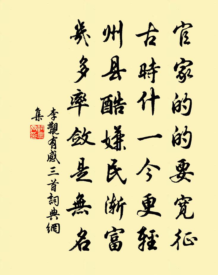 詩詞名句歷史字典書法欣賞書法字典國語詞典說文解字康熙字典古漢語字典標 題 作 者 詩 句 有感三首作者:李覯 朝代:宋代有感三首原文官家的的要寬征。古時什一今更輕。州縣酷嫌民漸富,幾多率斂是無名。詩詞問答問:有感三首的作者是誰?答:李覯問:有感三首寫於哪個朝代?答:宋代李覯有感三首書法欣賞有感三首書法作品詩詞推薦西江月(代五三弟為老母壽)張孝祥〔宋代〕慈母行封大國,老仙早上蓬山。天憐陰德遍人間。賜與還丹七返。莫問清都紫府,長教綠鬢朱顏。年年今日采衣斑偈頌一百二十三首釋祖欽〔宋代〕閏月月望,月即尋常。雲埋即闇,雲散即光。菩薩蠻(杏花)劉學箕〔宋代〕昨日杏花春滿樹。今晨雨過香填路。零落軟胭脂。濕紅無力飛。轉頭春易去。春色歸何處。待密與春期。春歸人也橙子四首劉子翬〔宋代〕自從天籞守吏散,老樹零落煙雲淒。今朝我為作知已,小摘秋風黃欲齊。烏棲曲 [一作李端詩]王昌齡〔唐代〕白馬逐朱車,黃昏入狹邪。柳樹鳥爭枝,爭枝未得飛上屋。東房少婦婿從軍,每聽烏啼知夜分。栽松道者釋普寧〔宋代〕栽培得地,節操蒼然。死而復活,身後身前。楖栗橫肩阿剌剌,再來不直半分錢。有聞若管吹者意兒童為之問之乃鳥有名竹管者趙蕃〔宋代〕盡日閒窗運禿翁,自憐虛出管城封。不知爾更何為者,初聽猶疑似足蛩。雜詠一百首彭祖劉克莊〔宋代〕活得如彭老,憂愁八百春。頻為哭殤叟,屢作悼亡人。再賦丁謂〔宋代〕彼美性秋江上,性塵埃恥托性根。笑傾性行雨國,香返夢蘭魂。蛺蝶無媒妁,鴛鴦見子孫。遍窺思兩槳,深鎖憶重次陳秘書韻釋慧遠〔宋代〕旋機倒用從前事,奪食驅耕驗作家。星電交馳玄路絕,從教努目視深沙。贈吳德秀隱士用來韻李復〔宋代〕不計無成與有成,但能償足百年心。喜營美釀多栽秫,廣蓄奇書盡散金。三代遺文鐘鼎古,五湖秋意畫圖深。超然頌古三十三首釋師觀〔宋代〕全提正令,高低普應。三應三呼,諦聽諦聽。木蘭花慢 陪安參政宴吳山盛氏樓張野〔元代〕愛吳山佳處,凝望際,眼增明。正簾卷江濤,屏開罨畫,境接蓬瀛。中朝相君寬厚,領太平、歌吹宴簪纓。巧囀雛自江州司馬授忠州刺史仰荷聖澤聊書鄙誠白居易〔唐代〕炎瘴拋身遠,泥塗索腳難。網初鱗撥剌,籠久翅摧殘。雷電頒時令,陽和變歲寒。遺簪承舊念,剖竹授新官。鄉覺送李員外使還蘇州,兼呈前袁州李使君,賦得長字…從兄劉長卿〔唐代〕別離共成怨,衰老更難忘。夜月留同舍,秋風在遠鄉。朱弦徐向燭,白髮強臨觴。歸獻西陵作,誰知此路長。和李希言仙書事王洋〔宋代〕五年萍梗蹤,所向隨波流。請言初起時,皇輿向吳頭。觸目多變異,論心鮮朋儔。願借谷生筆,隨非奕者秋。憶昨送鑒供奉歸蜀寧親靈澈〔唐代〕林間出定戀庭闈,聖主恩深暫許歸。雙樹欲辭金錫冷,四花猶向玉階飛。梁山拂漢分清境,蜀雪和煙惹翠微。此去七里灘四錫〔宋代〕清泚寒流走白沙,釣台蒼翠遠嵯峨。隔谿人語穿芳樹,旁岸魚跳落淺莎。幾處上源堪涉渡,有時野艇並來過。秋聲和癭杯梅堯臣〔宋代〕物以美好稱,或以醜惡用。美惡固無然,逢時乃亦共。棄則為所輕,用則為所重。道聞癭木器,愛賞互歌頌。定應宣州雜詩二十首梅堯臣〔宋代〕諸葛久精妙,已能聞國都。紫毫搜老兔,蒼鼠拔長須。露筦何明淨,煙丸事染濡。班超投此去,死作玉關夫。名句推薦荷花嬌欲語,愁殺蕩舟人。李白《淥水曲》 落花夜雨辭寒食。塵香明日城南陌。吳文英《菩薩蠻·落花夜雨辭寒食》 刑當罪則威,不當罪則侮荀子《荀子·君子》 半天涼月色,一笛酒人心。袁枚《夜過借園見主人坐月下吹笛》 天變不足畏,祖宗不足法,人言不足恤。脫脫《宋史·列傳·卷八十六》 神女生涯原是夢,小姑居處本無郎。李商隱《無題·重幃深下莫愁堂》 玉梅消瘦,恨東皇命薄。汪元量《傳言玉女·錢塘元夕》 贈君明月滿前溪,直到西湖畔。毛滂《燭影搖紅·送會宗》 物壯則老,是謂不道,不道早已。老子《老子·道經·第三十章》 萬條千縷綠相迎。舞煙眠雨過清明。晏幾道《浣溪沙·二月和風到碧城》