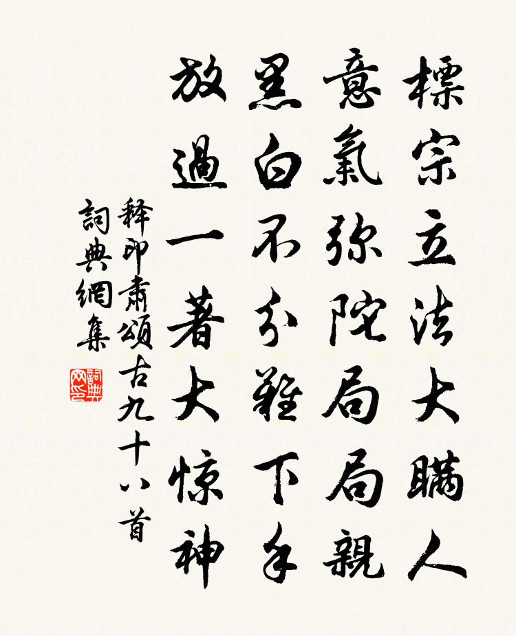 詩詞名句歷史字典書法欣賞書法字典國語詞典說文解字康熙字典古漢語字典標 題 作 者 詩 句 頌古九十八首作者:釋印肅 朝代:宋代頌古九十八首原文標宗立法大瞞人,意氣彌陀局局親。黑白不分難下手,放過一著大驚神。詩詞問答問:頌古九十八首的作者是誰?答:釋印肅問:頌古九十八首寫於哪個朝代?答:宋代釋印肅頌古九十八首書法欣賞頌古九十八首書法作品詩詞推薦保全寺江景房〔宋代〕擾擾塵埃白日忙,偶然來謁贊公房。行登峻岭躋攀倦,坐俯清泉笑傲涼。林靜鳥聲酬客語,風來花氣逐人香。此時禪寂之所有賣花聲出廊廡間清婉動耳孫惟信〔宋代〕曲巷深房憶帝州,賣花庭宇最風流。窗紗破曉斜開扇,簾繡籠陰半上鉤。少日喜拈春在手,暮年羞戴雪盈頭。泉南初發江陵有懷張九齡〔唐代〕極望涔陽浦,江天渺不分。扁舟從此去,鷗鳥自為群。他日懷真賞,中年負俗紛。適來果微尚,倏爾會斯文。復想感舊絕句陸游〔宋代〕南市夜夜上元燈,西鄰日日是清明。青氈犢車碾花去,黃金馬鞭穿柳行。編集拙詩成一十五卷因題卷末戲贈元九、李二十白居易〔唐代〕一篇長恨有風情,十首秦吟近正聲。每被老元偷格律,苦教短李伏歌行。世間富貴應無分,身後文章合有名。莫怪嶺雲梅堯臣〔宋代〕片雨過青天,山雲歸絕嶺。林際隱微虹,溪中落行影。還看隴首飛,復愛山間靜。南歌子(時方自僉廳會議催科,事罷即作此游)姚述堯〔宋代〕誤入紅蓮幕,來依玉樹叢。也將塵跡寄東風。忙裡偷閒同到、此山中。迥野韶華麗,晴嵐秀色鍾。憑高凝望倦扶筇冬日雜書六首張耒〔宋代〕地僻秋將老,山深客未歸。閉門朝對雨。搜篋冷添衣。圖暗經陰畫,琴昏在匣徽。妻孥慣山藪,不復問珠璣。夏日三首·其一張耒〔宋代〕長夏村墟風日清,檐牙燕雀已生成。蝶衣曬粉花枝舞,蛛網添絲屋角晴。落落疏簾邀月影,嘈嘈虛枕納溪聲。久斑思親歌朱元璋〔明代〕苑中高樹枝葉雲,上有慈烏乳雛勤。雛翎少乾呼教飛,騰翔啞啞朝與昏。有時力及隨飛去,有時不及枝記憶體。呼來真州元夕和韻二首李壁〔宋代〕通宵風撼天,清曉雪壓蓬。蒼茫煙海涯,寂寞葭葦叢。龍驤水犀手,有亦安所事。洪波絳鼉翻,陰穴翠螭睡。孰能壽昌劉克莊〔宋代〕山路泥深雪未乾,病身初怕浙西寒。新年檯曆無人寄,且就村翁壁上看。贈羽人二首張嵲〔宋代〕清晨叩齒誦黃庭,絳闕珠宮會眾靈。齋罷藥爐深炷火,戲攀庭樹作熊經。宴曹王宅錢起〔唐代〕賢王駟馬退朝初,小苑三春帶雨餘。林沼蔥蘢多貴氣,樓台隱映接天居。仙雞引敵穿紅藥,宮燕銜泥落綺疏。自嘆種梅李龍高〔宋代〕別嶺移根置小園,半鋤明月半鋤雲。世間下是無花卉,若個清高得似君。謝友人見訪留詩懷楚〔唐代〕軒車誰肯到,泉石自相親。暮雨凋殘寺,秋風悵望人。庭新一片葉,衣故十年塵。賴有瑤華贈,清吟愈病身。破子清平樂/清平樂王安中〔宋代〕煙雲千里。一抹西山翠。碧瓦紅樓山對起。樓下飛花流水。錦堂風月依然。後池蓮葉田田。縹緲貫珠歌里,從容倒喜遷鶯張繼先〔宋代〕情纏識縛,歡時人不悟,酒中真樂。縱慾招愆,迷心失行,卻道為他狂藥。須信醉舞狂歌,也有良知真覺。無倚泊道室試筆陸游〔宋代〕浮雲萬事不到眼,千歲人間心尚孩。屏風疊下看花落,扇子峽中聞雪來。水調歌頭(和平湖)趙磻老〔宋代〕梅仙了無訟,拄笏看西山。山涵秋曉,水光磨盪有無間。自是靈襟空洞,更望風雲吞吐,浩渺白鷗閒。高誦遠遊賦名句推薦一言足以召大禍,故古人守口如瓶,惟恐其覆墜也王永彬《圍爐夜話·第四八則》 其進銳者,其退速。孟子《孟子·盡心章句上·第四十四節》 一道鵲橋橫渺渺,千聲玉佩過玲玲。徐凝《七夕》 少婦今春意,良人昨夜情。沈佺期《雜詩三首·其三》 重到故鄉交舊少,淒涼。卻恐它鄉勝故鄉。陸游《南鄉子·歸夢寄吳檣》 童子柳陰眠正著,一牛吃過柳陰西。楊萬里《桑茶坑道中》 冰炭不同器而久,寒暑不兼時而至韓非及後人《韓非子·顯學》 飛鳥沒何處,青山空向人。劉長卿《餞別王十一南遊》 問姓驚初見,稱名憶舊容。李益《喜見外弟又言別》 況屈指中秋,十分好月,不照人圓。辛棄疾《木蘭花慢·滁州送范倅》