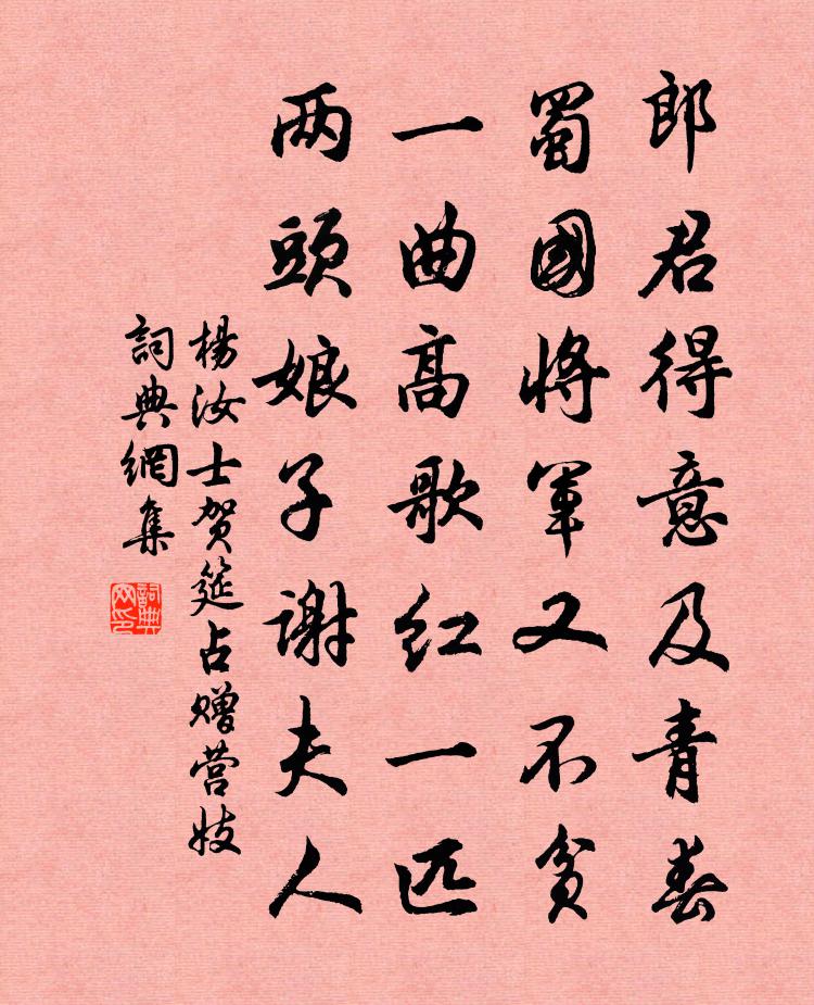詩詞名句歷史字典書法欣賞書法字典國語詞典說文解字康熙字典古漢語字典標 題 作 者 詩 句 賀筵占贈營妓作者:楊汝士 朝代:唐代賀筵占贈營妓原文郎君得意及青春,蜀國將軍又不貧。一曲高歌紅一匹,兩頭娘子謝夫人。詩詞問答問:賀筵占贈營妓的作者是誰?答:楊汝士問:賀筵占贈營妓寫於哪個朝代?答:唐代問:賀筵占贈營妓是什麼體裁?答:七絕楊汝士賀筵占贈營妓書法欣賞賀筵占贈營妓書法作品注釋全唐詩:卷484-10詩詞推薦和奚山偃松蘇頌〔宋代〕亂枝轇轕翠陰圓,倚岫垂崖盡偃然。不為深根生觸石,定應高幹上摩天。句王琪〔宋代〕誰將水調歌秋雁,不遣君王待曲終。反艷歌曲復三山林斗南五邁〔宋代〕誰作艷歌曲,律清語不塵。雜之古樂府,意態甚迫真。謂余欠嫵媚,宜為眾女嗔。方憐長門閉,漸喜湯沐新。此曲離觴不醉,至驛卻寄相送諸公柳宗元〔唐代〕無限居人送獨醒,可憐寂寞到長亭。荊州不遇高陽侶,一夜春寒滿下廳。次及甫即事洪咨夔〔宋代〕萬里西征路,同君汗漫期。吳歈花裹曲,楚些菊邊詞。問學千雞跖,功名五羖皮。目前姑置此,多辦峽江詩。僧舍小池張鼎〔唐代〕引出白雲根,潺潺漲蘚痕。冷光搖砌錫,疏影露枝猿。淨帶凋霜葉,香通洗藥源。貝多文字古,宜向此中翻。謝高左藏惠墨竹趙汝績〔宋代〕幅箋幻墨起秋風,便與蘭亭景致同。料得揮毫盤礴際,渭川千畝在胸中。酬張進彥見寄王之道〔宋代〕皇華應記去年曾,六轡馳驅問固陵。道路向來荒枳棘,堤封從昔錯溝塍。煙銷列嶂秋光遠,木落長淮霽色澄。自笑古詩十九首·庭中有奇樹佚名〔兩漢〕庭中有奇樹,綠葉發華滋。攀條折其榮,將以遺所思。馨香盈懷袖,路遠莫致之。此物何足貢?但感別經時。聽妓洞雲歌布燮〔唐代〕嵇叔夜,鼓琴飲酒無閒暇。若使當時聞此歌,拋擲廣陵都不藉。劉伯倫,虛生浪死過青春。一飲一碩猶自醉,無人謝潘端叔惠紅梅樓鑰〔宋代〕不學江頭玉樹寒,壽陽紅粉舊妝殘。嬋娟可是慙隨俗,莫作金沙鎖骨看。漁家傲梵琦〔元代〕聽說西方無量樂。長生不假神仙藥。胎就眼開花正拆。心彰灼。永為自在逍遙客。來度眾生離火宅。命終免被閻王點絳唇張掄〔宋代〕昨夜東風,又還吹遍閒花草。翠輕紅小。觸處驚春早。草舍茅□,□□□□□。誰□□。□□丹灶。別有陽和□。題孫舜俞府判瑞石圖楊萬里〔宋代〕雞冠山青龜浦碧,松桂梢雲三萬尺。何年星霣化為石,風吹木凝冰玉色。仙人擘開光燭天,山下人家夜不眠。松花廬山雜興二首董嗣杲〔宋代〕新橋迤邐去,勝跡遺仙佛。想像名勝游,題字尚仿佛。失笑我仆痡,偃息松鬱郁。絕景借雲掩,野香趁風拂。看山與樂道約會超化寺比至樂道以疾先歸途中有詩司馬光〔宋代〕顛毛種種齒浮搖,屈指交遊漸寂寥。時較半朝非是晚,路無數里不為遙。子猷垂到復歸去,安道雖知未易邀。古寺再會夏石芝宋伯仁〔宋代〕自與君相別,駸駸已數年。一緘書不寄,千里夢徒然。雨店花新長,風欞月幾圓。嶺梅無恙否,愁滿鬢絲邊。六親五法佚名〔先秦〕以家為鄉,鄉不可為也;以鄉為國,國不可為也;以國為天下,天下不可為也。以家為家,以鄉為鄉,以國為國,減字木蘭花(冬至)阮閱〔宋代〕曉雲舒瑞。寒影初回長日至。羅襪新成。更有何人繼後塵。綺窗寒淺。盡道朝來添一線。秉燭須游。已減銅壺昨夜元宵煮浮圓子前輩似未嘗賦此坐間成四韻周必大〔宋代〕今夕知何夕,團圓事事同。湯官尋舊味,灶婢詫新功。星燦烏雲里,珠浮濁水中。歲時編雜詠,附此說家風。名句推薦榮以榮人者榮,禍以禍人者禍。來俊臣《羅織經·瓜蔓卷第十二》 壚邊人似月,皓腕凝霜雪。韋莊《菩薩蠻·人人盡說江南好》 君安游兮西入秦,願為影兮隨君身。傅玄《車遙遙篇》 河水縈帶,群山糾紛。李華《弔古戰場文》 青山欲共高人語。聯翩萬馬來無數。辛棄疾《菩薩蠻·金陵賞心亭為葉丞相賦》 以子之矛,陷子之盾韓非及後人《韓非子·難一》 天清一雁遠,海闊孤帆遲。李白《送張舍人之江東》 無端更渡桑乾水,卻望并州是故鄉。劉皂《旅次朔方 / 渡桑乾》 人不可貌相,海水不可斗量。馮夢龍《醒世恆言·卷三》 汀洲無浪復無煙,楚客相思益渺然。劉長卿《自夏口至鸚鵡洲夕望岳陽寄源中丞》