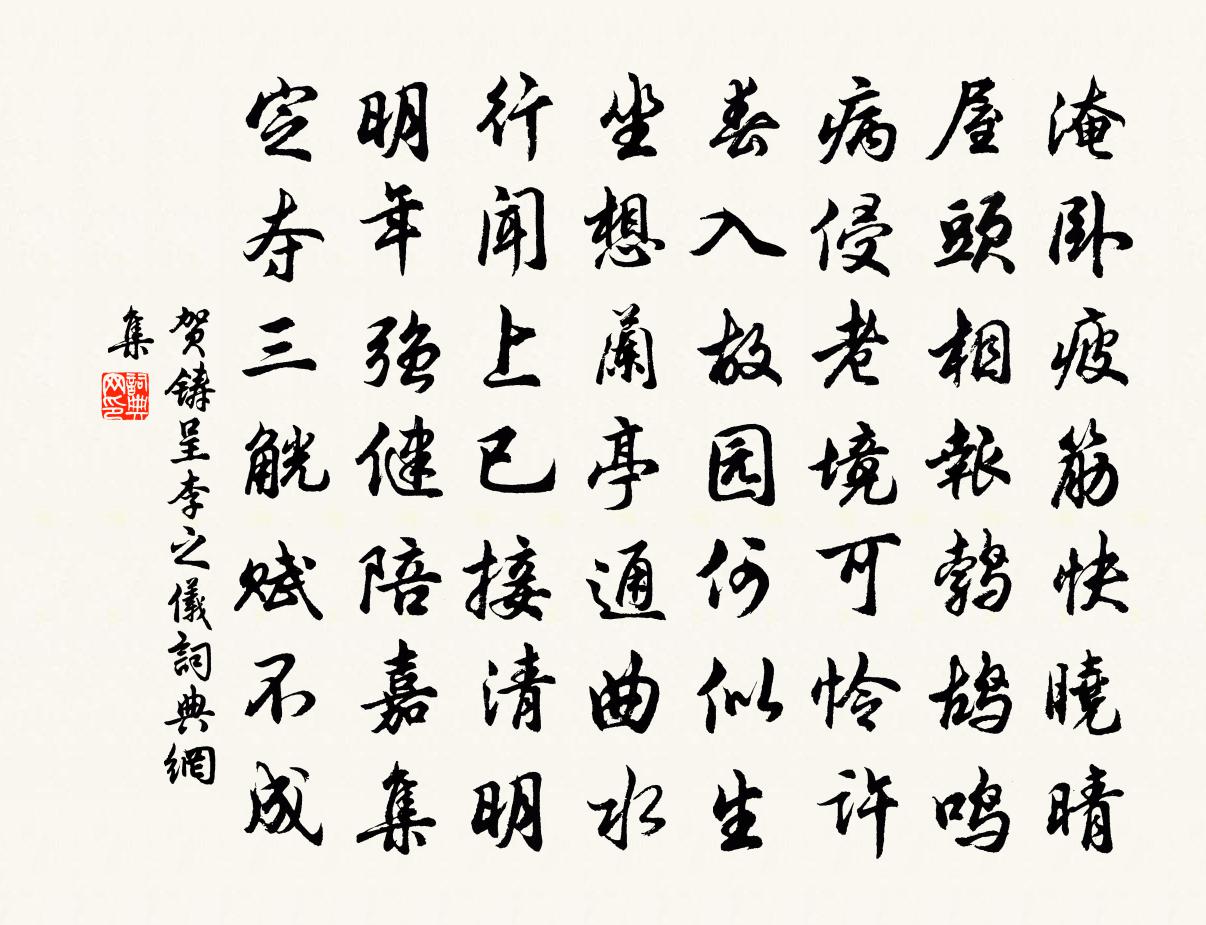 詩詞名句歷史字典書法欣賞書法字典國語詞典說文解字康熙字典古漢語字典標 題 作 者 詩 句 呈李之儀作者:賀鑄 朝代:宋代呈李之儀原文淹臥疲筋快曉晴,屋頭相報鵓鴣鳴。病侵老境可憐許,春入故園何似生。坐想蘭亭通曲水,行聞上已接清明。明年強健陪嘉集,定奪三觥賦不成。詩詞問答問:呈李之儀的作者是誰?答:賀鑄問:呈李之儀寫於哪個朝代?答:宋代問:賀鑄的名句有哪些?答:賀鑄名句大全賀鑄呈李之儀書法欣賞呈李之儀書法作品詩詞推薦冬日旅懷羅鄴〔唐代〕烏焰才沈桂魄生,霜階擁褐暫吟行。閒思江市白醪滿,靜憶僧窗綠綺橫。塵土自憐長失計,雲帆尤覺有歸情。幾多九日登袁州宜春台祖無擇〔宋代〕落帽佳辰又到來,黃花爛熳為誰開。已經多歲衰容改,更被無情急景催。取次杯盤須盡醉,隨宜歌管任頻陪。卻慚小梅李龍高〔宋代〕小杜文章小李歌,詩名還有小東坡。莫欺一點丰姿瘦,著得清香儘自多。偶書林逋〔宋代〕一任塵欺古鹿盧,聖經窮爛更何圖。磻溪老叟能閒氣,八十封侯不似無。送錢承制赴廣西路分都監蘇軾〔宋代〕當年床我作表忠床碑,坐覺床江山氣未衰。舞鳳尚從天目下,收駒時有渥窪姿。踞床到處堪吹笛,橫槊何人解賦詩送冀州李團練宋祁〔宋代〕雪雲寒氣著離杯,道北輕風大旆開。太守直居千騎上,將軍仍自九天來。征鼙曲曲漁陽摻,後乘人人鄴下材。忠孝金陵即事錢秉鐙〔清代〕秋山無樹故崚嶒,幾度支筇未忍登。荒路行愁逢牧馬,舊交老漸變高僧。鐘樓自吼南朝寺,佛塔還燃半夜燈。莫向緣識宋太宗〔宋代〕不曾師受有文章,天與聰明作久長。道味自然玄境外,凡中奇異必非常。晚村鄭剛中〔宋代〕暑雨霽餘飛,翻溝水鳴玉。半規入嵐霧,平疇愈新綠。時有牧歸牛,一備過山曲。吾廬附幽深,四面蔭修竹。垂雲夏日獨居陸游〔宋代〕平生本清淨,垂老更蕭然。已罷客載酒,亦無僧說禪。空庭朝下鵲,密樹晚鳴蟬。長日君無厭,新秋近眼邊。夜泊劉口雨連明有懷成勻趙蕃〔宋代〕山中風雨夕,招要對床期。今夕風亦雨,牢落孤舟維。蓬窗與竹窗,蕭瑟雨在茲。不寐欲至曙,何繇夢見之。呈澤中明府董穎〔宋代〕能延倉卒客,不以在亡辭。錯倒蔡邕屣,初無匡鼎詩。病多殊怕酒,算少敢談棋。願見纖纖玉,經紅擘荔枝。寄臨汀推官盧伯壽二首曾豐〔宋代〕都下燈前別酒闌,我歸江國子閩關。鯉魚不賜書來去,蝴蝶猶將夢往還。抵掌伊吾灰壯志,折腰彭澤汗衰顏。十年偈頌八十五首釋妙倫〔宋代〕一夏九十日,今朝事已周。寒山逢拾得,把手話來由。且道個什麼,梨出青州,棗出鄭州。中秋月五首汪莘〔宋代〕萬派寒芒一道飛, * 盛處遠成圍。抱回紅日浴東井,橫截碧天朝太微。惟有中秋金正王,復當子夜水生肥。溶溶享太廟樂章李回〔唐代〕受天明命,敷祐下土。化時以儉,衛文以武。氛消夷夏,俗臻往古。億萬斯年,形於律呂。【中呂】山坡羊_別懷衣松羅張可久〔元代〕別懷衣松羅扣,塵生鴛甃,芳容更比年時瘦。看吳鉤,聽秦謳,別離滋味今番又,湖水藕花堤上柳。颼,渾是秋;樗寮字阿彌陀經書偈送最明寺殿釋普寧〔宋代〕我有大經卷,量等三千界。親付最明殿,祝壽如滄海。但願得此經,當下明此心。的知胡達磨,元不在少林。憶窊石章氏女子仇遠〔宋代〕湖樹江雲隔杳冥,千峰萬壑夢中青。懸知茅屋孤燈下,逐字教兒讀孝經。浣溪沙(次李茂叔韻)郭應祥〔宋代〕仙子凌波襪有塵。翰林摛藻筆如神。此花此曲兩無倫。不與妝檯簪寶髻,卻來書閣伴幽人。恨無佳客只空尊。名句推薦夜戰桑乾北,秦兵半不歸。許渾《塞下曲》 舞殿冷袖,風雨淒淒。杜牧《阿房宮賦》 冰合井泉月入閨,金缸青凝照悲啼。李白《夜坐吟》 天地之大也,人猶有所憾。故君子語大,天下莫能載焉,語小,天下莫能破焉。子思《中庸·第十二章》 吹燈窗更明,月照一天雪。袁枚《十二月十五夜》 桃李出深井,花艷驚上春。李白《中山孺子妾歌》 十里西疇熟稻香,槿花籬落竹絲長,垂垂山果掛青黃。范成大《浣溪沙·江村道中》 水風輕,蘋花漸老,月露冷、梧葉飄黃。柳永《玉蝴蝶·望處雨收雲斷》 寒山轉蒼翠,秋水日潺湲。王維《輞川閒居贈裴秀才迪》 見素抱樸,少私寡慾,絕學無憂。老子《老子·道經·第十九章》