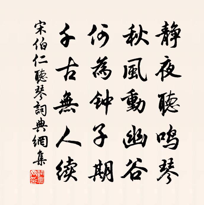 詩詞名句歷史字典書法欣賞書法字典國語詞典說文解字康熙字典古漢語字典標 題 作 者 詩 句 聽琴作者:宋伯仁 朝代:宋代聽琴原文靜夜聽鳴琴,秋風動幽谷。何為鍾子期,千古無人續。詩詞問答問:聽琴的作者是誰?答:宋伯仁問:聽琴寫於哪個朝代?答:宋代宋伯仁聽琴書法欣賞聽琴書法作品詩詞推薦送曹郎中南歸時南中用軍李洞〔唐代〕桂水淨和天,南歸似謫仙。系絛輕象笏,買布接蠻船。海氣蒸鼙軟,江風激箭偏。罷郎吟亂里,帝遠豈知賢。嘉熙戊戌季春一日畫溪吟客王子信為亞愚詩禪王諶〔宋代〕湘妃淚染竹根斑,風雨連朝下釣難。春浪急,石磯寒,買得茅柴味亦酸。梅花黃銖〔宋代〕玉簫吹徹北樓寒,野月崢嶸動萬山。一夜霜清不成夢,起來春信滿人間。賀鄭漕三首黃公度〔宋代〕東京望重兩儒先,經術傳農敗百看。派別九仙綿慶胄,運逢千載毓真賢。鼎槐未孥登三事,社桃何知托十天。壽考公擇失期未至再督以詩趙蕃〔宋代〕作詩有病誰與說,讀書有疑誰與決。思君只在百裡間,底事相望若胡越。阿連報君有來期,候君未至趣以詩。想因草陳景沂〔宋代〕淡煙荒草六朝宮,萬感叢生一眺中。不識群公互虓虎,獨於此地必爭熊。秦河濺淚西風泣,淮巘含羞晚照紅。醞得佛臨禪師贊釋紹曇〔宋代〕奸{二豕}頑蠻,更加白{左亻右幼}。文武火煨石要香,麻皮頭纏人必倒。五處開場弄活機,是龍程式天蛇竄草江西道院集戊申四月九日得請補外初出國門宿楊萬里〔宋代〕出卻金宮入梵宮,翠微綠霧染衣濃。三年不識西湖月,一夜初聞南澗鍾。藏室蓬山真昨戲,園翁溪友得今從。若非重送杜牧〔唐代〕手撚金僕姑,腰懸玉轆轤。爬頭峰北正好去,系取可汗鉗作奴。六宮雖念相如賦,其那防邊重武夫。吊屈原賦賈誼〔兩漢〕誼為長沙王太傅,既以謫去,意不自得;及度湘水,為賦以吊屈原。屈原,楚賢臣也。被讒放逐,作《離騷》賦,七溪陳均〔宋代〕為愛潺湲引步遲,不知行盡白雲西。雲深忘卻來時路,吟斷空山片月低。南歌子(郭小娘道裝)向子諲〔宋代〕縹緲雲間質,輕盈波上身。瑤林玉樹出風塵。不是野花凡草、等閒春。翠羽雙垂珥,烏紗巧制巾。經珠不動兩眉顰上明達皇后冊寶五首真宗〔宋代〕恭斂宜家,柔順承天。德昭彤管,尤在進賢。寮冊社翟,追榮壽原。四時裸享,何千萬年。送撫州通判袁世弼寺丞梅堯臣〔宋代〕帆疏疏,纖綠蒲,二十四幅輕江湖。高秋逆水上天去,朝過瓜步暮濡須。長風沙頊問鯉魚,大孤山側鳴寒烏。魚腹賞桂任希夷〔宋代〕金英翠葉庇靈根,吹作清秋寶篆熏。四客對花飛玉斝,八眉和葉舞紅裾。菩薩蠻晁補之〔宋代〕玉京不許塵容到。疏慵只合疏慵老。鷗鳥共煙波。田夫與醉歌。忘懷無物我。莫似陳驚坐。勳業付長閒。西山爽氣驀山溪(甲辰生日)張綱〔宋代〕小窗開宴,草草杯盤具。歡喜走兒童,慶生朝、一年一度。風光好處,恰是小春時,香泛泛,酒醺醺,一曲歌金縷沁園春趙通判〔宋代〕賀白文章,英衛規模,簪纓世家。更襟懷,芳潤光風齊月,筆端奇偉,春藻天葩。課最嚴城,升班清禁,蔽芾棠陰藍田溪與漁者宿錢起〔唐代〕獨游屢忘歸,況此隱淪處。濯發清泠泉,月明不能去。更憐垂綸叟,靜若沙上鷺。一論白雲心,千里滄洲趣。蘆中木闌花慢 蒲縣東神山廟柱石刻五首時至正辛邢叔亨〔元代〕監燕京馬哈馬拉尹鎮陽,揚從道尹晉,霍邑邢叔亨,簿鄉張時敏,仙尉襄陵陳德新,儒學論忻州王秉鈞,共祀岱嶽名句推薦折戟沉沙鐵未銷,自將磨洗認前朝。杜牧《赤壁》 無善而致人譽,不如無惡而致人毀。洪應明《菜根譚·概論》 蘭溪三日桃花雨,半夜鯉魚來上灘。戴叔倫《蘭溪棹歌》 春路雨添花,花動一山春色。秦觀《好事近·夢中作》 征馬分飛日漸斜,見此空為人所嗟。孟浩然《高陽池送朱二》 烽火城西百尺樓,黃昏獨上海風秋。王昌齡《從軍行七首》 如欲平治天下,當今之世,捨我其誰也。孟子《孟子·公孫丑章句下·第十三節》 水調數聲持酒聽。午醉醒來愁未醒。張先《天仙子·水調數聲持酒聽》 橫笛和愁聽,斜枝倚病看。崔道融《梅花》 脈脈廣川流,驅馬歷長洲。上官儀《入朝洛堤步月》