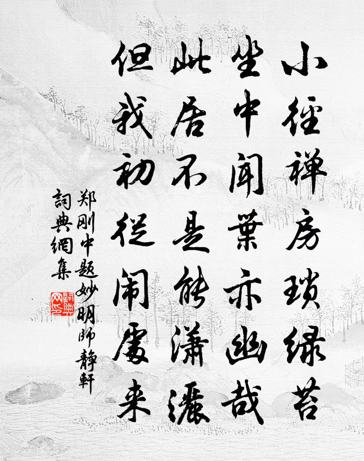 詩詞名句歷史字典書法欣賞書法字典國語詞典說文解字康熙字典古漢語字典標 題 作 者 詩 句 題妙明師靜軒作者:鄭剛中 朝代:宋代題妙明師靜軒原文小徑禪房瑣綠苔,坐中聞葉亦幽哉。此居不是能瀟灑,但我初從鬧處來。詩詞問答問:題妙明師靜軒的作者是誰?答:鄭剛中問:題妙明師靜軒寫於哪個朝代?答:宋代鄭剛中題妙明師靜軒書法欣賞題妙明師靜軒書法作品詩詞推薦賢者之孝二百四十首王陽林同〔宋代〕禮經稱孝子,不服闇登危。所以九折阪,回車不敢馳。義馬冢艾性夫〔宋代〕訴得冤伸意始休,敝帷埋骨幾經秋。獸心猶辦死報主,人面卻甘生事仇。作傳自應班豫讓,論功何止及留侯。世間訴衷情(中秋微雨,入夜開霽,呂履謙座上賦此)袁去華〔宋代〕曉來猶自雨冥冥。投晚卻能晴。姮娥為誰著意,洗得十分明。人自老,兔長生。酒徐傾。杯行到手,休更推辭,轉享太廟樂章李回〔唐代〕受天明命,敷祐下土。化時以儉,衛文以武。氛消夷夏,俗臻往古。億萬斯年,形於律呂。寄謝懷英高士陳傅良〔宋代〕聞君已得歸山請,顧我方當絕跡時。欲葺止齋猶未就,篋中應有草堂資。和吳沖卿學士石屏梅堯臣〔宋代〕吳夫,佩銀龜。乘天馬,索怪奇。忽得虢略一片石,其中白色圓如規。又有樹與烏,畫手雖妙何能為。吳乃持問歐龍鬚道中周必大〔宋代〕客勞田頭餉,渠憐馬上郎。作勞並罄控,未用別閒忙。偈頌二百零五首釋正覺〔宋代〕仲秋漸涼, * 放穩長連床。身心澄徹見淵底,河漢淡淡秋磨光。二祖不短,少林不長,相傳笑殺威音王。你無所薇山處過番石渡遭渡子無禮傷臂因韻二首陳著〔宋代〕臥如龍奮亮當貴,射可猿通廣欲飛。誰料舟人為敵國,只應山鳥怪儒衣。五鼓自簇橋入府陸游〔宋代〕曉月有餘光,秋樹無濃影。野煙浩無際,陂路行愈永。堰聲何澎湃,露氣正淒冷。忽然客愁破,更覺詩律整。昔人喜方溪復歸白雲釋行海〔宋代〕十載青燈自苦辛,懶將白眼顧浮塵。鳳聲偏近瑤台月,草色難連玉樹春。雲有去來非本意,世無榮辱是何人。幾番贈胡明府林逋〔宋代〕一琴牢落倚松窗,孤澹天君得趣長。謁廟有時封縣版,坐衙終日著公裳。為收牌印教村仆,偶檢圖書見古方。微足送雲遊瑩上人王義山〔宋代〕從前身不梁飛埃,雪竇雲峰任往來。石路滑時宜駐錫,浪頭危處且浮杯。眼高桑下肯三宿,腳健山中能萬回。四大和集賢相公西溪侍宴觀競渡吳融〔唐代〕片水聳層橋,祥煙靄慶霄。晝花鋪廣宴,晴電閃飛橈。浪疊搖仙仗,風微定彩標。都人同盛觀,不覺在行朝。詩阮瑀〔魏晉〕我行自凜秋。季冬乃來歸。置酒高堂上。友朋集光輝。念當復離別。涉路險且夷。思慮益惆悵。淚下沾裳衣。 送人之任邛州許渾〔唐代〕綠髮監州丹府歸,還家樂事我先知。群童竹馬交迎日,二老蘭觴初見時。黃卷新書芸委積,青山舊路菊離披。亨衢簡德允蘇泂〔宋代〕言歸四十日,兩度得尋君。貧病有諸子,情懷無半分。梅花年後雪,雁翅屋東雲。早晚扁舟興,能來與細論。和陶歸園田居六首蘇軾〔宋代〕新浴覺身輕,新沐感發稀。風乎懸瀑下,卻行詠而歸。仰觀江搖山,俯見月在衣。步從父老語,有約吾敢違。兵間曾鞏〔宋代〕大義缺絕久未圖,小人輕險何不至。世上固自有百為,兵間乃獨求一試。趙括敢將亦已危,李平請守那複議。吁嗟雙清閣詠雪黃伯固〔宋代〕箕伯宵聲怒,髽童早語咍。飛花先臘白,和氣覺春回。暗動雲都簇,先憑雨作媒。有情皆噤慘,無物不低催。闊灑名句推薦足以充虛繼氣,強股肱,耳目聰明,則止。墨子《墨子·21章 節用(中)》 飢則附人, 飽便高颺房玄齡《晉書·載記·第二十三章》 已駕七香車,心心待曉霞。李商隱《壬申七夕》 望時而待之,孰與應時而使之。荀子《荀子·天論》 春風十里揚州路,卷上珠簾總不如。杜牧《贈別》 成敗相因,理不常泰李大師、李延壽《南史·本紀·卷一》 金吾不禁夜,玉漏莫相催。蘇味道《正月十五夜》 荒村帶返照,落葉亂紛紛。劉長卿《碧澗別墅喜皇甫侍御相訪》 更無柳絮因風起,惟有葵花向日傾。司馬光《客中初夏》 聲一無聽,物一無文左丘明《國語·鄭語·史伯為桓公論興衰》