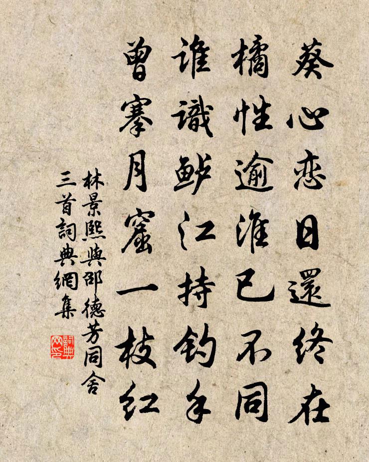 詩詞名句歷史字典書法欣賞書法字典國語詞典說文解字康熙字典古漢語字典標 題 作 者 詩 句 與邵德芳同舍三首作者:林景熙 朝代:宋代與邵德芳同舍三首原文葵心戀日還終在,橘性逾淮已不同。誰識鱸江持釣手,曾搴月窟一枝紅。詩詞問答問:與邵德芳同舍三首的作者是誰?答:林景熙問:與邵德芳同舍三首寫於哪個朝代?答:宋代林景熙與邵德芳同舍三首書法欣賞與邵德芳同舍三首書法作品詩詞推薦觀壁間鄭宣威早春賞杏花之作司令洪太命余即程公許〔宋代〕過雨麴塵繰淺綠,倚風綬帶娜殷紅。稍知春在酒深處,尤覺日長書課中。典記誤令參鄧下,封囊也擬學新豐。黃去和潭俯張朝請行縣言懷楊時〔宋代〕夾道旌麾動,陰霾萬里開。霜迎威令肅,春逐馬蹄來。幽壑光初滿,寒荄暖自回。仰窺嵩華質,曾未施纖埃。赫曦台四景中宵皓月熊禾〔宋代〕赫曦日夕真奇絕,最好中秋看明月。竦身飛上第一峰,不覺清寒近天闕。初離海角猶朦朧,行到天心轉光潔。今宵巡衣錦軍制還鄉歌錢鏐〔唐代〕三節還鄉兮掛錦衣,碧天朗朗兮愛日暉。功成道上兮列旌旗,父老遠來兮相追隨。家山鄉眷兮會時稀,今朝設宴兮泛宮亭湖劉刪〔宋代〕回乘一派水,舉帆逐分風。孤石蒼波裹,岸山苦霧中。村舍雜書陸游〔宋代〕舍北作蔬圃,敢辭灌溉勞。輪囷瓜瓠熟,珍愛敵豚羔。晨餐戒廚人,全項淨去毛。雖雲發客笑,亦足慰老饕。東園醉望暮山楊萬里〔宋代〕我住北山下,南山橫我前。北山似懷抱,南山如髻鬟。懷抱冬獨暖,髻鬟春最鮮。松鬈沐初淨,山蘤插更妍。我來頌古釋道顏〔宋代〕眼中見慣是尋常,又不驚人又久長。留得寒窗夜來月,三更依舊照茅堂。送范景仁正議致政歸潁昌王珪〔唐代〕十年漢殿辭榮去,潁水今歸作故鄉。曾賦洞簫真蜀客,能吟夜雨勝何郎。放懷雲外追黃鵠,別夢春深過玉堂。可惜偈頌十七首釋智愚〔宋代〕金碑刮膜,自病難醫。利劍揮空,逃蹤莫及。何以橫拈塵尾,抑挫來機。殺活雖殊,對揚有淮,什麽人得此三味。偶得趙希邁〔宋代〕舊日看山古渡頭,村深無馬但騎牛。如今身被微官縛,欲要騎牛不自由。九日分韻得寒字魏了翁〔宋代〕奇月 * 必用重, * 誰與開其 * 端。貴陽 * 而賤陰,於此亦可觀。況於五陰後,蒼龍掛高寒。林疏山骨瘦,水龍吟(徐仲晦、方蒙仲各和余去歲笛字韻為壽,戲答二君)劉克莊〔宋代〕行藏自決於心,不消謀及門前客。平生慕用,著書玄晏,掛冠貞白。帝獎孤高,別加九錫,一筇雙屐。更賜之車服即事晁說之〔宋代〕幾歲田園得隱淪,忍將秋淚濕紅塵。一麾不得廬山去,何用他州寄此身。暇日約諸友生飯於石泉以講居貧這策樞密富丈李彌遜〔宋代〕廣文負才名,閉戶從莫乾。長安不肯近,詎肯卑小官。爨無欲清人,日昃未及餐。借書紛滿席,不顧坐客寒。欺人摸魚子許有孚〔元代〕買陂花塘旋栽楊花柳,閒人花有此忙務。平泉綠野吾無羨,僅看一蓑煙雨。舟泊渚。更把釣觀魚,宛在池中嶼。掀捧佛安名釋了惠〔宋代〕名正安亦正,形端景亦瑞。呼來並諾去,驢屎雜栴檀。去草韓元吉〔宋代〕永日荒園獨荷鋤,草根藤蔓喜無餘。誰憐仲舉平生志,卻學齊民種樹書。行童搬土釋印肅〔宋代〕童子聚沙為佛塔,而今搬土豈無功。忽然覺後知非土,當處回頭識本宗。老僧念你善根微,所以教伊不失時。朝歌送吳子隆節推之官信州五首陳造〔宋代〕行行幕府泛蓮初,井井官曹遊刃餘。當路急賢饑渴似,不須銜袖子公書。名句推薦盛事惟忠,庸則自從。來俊臣《羅織經·控權卷第四》 若問相思甚了期,除非相見時。晏幾道《長相思·長相思》 但責己,不責人,此遠怨之道也;但信己,不信人,此取敗之由也。王永彬《圍爐夜話·第八五則》 天秋木葉下,月冷莎雞悲。李白《秋思》 竹徑通幽處,禪房花木深。常建《題破山寺後禪院》 有約不來過夜半,閒敲棋子落燈花。趙師秀《約客》 行雲歸楚峽,飛夢到揚州。晁補之《臨江仙·綠暗汀洲三月暮》 春生、夏長、秋收、冬藏,天之正也王詡《鬼谷子·持樞》 夏條綠已密,朱萼綴明鮮。韋應物《夏花明》 水色淥且明,令人思鏡湖。李白《登單父陶少府半月台》