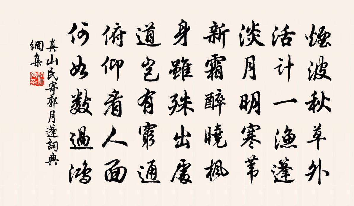 詩詞名句歷史字典書法欣賞書法字典國語詞典說文解字康熙字典古漢語字典標 題 作 者 詩 句 寄郭月篷作者:真山民 朝代:宋代寄郭月篷原文煙波秋草外,活計一漁篷。淡月明寒葦,新霜醉曉楓。身雖殊出處,道豈有窮通。俯仰看人面,何如數過鴻。詩詞問答問:寄郭月篷的作者是誰?答:真山民問:寄郭月篷寫於哪個朝代?答:宋代真山民寄郭月篷書法欣賞寄郭月篷書法作品詩詞推薦沖雨向萬載道中得逍遙觀托宿遂戲題黃庭堅〔宋代〕逍遙近道邊,憩息慰憊懣。晴暉時晦明,謔語諧讜論。草萊荒蒙蘢,室屋壅塵坌。僕僮偪側泌,涇渭清濁混。故梁國公主池亭王建〔唐代〕平陽池館枕秦川,門鎖南山一朵煙。素柰花開西子面,綠榆枝散沈郎錢。裝檐玳瑁隨風落,傍岸??逐暖眠。寂寞憶仙姿(九之六)賀鑄〔宋代〕柳下玉驄雙鞚。蟬鬢寶鈿浮動。半醉倚迷樓,聊送斜陽三弄。豪縱。豪縱。一覺揚州春夢。斛律丞相司馬光〔宋代〕君臣日荒宴,歌舞諱言愁。老相猶當國,疆鄰不敢謀。謠言雖未出,奸謗已先流。誰察忠臣意,通宵抱膝憂。句錢易〔宋代〕莫嘆鬢如雪,且教心似灰。鼠狼二首釋寶曇〔宋代〕謾自狼貪只鼠嗔,壞牆穿壁已無鄰。兒童愛惜貍奴慣,生怪蒼皇不近人。次韻傅茂元二絕劉子翬〔宋代〕酒興何如畢吏部,詩情已過鮑參軍。醉吟自足了一世,肯羨飄飄出岫雲。鷓鴣天(為老母壽)張孝祥〔宋代〕阿母蟠桃不記春。長沙星里壽星明。金花羅紙新裁詔,貝葉旁行別授經。同犬子,祝龜齡。天教二老鬢長青。明年水調歌頭(送太守王秉)辛棄疾〔宋代〕酒罷且勿起,重挽史君須。一身都是和氣,別去意何如。我輩情鍾休問,父老田頭說尹,淚落獨憐渠。秋水見毛髮晏齋余自名也故常以榜自隨乃以名廳事之東偏趙蕃〔宋代〕容膝徒知取易安,容君數百又何寬。若人問我名齋義,兩語從渠作麽看。效孟浩然體寄呈邦憲明府吳頤〔宋代〕繆致棲鸞嘆,頻煩薦鶚書。未能拋斗米,豈不愛吾廬。與世多乖迕,論才信闊疏。故人應笑我,早晚遂歸歟。送高景仁之廣德連文鳳〔宋代〕不愁離別難,江浙片雲間,黃葉晚秋徑,白茅深處山。有詩連夢遠,無累得身間。若遇西風便,安書寄雁還。送京運使赴召二首趙蕃〔宋代〕不官不恨落羇縻,正謂邊頭獄訟稀。但有膠膠還擾擾,略無是是與非非。詩書舊學渾忘卻,夢寐衡祠放得歸。邂逅公肅在東南三有書來未報聞其除司直以詩寄賀史堯弼〔宋代〕小試猶為天下平,惠文柱後要無刑。從今準擬子張傳,吾世常司汗簡青。謝新胥口監生趙立之程公許〔宋代〕魯壁嶧碑遠莫睹,艱哉河流訊鞀鼓。披荒摸搭不厭多,繙閱端能助稽古。向來四壁風雨秋,誰遣彯纓群玉府。終年宴張別駕新齊孟浩然〔唐代〕世業傳圭組,江城佐股肱。高齋征學問,虛薄濫先登。講論陪諸子,文章得舊朋。士元多賞激,衰病恨無能。閒居書事杜荀鶴〔唐代〕竹門茅屋帶村居,數畝生涯自有餘。鬢白只應秋鍊句,眼昏多為夜抄書。雁驚風浦漁燈動,猿叫霜林橡實疏。待得月明許月卿六〔宋代〕月明如晝好元農,歌管樓台景色饒。鶴舞琴聲相應答,梅花清福共誰消。題朱林修塵外樓圖杜濬〔清代〕芳草無邊似綠江,高樓臨眺客愁降。向東一面尤奇絕,盡放鐘山入小窗。送南屏謙師蘇軾〔宋代〕道人曉出南屏山,來試點茶三昧手。忽驚午盞兔毛斑,打作春瓮鵝兒酒。天台乳花世不見,玉川風腋今安有。先生名句推薦帝里重清明,人心自愁思。孟浩然《清明即事》 不鏡於水,而鏡於人,則吉凶可鑑也王永彬《圍爐夜話·第五二則》 一日不作,百日不食。司馬遷《史記·三十世家·趙世家》 淚眼問花花不語,亂紅飛過鞦韆去。歐陽修《蝶戀花·庭院深深深幾許》 讓利精於取利,逃名巧於邀名。陳繼儒《小窗幽記·集靈篇》 飛蓬各自遠,且盡手中杯。李白《魯郡東石門送杜二甫》 寒山幾堵,風低削碎中原路,秋空一碧無今古。陳維崧《醉落魄·詠鷹》 千步虹橋,參差雁齒,直趨水殿。柳永《破陣樂·露花倒影》 不管煙波與風雨,載將離恨過江南。鄭文寶《柳枝詞》 一派青山景色幽, 前人田地後人收。范仲淹《書扇示門人》
