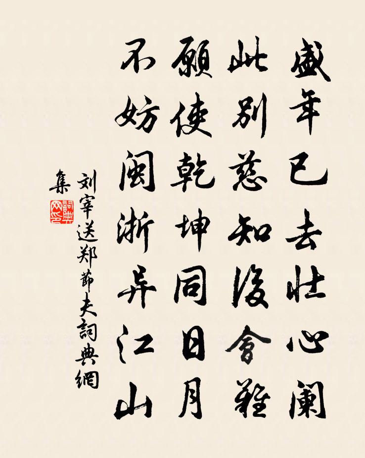詩詞名句歷史字典書法欣賞書法字典國語詞典說文解字康熙字典古漢語字典標 題 作 者 詩 句 送鄭節夫作者:劉宰 朝代:宋代送鄭節夫原文盛年已去壯心闌,此別慈知後會難。願使乾坤同日月,不妨閩浙異江山。詩詞問答問:送鄭節夫的作者是誰?答:劉宰問:送鄭節夫寫於哪個朝代?答:宋代劉宰送鄭節夫書法欣賞送鄭節夫書法作品詩詞推薦挽漳守鄭都承子敬四首王邁〔宋代〕饕相當朝舞大權,故將旌節博金錢。公嘗勇去三千石,天與閒居十六年。清苦膏粱餘子笑,孤高雲水一僧然。如何題鄧保章真二首曾豐〔宋代〕舊以書生新保章,衣冠法合改其常。中年不覺青衫好,暇日寧從野服強。過釣台姜特立〔宋代〕兩山夾青蒼,月照江茫茫。一杯酌老婦,孤興發滄浪。賢哉羊裘公,不肯仕漢光。冥鴻已高翔,弋者應相忘。曲江陪鄭八丈南史飲杜甫〔唐代〕雀啄江頭黃柳花,??鸂鶒滿晴沙。自知白髮非春事,且盡芳尊戀物華。近侍即今難浪跡,此身那得更無家。丈人殘菊秋瑾〔清代〕嶺梅開後曉風寒,幾度添衣怕倚欄。殘菊猶能傲霜雪,休將白眼向人看。舟中即事楊萬里〔宋代〕阿翁阿囝自相隨,賞遍江淮春盛時。熊白同嘗臘前酒,雌黃自改曉間詩。醉來忽笑天地窄,老去那能兒女悲。身後九日晦日登烽火山林亦之〔宋代〕興來走上烽火山,著足不定秋風寒。四邊黃茅滑如雨,低頭一看毛髮豎。幾年要到紫菜鄉,大練小練並東牆。如今念奴嬌鄭域〔宋代〕素肌瑩淨,隔鮫綃貼襯,猩紅妝束。火傘飛空熔不透,一塊玲瓏冰玉。破暑當筵,褪衣剝帶,微露真珠肉。中心些次韻水心端午思遠樓小集戴栩〔宋代〕眾嫭容獨愧,孤正思群傾。何必遠者思,今古同一情。土方慕潔修,各心好自縈。一旦履華膴,爭奪遺世名。梟獍次韻和宋中道再寄梅堯臣〔宋代〕鴻鴈北來聲甚悲,黃昏野雀相併枝。是時靜默月色淡,摵摵風草搖枯衰。夜深扣門兵卒至,八行文字曾無奇。書尾書懷感事寄梅聖俞歐陽修〔宋代〕相別始一歲,幽憂有百端。乃知一世中,少樂多悲患。每憶少年日,未知人事艱。顛狂無所閡,落魄去◇牽。三月幽芳晚涼倚窗觀稼洪咨夔〔宋代〕飛明一點上苗端,難作尋常露雨看。碧眼道人參解得,黃河夜半泝崑崙。和天休龍圖經句署懷舊憶道卿舍人並見寄宋祁〔宋代〕諷書小史非新至,比舍名郎半昔游。君算青雲多少地,三年來作北平侯。送三傳赴長城尉(一作送前輩讀三傳任長城尉)張喬〔唐代〕登科精魯史,為尉及良時。高論窮諸國,長才並幾司。地傾流水疾,山疊過雲遲。暇日琴書畔,何人對手棋。離亭燕·一帶江山如畫張昪〔宋代〕一帶江山如畫,風物向秋瀟灑。水浸碧天何處斷?霽色冷光相射。蓼嶼荻花洲,掩映竹籬茅舍。雲際客帆高掛,煙次韻關令送魚蘇軾〔宋代〕舉網驚呼得巨魚,饞涎不易忍流酥。更煩赤腳長須老,來趁西風十幅蒲。村舍唐仲友〔宋代〕草色紅泉井,桐陰白板扉。徘徊不忍去,坐待白雲歸。懷友黃庚〔宋代〕柴門春事盡,未見故人來。樹密鳥相語,山空花自開。傾心多日別,屈指幾時回。為問頻書札,何時共酒杯。和張簿韻張嵲〔宋代〕平昔志升車,年來但芒屨。前旬返城邑,宵旦未逾數。及茲復入山,始覺離亂苦。行行望遠峰,山村猶幾許。風清胡祕丞知潯州楊億〔宋代〕蘭台進秩通閨籍,熊軾臨民奉詔條。風俗重尋南越志,鄉關猶隔浙江潮。懸知坐嘯謳謠洽,更想行春意氣饒。遠宦名句推薦孤燈不明思欲絕,卷帷望月空長嘆。李白《長相思·其一》 今日樓台鼎鼐,明年帶礪山河辛棄疾《西江月·堂上謀臣尊俎》 朔風吹雪透刀瘢,飲馬長城窟更寒。盧汝弼《和李秀才邊庭四時怨·其四》 泥上偶然留指爪,鴻飛那復計東西。蘇軾《和子由澠池懷舊》 花光濃爛柳輕明,酌酒花前送我行。歐陽修《別滁》 長風連日作大浪,不能廢人運酒舫。元結《石魚湖上醉歌》 身既死兮神以靈,魂魄毅兮為鬼雄。屈原《國殤》 陽月南飛雁,傳聞至此回。宋之問《題大庾嶺北驛》 關山萬里不可越,誰能坐對芳菲月。盧思道《從軍行》 玉座猶寂寞,況乃妾身輕。謝朓《同謝諮議詠銅雀台》