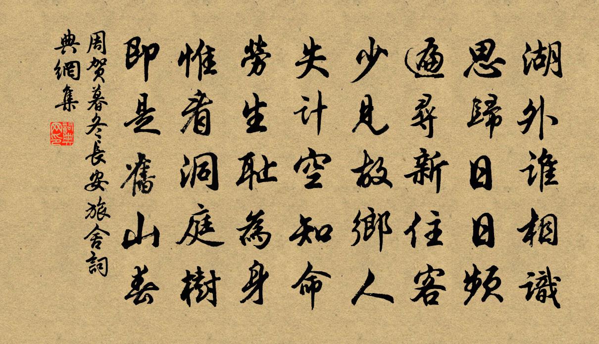 詩詞名句歷史字典書法欣賞書法字典國語詞典說文解字康熙字典古漢語字典標 題 作 者 詩 句 暮冬長安旅舍作者:周賀 朝代:唐代暮冬長安旅舍原文湖外誰相識,思歸日日頻。遍尋新住客,少見故鄉人。失計空知命,勞生恥為身。惟看洞庭樹,即是舊山春。詩詞問答問:暮冬長安旅舍的作者是誰?答:周賀問:暮冬長安旅舍寫於哪個朝代?答:唐代問:暮冬長安旅舍是什麼體裁?答:五律周賀暮冬長安旅舍書法欣賞暮冬長安旅舍書法作品注釋全唐詩:卷503-14詩詞推薦送海棠與姚令威王之望〔宋代〕酣酣芳意不勝春,一笑嫣然惱 * 。分寄多情還解否,要教國色在東鄰。用晦翁十梅詩韻酬張伯修孫子直吳泳〔宋代〕書消燕日長,棋遣花院寂。何羨山中人,餐霞拾橡實。銅雀妓蔡襄〔宋代〕十五燒香繐帳前,幾多幽怨入危弦。誰知千載台傾後,何處西陵有墓田。句何逢原〔宋代〕江流不復三峽險,天際自此中州寬。寄高善勝趙某〔宋代〕雨窗思昔日,不見半年余。別後幾回夢,中間三寄書。兵戈吾倖免,蹤跡爾何如。世事難如意,同心卻異居。詠梅趙崇嶓〔宋代〕大雅終不群,古心應自許。對之鄙吝消,疑是黃叔度。送鄔傪之洪州覲兄弟皎然〔唐代〕年少足詩情,西江楚月清。書囊山翠濕,琴匣雪花輕。久別經離亂,新正憶弟兄。贈君題樂府,為是豫章行。傷世呂渭老〔宋代〕塵斷徵車杳,雲低毳帳深。古今那有此,天地亦何心。八月六日送鞏帥郵亭上曾豐〔宋代〕有時夜燕歸乘月,未始晨興出戴星。半載初逢迎送事,五更已至短長亭。和馮叔炎梅桂二首釋道璨〔宋代〕色香俱第一,知已是華光。風味嫌膚淺,精神貴斂藏。一生雖抱獨,千古卻流芳。若論調羹事,還他一日長。次韻答提刑王朝奉席上看梅見貽韓維〔宋代〕誠已從來不問天,肯將衰白慕華軒。調羹豈是山翁事,只合看花對酒樽。鷓鴣天辛棄疾〔宋代〕一片歸心擬亂雲,春來諳盡惡黃昏。不堪向晚檐前雨,又待今宵滴夢魂。爐燼冷,鼎香氛,酒寒誰遣為重溫?何人首尾吟邵雍〔宋代〕堯夫非是愛吟詩,為見興衰各有時。天地全功鬚髮露,朝廷盛美在施為。便都默默奈何見,若不云云那得知。事在過廣安吊張才叔諫議陸游〔宋代〕春風疋馬遇孤城,欲吊先賢涕已傾。許國肺肝知激烈,照人眉宇尚崢嶸。中原成敗寧非數,後世忠邪自有評。嘆息殘句:風雨江城暮王禹偁〔宋代〕風雨江城暮。題棲雲閣胡寅〔宋代〕青山畫出天台障,溪流宛是桃源漾。一庵深著翠微間,高閣更搴雲氣上。道人於此幾經春,七閏不作黃楊屯。孤標龍游澗陳岩〔宋代〕龍蟠水底安於命,龍奮雲間便自神。或躍或潛須早決,何須來往澗南濱。簇水近賀鑄〔宋代〕一笛清風弄袖,新月梳雲縷。澄涼夜色,纏過幾點黃昏雨。俠少朋游,正喜九陌消塵土。鞭穗裊、紫騮花步。過朱送李留後赴鎮天平蘇頌〔宋代〕出擁朱轓就鎮雄,須句封國濟亭東。乾旄光動奎躔外,閫節權並魯分中。兩綬鵰鷹紋異繡,半符魚虎佩兼銅。朝廷寄洪州楊太博陳堯佐〔宋代〕南昌為郡好,樓閣沈江湄。地暖春生早,山寒日下遲。訟庭唯鶴立,吟樹獨僧期。安得通官政,煙霞共一司。名句推薦斟酌姮娥,九秋宮殿冷。史達祖《齊天樂·中秋宿真定驛》 垂死病中驚坐起,暗風吹雨入寒窗元稹《聞樂天授江州司馬》 山亭水榭秋方半。鳳幃寂寞無人伴。朱淑真《菩薩蠻·山亭水榭秋方半》 哀莫大於心死。莊子《莊子·外篇·田子方》 山暝聞猿愁,滄江急夜流。孟浩然《宿桐廬江寄廣陵舊遊》 為奏薰琴唱,仍題寶劍名。張九齡《奉和聖制送尚書燕國公赴朔方》 知君慣度祁連城,豈能愁見輪台月。岑參《送李副使赴磧西官軍》 過橋分野色,移石動雲根。賈島《題李凝幽居》 仁者愛人,有禮者敬人。愛人者人恆愛之,敬人者人恆敬之。孟子《孟子·離婁章句下·第二十八節》 落盡梨花春又了。滿地殘陽,翠色和煙老。梅堯臣《蘇幕遮·草》