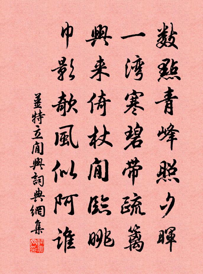 詩詞名句歷史字典書法欣賞書法字典國語詞典說文解字康熙字典古漢語字典標 題 作 者 詩 句 閒興作者:姜特立 朝代:宋代閒興原文數點青峰照夕暉,一灣寒碧帶疏籬。興來倚杖閒臨眺,巾影欹風似阿誰。詩詞問答問:閒興的作者是誰?答:姜特立問:閒興寫於哪個朝代?答:宋代姜特立閒興書法欣賞閒興書法作品詩詞推薦庚辰正月旦早朝呈留忠齋汪元量〔宋代〕庭燎明如晝,金壺漏水平。爐煙搖曉色,櫩□□□聲。三祝聖人壽,一忠臣子情。新元奏封事,□□□蒼生。鷓鴣天 何尊師故居張可久〔元代〕萬木森森秀野堂。黃鸝兩兩鶴雙雙。翠岩雲巧蒼松暗,玉洞月明丹桂香。移筆架,拂琴床。賦詩爭看水雲鄉。重來曹雲西畫山水圖王冕〔元代〕前年常見雲西畫,今年始識雲西翁。文章驚世怈所重,筆力到老老更工。流水涓涓石鑿鑿,一嘯長才風雨作。豈雲醉落魄晏幾道〔宋代〕天教命薄,青樓占得聲名惡。對酒當歌尋思著,月戶星窗,多少舊期約。相逢細語初心錯,兩行紅淚尊前落。霞觴新樓詩二十首水寺李紳〔唐代〕煙波野寺經過處,水國蒼茫夢想中。雲散浦間江月迥,日曛洲渚海潮通。坐看魚鳥沈浮遠,靜見樓台上下同。聞道田侍郎歸鎮(一作上魏博田侍中八首)王建〔唐代〕去處長將決勝籌,回回身在陣前頭。賊城破後先鋒入,看著紅妝不敢收。熨帖朝衣拋戰袍,夔龍班裡侍中高。對時送夏侯子之江夏賈至〔唐代〕扣楫洞庭上,清風千里來。留歡一杯酒,欲別復裴回。相見楚山下,漁舟憶釣台。羨君還舊里,歸念獨悠哉。贈晶得應菊坡釋行海〔宋代〕東籬秋色遍幽坡,蔟蔟金英洗露華。君且試推鼓澤看,五行何處愛黃花。過燕支寄杜位岑參〔唐代〕燕支山西酒泉道,北風吹沙卷白草。長安遙在日光邊,憶君不見令人老。寄題杭州廣法善堂鄭起〔宋代〕淘清研朱畫屋樑,黃漆柏障連曲房。日暉月色不須照,了了自可窺毫芒。夕陰花斂似欲病,飛鳥不驚烏帽郎。深山潤屋徐夤〔唐代〕潤屋豐家莫妄求,眼看多是與身讎。百禽羅得皆黃口,四皓山居始白頭。玉爍火光爭肯變,草芳崎岸不曾秋。朱門贈筆工楊日新方回〔宋代〕黃鐘九寸裁為律,六呂六律相配匹。嶰谷參差十二筒,猗管城子從此出。上古蒼頡初制字,後人蒙恬始造筆。吳雲寒夜張明府宅宴孟浩然〔唐代〕瑞雪初盈尺,寒宵始半更。列筵邀酒伴,刻燭限詩成。香炭金爐暖,嬌弦玉指清。醉來方欲臥,不覺曉雞鳴。蟾宮曲·雪薛昂夫〔元代〕天仙碧玉瓊瑤,點點揚花,片片鵝毛。訪戴歸來,尋梅懶去,獨釣無聊。一個飲羊羔紅爐暖閣,一個凍騎驢野店溪示董伯懿王安石〔宋代〕穿橋度塹只閒行,詠石嘲花亦漫成。嚼蠟已能忘世味,畫脂那更惜時名。長乾里北寒山紫,白下門西野水明。此地歸憩澗亭橋丘葵〔宋代〕雨後溪流深更深,倚欄照見一生心。青山只在橋南北,枉自穿雲渡水尋。答張侍御賈喜再登科後,自洛赴上都贈別劉禹錫〔唐代〕又被時人寫姓名,春風引路入京城。知君憶得前身事,分付鶯花與後生。雍台歌溫庭筠〔唐代〕太子池南樓百尺,入窗新樹疏簾隔。黃金鋪首畫鉤陳,羽葆停幢拂交戟。盤紆闌楯臨高台,帳殿臨流鸞扇開。早雁耕樂詩四首袁甫〔宋代〕少時操筆代躬耕,老鶴如今太瘦生。已識箇中真樂地,誰雲骨相費生成。寄禪月大師周庠〔唐代〕昨日塵游到幾家,就中偏省近宣麻。水田鋪座時移畫,金地譚空說盡沙。傍竹欲添犀浦石,栽松更碾味江茶。有時名句推薦昭君拂玉鞍,上馬啼紅頰。李白《王昭君二首》 幸於始者怠於終,繕其辭者嗜其利。曹雪芹《紅樓夢·第五十六回》 鄉書何處達?歸雁洛陽邊。王灣《次北固山下》 山檣谷塹依然在,弱吐強吞盡已空。杜牧《題武關》 夫寵而不驕,驕而能降,降而不憾,憾而能珍者鮮矣。左丘明《左傳·隱公·隱公三年》 此身行作稽山土,猶吊遺蹤一泫然。陸游《沈園二首》 春風江上路,不覺到君家高啟《尋胡隱君》 當年燕子知何處,但苔深韋曲,草暗斜川。張炎《高陽台·西湖春感》 騷屑西風弄晚寒,翠袖倚闌乾。納蘭性德《眼兒媚·詠紅姑娘》 兩行疏柳,一絲殘照,萬點鴉棲。劉基《眼兒媚·秋思》