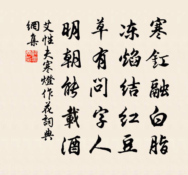 詩詞名句歷史字典書法欣賞書法字典國語詞典說文解字康熙字典古漢語字典標 題 作 者 詩 句 寒燈作花作者:艾性夫 朝代:宋代寒燈作花原文寒釭融白脂,凍焰結紅豆。草有問字人,明朝能載酒。詩詞問答問:寒燈作花的作者是誰?答:艾性夫問:寒燈作花寫於哪個朝代?答:宋代問:寒燈作花是什麼體裁?答:五絕艾性夫寒燈作花書法欣賞寒燈作花書法作品詩詞推薦寄所知金君卿〔宋代〕正色當官取悔尤,清時無靠獨包羞。獄中劍氣猶盤郁,火里琴材未見收。自古聖賢由直道,遭時誣毀亦幽囚。願持宿白雪驛鄭獬〔宋代〕春酒味濃殊不解,繞廊倚柱獨徘徊。蒼山碧樹共沈寂,明月斷雲相往來。細雨忽飄溪外去,好風卻傍竹間回。朝來奉簡才元探梅有作兼懷舊遊張元乾〔宋代〕遮莫胡僧問劫灰,且陪東閣賦官梅。春梢慣識宮妝樣,花信偏隨驛使回。痛飲我曹身總健,浩歌誰怕老相催。疏枝仲秋書事陸游〔宋代〕心明始信元無佛,氣住何曾別有仙。領取三山安樂法, * 紙帳過年年。秋懷二首劉宰〔宋代〕翠幄迎霜半染紅,高林風過雜笙鍾。澄光萬頃天無滓,留與義和駕六龍。田舍丘葵〔宋代〕久旱割豐穰,群童拾穗忙。早炊留客飯,新釀喚翁嘗。庭上豆萁滿,籬邊蔬甲長。腰鐮砍草木,準擬撐欹桑。上雲樂 方丈曲蕭衍〔南北朝〕方丈上。崚層雲。挹八玉。御三雲。金月姜特立〔宋代〕萬古長空月,虧盈不計年。魄生蟾共沒,光滿蛤同圓。菩薩蠻佚名〔宋代〕天威亂糝瓊蕤密。一光吞盡千山碧。梅與雪爭妍。孤香風暗傳。玉骨從來瘦。不奈春僝僽。羌管一聲殘。水鄉生暮行香子·秋與蘇軾〔宋代〕昨夜霜風。先入梧桐。渾無處、迴避衰容。問公何事,不語書空。但一回醉,一回病,一回慵。朝來庭下,光陰如簡翁都官曾鞏〔宋代〕倦遊公府曳長裾,笑上扁舟指舊廬。自有文章真杞梓,不須雕琢是璠歟。浮蛆滿瓮嘗春酒,垂露臨窗理索書。況得錢大參有和用韻謝之七首曹勛〔宋代〕瑞峰來現宰官身,清峙岩岩聳縉紳。聞道石頭時說偈,一堂驚動水雲人。論詩三十首元好問〔金代〕窘步相仍死不前,唱酬無復見前賢。 縱橫正有凌雲志,俯仰隨人亦可憐。 題申王畫馬圖蔡肇〔宋代〕天寶諸王愛名馬,千金爭致華軒下。當時不獨玉花驄,飛電流雲絕瀟灑。兩方岐薛寧與申,憑陵內廄多清新。肉騌送僧釋普度〔宋代〕瘦坐清行合澗邊,衲衣楚楚濕蒼煙。春光盡逐杖黎去,留得暮山啼斷猿。憶秦娥張元乾〔宋代〕桃花萼。雨肥紅綻東風惡。東風惡。長亭無寐,短書難托。征衫辜負深閨約。禁菸時候春羅薄。春羅薄。多應消瘦挽熊縣丞王義山〔宋代〕三嘆丞哉不負余,階庭蘭玉又森如。鄉鄰稱道有是子,祖父傳來只此書。勇上璧流逼霄漢,相將金榜到門閭。從前朝上清歌顧況〔唐代〕潔眼朝上清,綠景開紫霞。皇皇紫微君,左右皆靈娥。曼聲流睇,和清歌些;至陽無諼,其樂多些;旌蓋颯沓,簫過五里逕三首楊萬里〔宋代〕入山無路出無門,鳥語猿聲更斷魂。當處迷塗何處問,一溪引我得前村。醉桃源王吉昌〔元代〕武曲廉貞武廉幽貫地天根。綿綿息若存。六天交戰定朝昏。丹爐火力溫。驅神窟,養生門。玄功主掌尊。牝關天閉名句推薦日夕北風緊,寒林噤暮鴉。大須《暮雪》 爆竹聲中一歲除,春風送暖入屠蘇。王安石《元日》 春田龜坼苗不滋,猶賴立春三日雪。王士禎《春不雨》 樹樹皆秋色,山山唯落暉。王績《野望》 風住塵香花已盡,日晚倦梳頭。李清照《武陵春·春晚》 斜月照簾帷,憶君和夢稀。毛熙震《菩薩蠻·梨花滿院飄香雪》 中心愿,平虜保民安國。宋江《滿江紅·喜遇重陽》 同惡相助,同好相留,同情相成,同欲相趨,同利相死。司馬遷《史記七十列傳·吳王濞列傳》 審知四度,可以定天下,可安一國。佚名《黃帝四經·經法·四度》 句有可削,足見其疏;字不得減,乃知其密。劉勰《文心雕龍·熔裁》