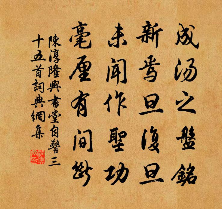 詩詞名句歷史字典書法欣賞書法字典國語詞典說文解字康熙字典古漢語字典標 題 作 者 詩 句 隆興書堂自警三十五首作者:陳淳 朝代:宋代隆興書堂自警三十五首原文成湯之盤銘,新焉旦復旦。未聞作聖功,毫釐有間斷。詩詞問答問:隆興書堂自警三十五首的作者是誰?答:陳淳問:隆興書堂自警三十五首寫於哪個朝代?答:宋代陳淳隆興書堂自警三十五首書法欣賞隆興書堂自警三十五首書法作品詩詞推薦春日杼山寄贈李員外縱皎然〔唐代〕南山唯與北山鄰,古樹連拳伴我身。黃鶴有心多不住,白雲無事獨相親。閒持竹錫深看水,懶系 * 出見人。欲掇幽趣十二首鄭剛中〔宋代〕幽趣無人會,須還我獨親。開書風為揭,得睡懶相因。雨後竹色淨,月中梅意貞。北山小園景,莫怨未歸人。病起呈靈舒紫芝寄文淵徐照〔宋代〕唐世吟詩侶,一時生在今。不因吾疾重,誰識爾情深。解願衣賒酒,更醫藥費金。天教殘息在,安敢廢清吟。詠鹿蔥詩沈約〔南北朝〕野馬不任騎。兔絲不任織。既非中野花。無堪麕{鹿/加}食。池上張光啟〔清代〕倚杖池邊立,西風荷柄斜。眼明秋水外,又放一枝花。句陶弼〔宋代〕五十溪州五寨城,廣宣恩詔諭蠻情。欲飯野人家見拒甚力魏杞〔宋代〕山崦筠車轉屈蟠,欲尋野店具盤餐。主人變色行蠶忌,客子包羞坐虱官。早見此生真寄寓,更知行役是艱難。逡巡送湖南張倉解官還建昌九首廖行之〔宋代〕一節三湘兩載留,高懷寧羨子公謀。由來奇士為時用,未信林泉得久游。居厚弟示和詩複課十首劉克莊〔宋代〕花深蘚合似禪關,千歲榕根入水蟠。方土何須求海上,地仙元不離人間。忘言已悟銅銘背,卻老非乾玉煉顏。客至秋日過韓原隱居趙湘〔唐代〕霜落門前石齒清,靜中曾聽咽泉聲。分題會客多無說,抱疾迎僧忽強行。窗外葉隨蟬影過,井邊苔趁雨痕生。紗巾八聲甘州(中秋夜作)張鎡〔宋代〕嘆流光迅景,百年間、能醉幾中秋。正淒蛩響砌,驚烏翻樹,煙淡苹洲。誰喚金輪出海,不帶一雲浮。才上青林頂和張叔靖三絕鄭剛中〔宋代〕後生修飾正爭妍,老者何顏與後肩。竹逕柴門閉深寂,嵇康只願得高眠。金蓮出玉華王丹桂〔元代〕人非人是。識破全然渾小事。人是人非。恰似春風耳畔吹。真功真行。意馬心猿休內縱。真行真功。十二時中鍊氣宿銅陵張耒〔宋代〕山色日已遠,問人歸路長。碧天涼夜闊,秋物雨余荒。人靜路傍寺,鳥啼林下房。銅陵竟何就,空死漢吳王。宮詞王仲修〔宋代〕誰向緱仙學玉笙,紫筠管密制新成。綺窗人靜月明夜,能作簫台九鳳聲。題畫廿四首唐寅〔明代〕酒旗瘦馬人行道,燈火荒雞細雨中。奔走十年才歇腳,偶看畫景忽消魂。舜舉水仙梅五絕牟巘五〔宋代〕當代涪翁有素評,此花雅合喚梅兄。玉宸殿上重差次,可是詩人許與輕。題沈東美員外山池綦毋潛〔唐代〕仙郎偏好道,鑿沼象瀛洲。魚樂隨情性,船行任去留。秦人辨雞犬,堯日識巢由。歸客衡門外,仍憐返景幽。提舉中奉程公輓詩蔡戡〔宋代〕靜退身無累,安閒意有餘。一麾真漫爾,三徑盍歸與。肯酌貪泉水,甘乘下澤車。後生知敬慕,遺行藹鄉閭。醉中詠梅花李建勛〔唐代〕十月清霜尚未寒,雪英重疊已如摶。還悲獨詠東園裡,老作南州刺史看。北客見皆驚節氣,郡僚痴欲望杯盤。交親名句推薦春山煙欲收,天淡星稀小牛希濟《生查子·春山煙欲收》 鴻羽難憑芳信短,長安猶近歸期遠。盧祖皋《倦尋芳·香泥壘燕》 秦樓月,年年柳色,灞陵傷別。李白《憶秦娥·簫聲咽》 青青一樹傷心色,曾入幾人離恨中。白居易《青門柳》 是以其財不足以待凶飢、振孤寡,故國貧而民難治也。墨子《墨子·06章 辭過》 妾本秦羅敷,玉顏艷名都。李白《陌上桑》 夫兵權者,是三軍之司命,主將之威勢。諸葛亮《將苑·卷一·兵權》 怕歌愁舞懶逢迎。妝晚托春酲。陸游《朝中措·代譚德稱作》 人有不及,可以情恕。房玄齡《晉書·列傳·第六章》 柳色披衫金縷鳳,縴手輕拈紅豆弄,翠蛾雙斂正含情。和凝《天仙子·柳色披衫金縷鳳》