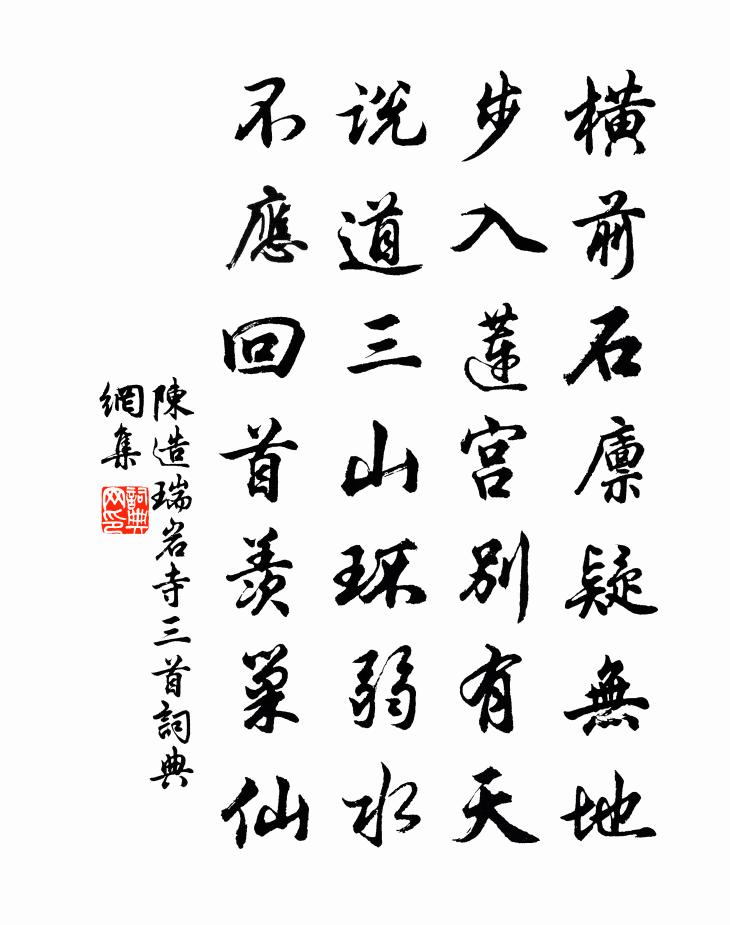 詩詞名句歷史字典書法欣賞書法字典國語詞典說文解字康熙字典古漢語字典標 題 作 者 詩 句 瑞岩寺三首作者:陳造 朝代:宋代瑞岩寺三首原文橫前石廩疑無地,步入蓮宮別有天。說道三山環弱水,不應回首羨巢仙。詩詞問答問:瑞岩寺三首的作者是誰?答:陳造問:瑞岩寺三首寫於哪個朝代?答:宋代陳造瑞岩寺三首書法欣賞瑞岩寺三首書法作品詩詞推薦【雙調】沉醉東風_聽不厭鸞笙鍾嗣成〔元代〕聽不厭鸞笙象板,看不足鳳髻蟬鬟。按不住刺史狂,學不得司空慣,常不教粉吝紅慳。若不把群花恣意看,飽不了玉漏遲 春日有懷張翥〔元代〕病懷因酒惱。依稀夢裡,吳娃嬌小。金縷歌殘,人去月斜雲杳。怕見棲香燕晚,又怕聽、啼花鶯曉。庭院悄。生衣和文與可洋州園亭三十詠其二十二菡萏軒蘇轍〔宋代〕開花濁水中,抱性一何潔。朱檻月明時,清香為誰發。夜歸曲曹組〔宋代〕飢烏啞啞啼暮寒,迴風急雪飄朱闌。瑣窗繡閣艷 * ,畫幕金泥搖彩鸞。吳妝秀色攢眉綠,能唱襄陽大堤曲。酒酣敬酬楊僕射山齋獨坐詩薛道衡〔隋代〕相望山河近。相思朝夕勞。龍門竹箭急。華岳蓮花高。岳高嶂重疊。鳥道風煙接。遙原樹若薺。遠水舟如葉。葉舟再用王才元少師韻李彌遜〔宋代〕十年鬼趁飛蓬,鬼來作海邊夢。曾無竹馬迎,長辨柳車送。長須乞米炊,驥子學詩誦。自公弭節歸,許我勢鞭從。和史志道侍郎游朝陽岩曾協〔宋代〕簿書堆案阻尋幽,想像高人物外游。自昔品題多北客,故知物象勝中州。雲經亂石餘膏潤,煙過懸崖自去留。暫俯酬暉上人夏日林泉陳子昂〔唐代〕聞道白雲居,窈窕青蓮宇。岩泉萬丈流,樹石千年古。林臥對軒窗,山陰滿庭戶。方釋塵事勞,從君襲蘭杜。金蓮堂 俗惜黃花 藏頭 拆起口字馬鈺〔元代〕傳心悟。中堪睹。嬰嬌並女奼。會封門戶。滅更蟲銷,木相交做。事絕,財不覷。內箇中主。從識汝。升火降自是壽城凱還宴將帥樂語口號李曾伯〔宋代〕新墉屹屹解嚴圍,十萬全師破賊回。元帥擁旄朝授策,將軍畫箠夜銜枚。椎牛臠炙歡聲動,伐鼓傳觴哀拍催。盡道秦樓月(秋夕)黃升〔宋代〕心如結。西風老盡黃花節。黃花節。塞鴻聲斷,冷煙淒月。漢朝陵廟唐宮闕。興衰萬變從誰說。從誰說。千年青史立春帖子太上皇后閣周必大〔宋代〕聚景貯壺春,仙關晝不扃。小桃無數發,好幸彩霞亭。透碧岩陳岩〔宋代〕空洞玲瓏萬石攢,中間逗入翠光寒。人來坐對山無語,表里虛明不礙觀。解連環 與金桂軒虎丘送春袁易〔元代〕燕忙鶯寂。驚千林稚綠,半灣新碧。試送目、官柳河橋,便攜酒餞春,去應無跡。岸曲殘英,尚勾引、行舟攀摘。夾漈草堂劉克莊〔宋代〕嶺絕瀑源窮,曾於此築宮。得知千載上,因住萬山中。廢址苔荒盡,遺書電取空。高皇南渡始,卻議及招弓。東京道上口占傅諴〔宋代〕宮闕岧嶢俯碧空,九門未曉月朦朧。馬嘶南陌東風遠,回首神京一夢中。爛柯山四首。最高頂劉迥〔唐代〕白雲引策杖,苔徑誰往還。漸見松樹偃,時聞鳥聲閒。豁然喧氛盡,獨對萬重山。乙巳邵武建寧夜坐書呈諸公陳普〔宋代〕敬身天不寬曾子,白眼人當殺嗣宗。林下脫巾仍露腳,青雲白石肯相容。夢與尤木石論史感舊七絕句劉克莊〔宋代〕加璧年高公誤矣,免冠發禿上憐之。懸知黃鵠飛難返,獨恨青牛去稍遲。賓之初筵佚名〔先秦〕賓之初筵,左右秩秩。籩豆有楚,殽核維旅。酒既和旨,飲酒孔偕。鐘鼓既設,舉酬逸逸。大侯既抗,弓矢斯張。名句推薦回首天涯,一抹斜陽,數點寒鴉。張可久《折桂令·九日》 十分不耐煩,乃為人大病;一味學吃虧,是處事良方。王永彬《圍爐夜話·第五四則》 朝騁騖兮江皋,夕弭節兮北渚;屈原《九歌》 南朝四百八十寺,多少樓台煙雨中。杜牧《江南春》 群芳爛不收,東風落如糝歐陽修《春日西湖寄謝法曹歌》 惆悵孤帆連夜發,送行淡月微雲。蘇軾《臨江仙·送錢穆父》 因思杜陵夢,鳧雁滿回塘。溫庭筠《商山早行》 綠衣監使守宮門,一閉上陽多少春。白居易《上陽白髮人》 碧湖湖上柳陰陰,人影澄波浸,常記年時歡花飲。楊果《小桃紅·碧湖湖上柳陰陰》 何夜無月?何處無竹柏?但少閒人如吾兩人者耳。蘇軾《記承天寺夜遊 / 記承天夜遊》