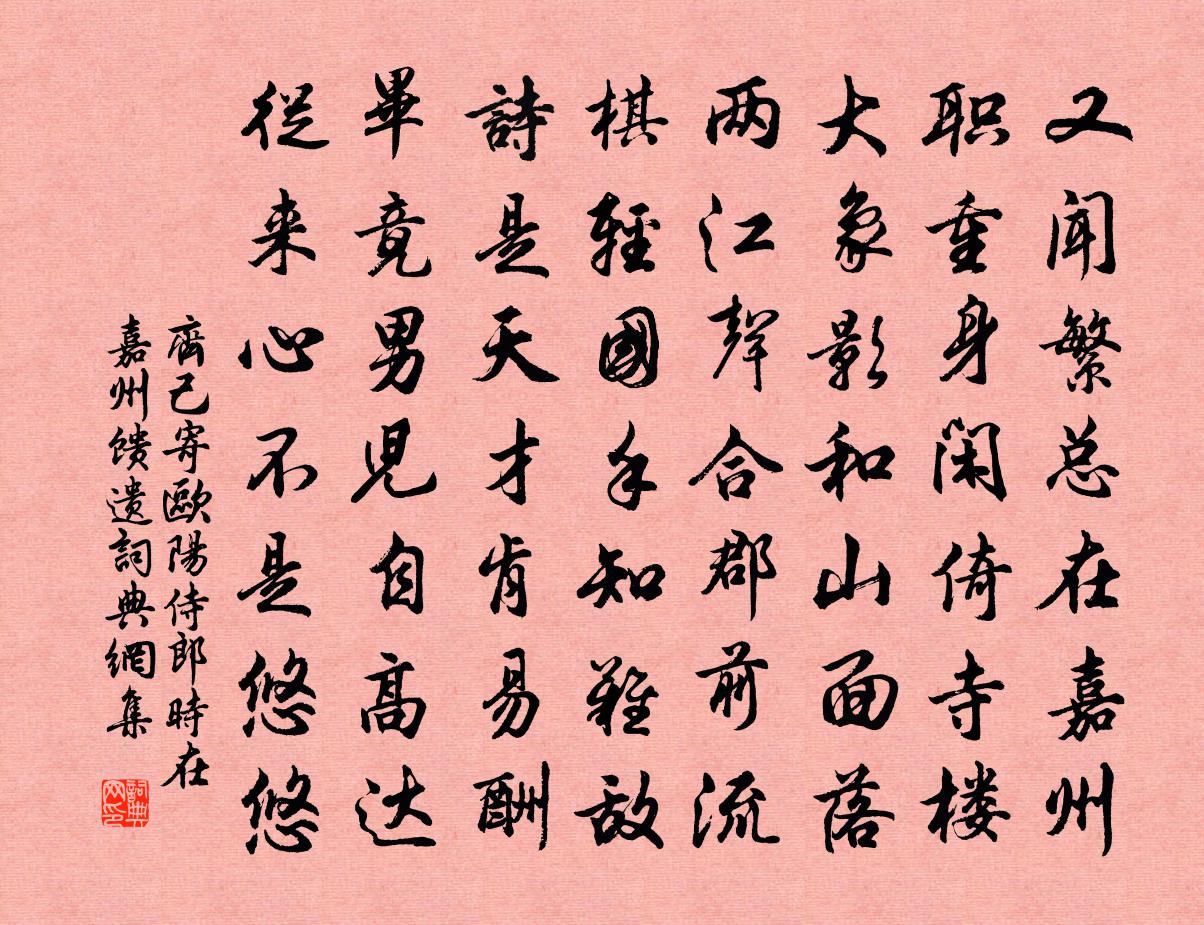 詩詞名句歷史字典書法欣賞書法字典國語詞典說文解字康熙字典古漢語字典標 題 作 者 詩 句 寄歐陽侍郎(時在嘉州饋遺)作者:齊己 朝代:唐代原文又聞繁總在嘉州,職重身閒倚寺樓。大象影和山面落,兩江聲合郡前流。棋輕國手知難敵,詩是天才肯易酬。畢竟男兒自高達,從來心不是悠悠。詩詞問答問:《寄歐陽侍郎(時在嘉州饋遺)》的作者是誰?答:齊己問:該詩寫於哪個朝代?答:唐代問:齊己的名句有哪些?答:齊己名句大全書法欣賞寄歐陽侍郎(時在嘉州饋遺)書法作品注釋全唐詩:卷844-30詩詞推薦送柳子玉蘇轍〔宋代〕柳侯白首郎,風格終近古。舊遊日零落,新輩誰與伍。人情逐時好,變化無定主。試看近時人,相教蹈規矩。行身過邵堯夫先生富弼〔宋代〕先生自衛客西畿,樂道安間絕世機。再命初筵終不起,獨甘窮巷寂無依。貫穿百代嘗探古,吟詠千篇亦造微。珍重頌古十九首釋法全〔宋代〕驢覷井,井覷驢,冬瓜葉上長葫蘆。會不得,莫踟躕,定盤星上絕錙銖。再作雲溪郭印〔宋代〕曳杖推門去,問訊西溪雲。超然人境異,佳氣日氤氳。秋霽 繼古韻述懷王丹桂〔元代〕肥遁人家,對東南萬里、鯨海橫碧。蘭苑芝田,暖香風送,不滅鳳城春色。壽松徑里。綠茵嫩□紋如織。又還是。醉吟二首白玉蟾〔宋代〕松風吹我飛,手搦空中月。笑指蓬萊山,可補銀河缺。滿庭芳 贈宋先生馬鈺〔元代〕休夸富貴,莫騁榮華。無常事緊堪嗟。休學雲陽朱判,利鎖名枷。好繼風仙悟道,棄家緣、仙路無差。長久志,煉書與士瞻上人十首仇遠〔宋代〕我本迂疏落拓人,滿頭霜雪滿懷春。登山有屐身恆健,掛壁無弦趣更真。往歲郊官殊漫浪,老來學佛離貪嗔。卻憐楚世家唐彥謙〔唐代〕偏信由來惑是非,一言邪佞脫危機。張儀重入懷王手,駟馬安車卻放歸。木稼方岳〔宋代〕春日電光飛霹靂,元日奇寒雪盈尺。銷瓊融玉夜色凝,贔屓穹林矗僵立。鮫人淚滴珊瑚枝,通身擎出青琉璃。霜皮壽湖南管倉五首廖行之〔宋代〕平糴慮國深,公囷匪邦積。自古斯有年,寢遠失初意。今年出緡錢,樂歲怨狼戾。此法竟施行,農民等蒙惠。漁家傲(和孔純老三首)王之道〔宋代〕岩電晶熒君未老。看看門外鋒車到。一點眉間黃色好。人盡道。從今次第登三少。左右青娥來巧笑。注唇塗額新妝中秋日懷寄潘邠老賦賀鑄〔宋代〕西戍角聲清且哀,東城鼓動殷然雷。雨闌伏檻月可待,風橫檥舟君不來。得酒未容歡獨伯,把書端與睡為媒。雪堂擬詠懷詩 十八庾信〔南北朝〕尋思萬戶侯。中夜忽然愁。琴聲遍屋裡。書卷滿床頭。雖言夢蝴蝶。定自非莊周。殘月如初月。新秋似舊秋。露泣題城南書院三十四詠張栻〔宋代〕野艇新成尋丈許,柳堤詳觀總不偏。飛絮滿空春不盡,新荷帖水已田田。和續古謝送墨洪咨夔〔宋代〕黑月黳雲脫太清,海風吹上筆頭輕。瑣窗冷透芙蕖碧,定有新銘到九成。八月八日發潭州後得絕句四十首趙蕃〔宋代〕秀植如雲不可窮,長杉鉅竹略相同。嗟余詎可如材者,政似飄飄秋後楓。送友人游嵩山陳羽〔唐代〕嵩山歸路繞天壇,雪影松聲滿谷寒。君見九龍潭上月,莫辭清夜訪袁安。又三絕文天祥〔宋代〕人間萬事轉頭空,皂帽飄蕭一病翁。不學孟嘉狂落魄,故將白髮向西風。秋後交行衛宗武〔宋代〕水北水南村,縈迴草徑深。貿蔬蟲篆葉,宿樹鳥盤林。岸斷分支港,雲開出遠岑。意行無個事,斜日照孤吟。名句推薦有熊有羆,有貓有虎,慶既令居,韓姞燕譽。佚名《韓奕》 重陽初啟節,無射正飛灰。陰行先《和張燕公湘中九日登高》 苕之華,其葉青青。佚名《苕之華》 簌簌衣巾落棗花,村南村北響繅車,牛衣古柳賣黃瓜。蘇軾《浣溪沙·簌簌衣巾落棗花》 憶對中秋丹桂叢。花在杯中。月在杯中。辛棄疾《一剪梅·中秋元月》 仰天大笑出門去,我輩豈是蓬蒿人。李白《南陵別兒童入京》 謾道愁須殢酒,酒未醒、愁已先回秦觀《滿庭芳·碧水驚秋》 無端聽畫角,枕畔紅冰薄。納蘭性德《菩薩蠻·朔風吹散三更雪》 面譽者不忠,飾貌者不情戴聖《大戴禮記·文王官人第七十二》 亦知合被才名折,二十三年折太多。白居易《醉贈劉二十八使君》