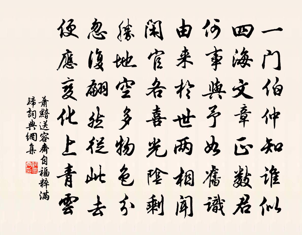詩詞名句歷史字典書法欣賞書法字典國語詞典說文解字康熙字典古漢語字典標 題 作 者 詩 句 送容齋自福粹滿歸作者:蕭黯 朝代:宋代送容齋自福粹滿歸原文一門伯仲知誰似,四海文章正數君。何事與予如舊識,由來於世兩相聞。閒官各喜光陰剩,勝地空多物色分。忽復翩然從此去,便應變化上青雲。詩詞問答問:送容齋自福粹滿歸的作者是誰?答:蕭黯問:送容齋自福粹滿歸寫於哪個朝代?答:宋代蕭黯送容齋自福粹滿歸書法欣賞送容齋自福粹滿歸書法作品詩詞推薦除夜酬樂天元稹〔唐代〕引儺綏旆亂毿毿,戲罷人歸思不堪。虛漲火塵龜浦北,無由阿傘鳳城南。休官期限元同約,除夜情懷 * 諳。莫道哭李清卿侍郎王洋〔宋代〕薄壘氈車咽,危台斥候移。孤忠萬夫望。獨許寸心知。義動乾坤正,生殘日月虧。南山竹有限,難盡泣君辭。江南李後主夢觀世音像贊黃庭堅〔宋代〕補陀岩中大慈聖,滄浪石上觀生死。南州麽聖師子王,感夢白衣施無畏。夢回灑筆具光相,照鏡還與我面同。當時四威儀釋師範〔宋代〕山中行,移步放教輕。無別意,恐他幽鳥驚。蟲豸詩。蟻子(三首)元稹〔唐代〕蟻子生無處,偏因濕處生。陰霪煩擾攘,拾粒苦嚶嚀。床上主人病,耳中虛藏鳴。雷霆翻不省,聞汝作牛聲。時術章氏園小集荷池上葛立方〔宋代〕一金營雅集,荷濕露香濃。鳥起驚歌扇,雲移落酒鍾。碧筩彎象鼻,翠釜出駝峰。百歲風狂似,無因系六龍。同夫游秦王韞秀〔唐代〕路掃饑寒跡,天哀志氣人。休零離別淚,攜手入西秦。金陵雜興二百首蘇泂〔宋代〕二十四番風信催,郭南間道有花開。園官欲斗金錢賞,名字先供百品來。風箏司空曙〔唐代〕高風吹玉柱,萬籟忽齊飄。颯樹遲難度,縈空細漸銷。松泉鹿門夜,笙鶴洛濱朝。坐與真僧聽,支頤向寂寥。晚晴寄滿子權王令〔宋代〕常恐朝陰至夕曛,好風吹去信多勤。得逢白日忽開眼,可惜青天尚有雲。安得植梯懸碧落,共操長帚掃妖氛。恨無寓齋史堯弼〔宋代〕莊生十九言,妙處如筏喻。我欲問公居,公心無所住。送禪僧薛能〔唐代〕寒空孤鳥度,落日一僧歸。近寺路聞梵,出郊風滿衣。步搖瓶浪起,盂戛磬聲微。還坐棲禪所,荒山月照扉。偈頌六十七首釋原妙〔宋代〕洞徹是非如夢幻,轉身未免墮深坑。須知別有通霄路,不許時人造次行。勉陳石二生鄭獬〔宋代〕精金埋深山,鑿土不難得。大貝貯滄海,破浪亦能識。山趨猛虎穴,海入長蛟室。必意往取之,投軀不少惜。仁義京口熊遹〔宋代〕古郡如河內,雲藏鐵瓮城,禹疏渠絕峴,秦鑒塹分京。舊井朱方塞,新橋淥水橫。文中子趙時韶〔宋代〕一脈斯文擊大儒,干戈滿地獨詩書。南風有操無人識,身在汾亭心在虞。感懷二首文天祥〔宋代〕交遊兵後似蓬飛,流落天涯鵲繞枝。唐室老臣唯我在,柳州先友托誰碑。泥塗猶幸瞻佳士,甘雨如何遇故知。一死菩薩蠻 新秋夜涼浴罷露坐邵亨貞〔元代〕清江倒浸雲峰巧。采菱渡口輕舟小。水面晚風香。蒹葭搖暖涼。瀟湘人漸老。玉佩驚秋早。鷗鳥慣忘機。背人何處上古之什補亡訓傳十三章十月之郊一章顧況〔唐代〕(十月之郊,造公室也。君子居公室,當思布德行化焉。)十月之郊,群木肇生。陽潛地中,舒達句萌。曀其蔚兮次德茂湖中韻李流謙〔宋代〕秋風早已來吹人,朝數暮數唯歸程。白湖粘天行未了,單舸夜泊令人驚。更闌剪燭共愁語,酒醒彈鋏為商聲。篙兒名句推薦片雲天共遠,永夜月同孤。杜甫《江漢》 當年曾勝賞,生香熏袖,活火分茶。李清照《轉調滿庭芳·芳草池塘》 賢路當廣而不當狹,言路當開而不當塞脫脫《宋史·列傳·卷一百七十六》 素臣稱有道,守在於四夷。田錫《塞上曲》 綠葉翠莖,冒霜停雪。左思《三都賦》 行吟坐嘯獨悲秋,海霧江雲引暮愁。陳子龍《秋日雜感(十首選一)》 滴不盡相思血淚拋紅豆,開不完春柳春花滿畫樓,睡不穩紗窗風雨黃昏後,忘不了新愁與舊愁。曹雪芹《紅樓夢·第二十八回》 日出東南隅,照我秦氏樓。佚名《陌上桑》 金剛則折,革剛則裂。劉向《說苑·敬慎》 日暖泥融雪半消,行人芳草馬聲驕。杜牧《宣州送裴坦判官往舒州時牧欲赴官歸京》