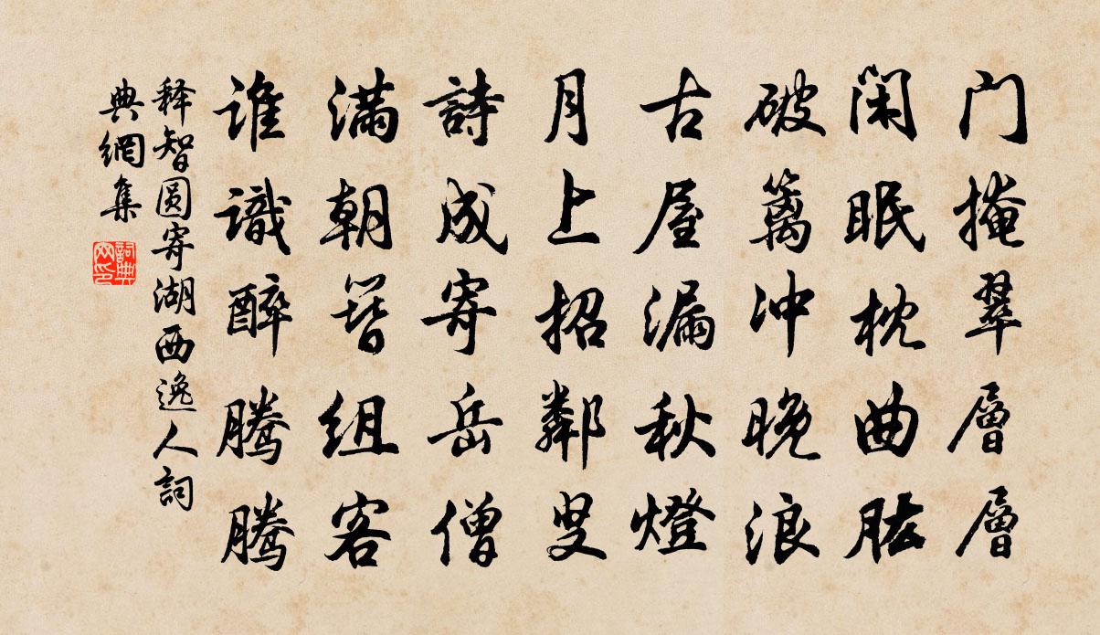 詩詞名句歷史字典書法欣賞書法字典國語詞典說文解字康熙字典古漢語字典標 題 作 者 詩 句 寄湖西逸人作者:釋智圓 朝代:宋代寄湖西逸人原文門掩翠層層,閒眠枕曲肱。破籬沖晚浪,古屋漏秋燈。月上招鄰叟,詩成寄岳僧。滿朝簪組客,誰識醉騰騰。詩詞問答問:寄湖西逸人的作者是誰?答:釋智圓問:寄湖西逸人寫於哪個朝代?答:宋代釋智圓寄湖西逸人書法欣賞寄湖西逸人書法作品詩詞推薦鐵如意吟邵雍〔宋代〕此物鐵為之,何嘗肯妄持。長隨大{上敝下瓦}子,永伴小車兒。擊碎珊瑚處,敲殘牙齒時。誰能學此輩,才始人九江春半雨中寒甚忽見梨花楊冠卿〔宋代〕江城一雨春強半,寒色著人芳信遲。賴有梨花遮病眼,一枝帶雨出疏籬。偈頌一百零九首釋可湘〔宋代〕祖翁閫域,撲地掀天。親切一回打透,不妨垂手入廛。鷓鴣天 九月八日寄松京故舊李齊賢〔元代〕客里良辰屢已孤。菊花明日共誰娛。閉門暮色迷紅草,*枕秋聲度碧梧。三尺喙,數莖須。獨吟詩句當歌呼。故園書王定國所藏煙江疊嶂圖(王晉卿畫)蘇軾〔宋代〕江上愁心千疊山,浮空積翠如雲煙。山耶雲耶遠莫知,煙空雲散山依然。但見兩崖蒼蒼暗絕谷,中有百道飛來泉。和陳洗馬山莊新泉徐鉉〔唐代〕已開山館待抽簪,更要岩泉欲洗心。常被松聲迷細韻,忽流花片落高岑。便疏淺瀨穿莎徑,始有清光映竹林。何日送胡彥龍過金陵高彥竹〔宋代〕金陵往事已成虛,江水清清只見魚。遺廟空存元帝像,故家多有二王書。秋風出塞調生馬,夜月吟淮跨蹇驢。借問惜黃花(九月七日定興道中)史達祖〔宋代〕涵秋寒渚,染霜丹樹。尚依稀,是來時、夢中行路。時節正思家,遠道仍懷古。更對著、滿城風雨。黃花無數。碧寄河東按察待制施正臣宋祁〔宋代〕並門迢遞駕朱輪,紫橐宮毫晦隙塵。幾眼帶移貪事國,半生桐老苦傷春。比來置酒觴何屬,自此驚秋發恐新。鰲署苦雨張耒〔宋代〕春淺天尚寒,雨多聲入夜。幽人不出門,坐惜梅花謝。庭竹未抽萌,酴醾將覆架。芳時喜病癒,淺酌供情話。趨世臥病雜題陸游〔宋代〕(左口右父)咀初成藥,咿啞半掩扉。病知身健樂,閒覺宦遊非。小澗看猿飲,枯筇擁鶴歸。今朝更堪喜,書札得玉蓮環(泊英州鍾石鋪)管鑒〔宋代〕江上青山無數。綠陰深處。夕陽猶在系扁舟,為佳景、留人住。已辦一蓑歸去。江南煙雨。有情鷗鷺莫驚飛,便相秋居幽興王禹偁〔宋代〕謫居人事慵,幽興與誰同。僧到烹秋菌,兒啼索草蟲。掃苔留嫩綠,寫葉惜殘紅。歲晏琴罇好,籬邊有菊叢。歲暮偶書寄蘇台舊僚友王禹偁〔宋代〕吳門吏隱過三年,何事陶潛捧詔還。步武已趨龍尾道,夢魂猶憶虎丘山。花開茂苑誰同醉,雪滿梁園獨掩關。會待有贈司空圖〔唐代〕有詩有酒有高歌,春色年年奈我何。試問羲和能駐否,不勞頻借魯陽戈。寄梅處士張籍〔唐代〕擾擾人間是與非,官閒自覺省心機。六行班裡身常下,九列符中事亦稀。市客慣曾賒賤藥,家僮驚見著新衣。君今和王宣義買菊栽二首毛滂〔宋代〕秋風有好色,寄在菊花團。弛擔知新主,臨池得細看。金房迎日秀,玉露作香寒。獨負東籬意,年來灑酒乾。送化士釋子淳〔宋代〕春雲不世情,滋澤興還普。從龍向海飛,散作人間雨。幽洞無門任卷舒,悠悠莫忘青山父。雜興張鎡〔宋代〕風月屬漁樵,真味豈能領。雍容補國手,斯宜理煙艇。樂天未歸時,極口獻忠鯁。十上九不行,回身避機穽。酒徒頌古一○一首釋子淳〔宋代〕這邊那圉總難逢,一句無私不處中。紅日暮沉西嶂外,空留孤影照溪東。名句推薦未知鹿死誰手房玄齡《晉書·載記·第五章》 江間波浪兼天涌,塞上風雲接地陰。杜甫《秋興八首·其一》 從此擾擾攘攘,又不知夢醒何時耳。沈復《浮生六記·坎坷記愁》 君子引而不發,躍如也。孟子《孟子·盡心章句上·第四十一節》 蠟淚惱東風,舊壘眠新燕。納蘭性德《生查子·鞭影落春堤》 女媧鍊石補天處,石破天驚逗秋雨。李賀《李憑箜篌引》 黃鶴一去不復返,白雲千載空悠悠。崔顥《黃鶴樓 / 登黃鶴樓》 非我族類,其心必異。左丘明《左傳·成公·成公四年》 寒波淡淡起,白鳥悠悠下。元好問《潁亭留別》 陰陰溪曲綠交加,小雨翻萍上淺沙。晁沖之《春日·陰陰溪曲綠交加》