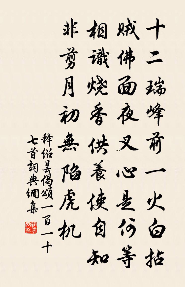 詩詞名句歷史字典書法欣賞書法字典國語詞典說文解字康熙字典古漢語字典標 題 作 者 詩 句 偈頌一百一十七首作者:釋紹曇 朝代:宋代偈頌一百一十七首原文十二瑞峰前,一火白拈賊。佛面夜叉心,是何等相識。燒香供養,使自知非,剪月初無陷虎1/1機。詩詞問答問:偈頌一百一十七首的作者是誰?答:釋紹曇問:偈頌一百一十七首寫於哪個朝代?答:宋代釋紹曇偈頌一百一十七首書法欣賞偈頌一百一十七首書法作品詩詞推薦登河山萬里樓李曾伯〔宋代〕收攬河山入此樓,幾年蚡冒古荊州。目窮夕照西沉隊,心到寒江東盡頭。歷歷雄圖史南北,紛紛遺恨晉春秋。酒邊賦赤松金宣義十月牡丹姜特立〔宋代〕赤松元是神仙窟,公獨能開韓令花。若使雒陽耆舊見,定應擁褐過君家。冬夜陸游〔宋代〕悠悠孤夢伴餘酲,窗下寒燈黮闇明。雪意欲成風正惡,漁舟忽過雁群鳴。志衰但有徂年感,身沒應無後世名。猶幸浪淘沙劉克莊〔宋代〕疊嶂碧周遮。遊子思家。掩藏白髮賴烏紗。落日倚樓千萬恨,社鼓城笳。老去淡生涯。虛擲年華。臘茶盂子太清些賦獨山釋行海〔宋代〕一峰突兀上虛空,石怪藤幽樹樹風。四面白雲人不見,磬聲如在有無中。出山相贊釋紹曇〔宋代〕六年雪凍不死,見明星便說悟。走出山來一窖無,被人喚作赤鬚鬍。檜蘇軾〔宋代〕強致南山樹,來經渭水灘。生成未有意,鴉鵲莫相干。慶金枝佚名〔宋代〕新春入舊年,綻梅萼、一枝先。隴頭人待信音傳。算楚岸、未香殘。小枕風雪憑欄乾。下簾幕、護輕寒。年華永占送司封從叔員外徼赴華州裴尚書均辟鄭谷〔唐代〕如何拋錦帳,蓮府對蓮峰。舊有雲霞約,暫留鵷鷺蹤。敷溪秋雪岸,樹谷夕陽鍾。盡入新吟境,歸朝興莫慵。贈別褚山人高適〔唐代〕攜手贈將行,山人道姓名。光陰薊子訓,才術褚先生。牆上梨花白,尊中桂酒清。洛陽無二價,猶是慕風聲。菩薩蠻陳克〔宋代〕綠陰寂寂櫻桃下。盆池劣照薔薇架。簾影假山前。映階紅葉翻。芭蕉籠碧砌。猧子中庭睡。香徑沒人來。拂牆花又山中自賦文天祥〔宋代〕□□□□□□□,門外蒼松一水修。不必清高逼巢許,只教瀟灑勝由求。空花自滿三千界,老樹相看五百秋。坐有因何常德招游西塔有詩遂和李復〔宋代〕支提壓西城,境絕天香集。招邀乘逸興,步駛追隨急。到門病眼明,曉逐秋雲入。浮屠喜躋攀,萬象在拱揖。古洞六月十三日壽陳子徽太博十首以無官一身輕有戴表元〔宋代〕炎方有朱鳥,璀璀顏色異。土人目為鳳,信爾可安致。生雛固當奇,千歲會一致。紛紛鴻燕期,寂寂非我事。江邊有寄羅隱〔唐代〕江邊舊業半雕殘,每軫歸心即萬端。狂折野梅山店暖,醉吹村笛酒樓寒。只言新地謀身易,爭奈貧儒得路難。同病海棠四首楊萬里〔宋代〕小園不到負今晨,晚喚嬌紅伴老身。落日爭明那肯暮,艷妝一出更無春。樹間露坐看搖影,酒底花光併入唇。銀燭次韻答正老強至〔宋代〕幽歡閒憶去年時,飲量人人灌漏卮。我更典衣邀淺飲,君猶刻燭賦新詩。由來世事都無定,再結朋游未可期。一紙送劉貢甫謫官衡陽王安石〔宋代〕劉郎劉郎莫先起,遇酒當歌且歡喜。船頭朝轉暮千里,眼中之人吾老矣。九疑聯綿皆相似,負雪崔嵬插花里。萬里代餞行衛宗武〔宋代〕下車入已誦廉平,三載松東著令名。敏則有功無滯事,惠而為政為疲氓。班班可紀郡曹美,去去先馳台掾聲。騰實浙東舟中范成大〔宋代〕處處槿樊圃,家家桃廡門。魚鹽臨水市,煙火隔江村。雨過張帆重,潮來汲井渾。彎跧短篷底,休說兩朱轓。名句推薦獨立揚新令,千營共一呼。盧綸《和張僕射塞下曲·其一》 蕃漢斷訊息,死生長別離。張籍《沒蕃故人》 伊川桃李正芳新,寒食山中酒復春。宋之問《寒食還陸渾別業》 財上分明大丈夫。佚名《增廣賢文·上集》 雨橫風狂三月暮,門掩黃昏,無計留春住。歐陽修《蝶戀花·庭院深深深幾許》 仁不異遠,義不辭難班固《漢書·紀·武帝紀》 喪不過三年,示民有終也。孔子及其弟子《孝經·喪親》 待約個梅魂,黃昏月淡,與伊深憐低語。柳如是《金明池·詠寒柳》 兼相愛,交相利。墨子《墨子·15章 兼愛(中)》 殘酒憶荊高,燕趙悲歌事未消。陳維崧《南鄉子·邢州道上作》
