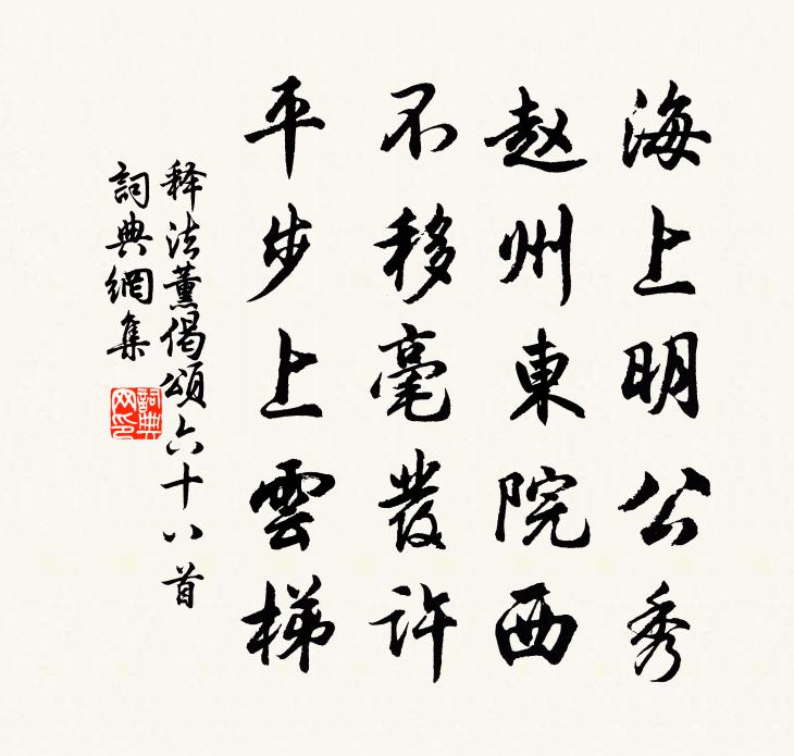 詩詞名句歷史字典書法欣賞書法字典國語詞典說文解字康熙字典古漢語字典標 題 作 者 詩 句 偈頌六十八首作者:釋法薰 朝代:宋代偈頌六十八首原文海上明公秀,趙州東院西。不移毫髮許,平步上雲梯。詩詞問答問:偈頌六十八首的作者是誰?答:釋法薰問:偈頌六十八首寫於哪個朝代?答:宋代釋法薰偈頌六十八首書法欣賞偈頌六十八首書法作品詩詞推薦皇甫岳雲溪雜題五首。鸕鶿堰王維〔唐代〕乍向紅蓮沒,復出清蒲颺。獨立何褵褷,銜魚古查上。桃源憶故人趙子發〔宋代〕芳菲已有東風露。寒著輕羅未去。午夜鸞車鶴馭。散入千蓮步。粉香度曲嬉遊女。草草相逢無據。腸斷淚零無數。挽松麓李僉判王義山〔宋代〕手拈老筆眇詞場,餘子如何敢頡頏。疑是前身真賀白,不然今世又蘇黃。片文落處人爭誦,一第欠於天取償。造物和張慶符題余作清江引圖胡銓〔宋代〕何人半醉眼花昏,畫出江南煙雨村。滿世庾塵遮不得,聊將醉墨洗乾坤。送人出使吳芾〔宋代〕驛騎駸駸犯露霜,定知遐俗喜生光。千官弩矢迎郊外,百姓壺漿夾道旁。要使遠謀安井邑,盡令諸將守封疆。更將菩薩蠻 山寺夏日韓奕〔元代〕重重樹杪高高閣。懸泉千尺檐前客。度夏愛僧居。一來慵下梯。睡余無氣力。坐數遙峰碧。閒詠不成詩。斜陽在澗偶和萬舍人中秋有月無客有酒無餚韻虞儔〔宋代〕積陰成久雨,浹日掩三辰。吏已疲祈禱,天方殺怒嗔。但愁雲似墨,那顧月如銀。磋負中秋約,嫦娥莫妒人。句李肱〔唐代〕水光先見月,露氣早知秋。祈雪翁逢龍〔宋代〕谷中草木幾經春,敕額猶存古隸文。千里耕桑安土俗,一爐香火奉山君。多留姓字溪邊石,慣見旌旗隴上雲。太守桔柏渡(在昭化縣)杜甫〔唐代〕青冥寒江渡,駕竹為長橋。竿濕煙漠漠,江永風蕭蕭。連笮動裊娜,征衣颯飄颻。急流鴇鷁散,絕岸黿鼉驕。西轅採蓮舟薛濤〔唐代〕風前一葉壓荷蕖,解報新秋又得魚。兔走烏馳人語靜,滿溪紅袂棹歌初。朝中措佚名〔宋代〕征雁不來無信,教人空度重陽。賦得寒雲輕重色,送子恂入京錢起〔唐代〕無限寒雲色,蒼茫淺更深。從龍如有瑞,捧日不成陰。積翠全低嶺,虛明半出林。帝鄉遙在目,鐵馬又駸駸。聽事望馬目山陸游〔宋代〕官身早暮不容閒,塵土堆胸媿滿顏。也有向人誇說處,坐衙常對水南山。商山路有感白居易〔唐代〕憶昨征還日,三人歸路同。此生都是夢,前事旋成空。杓直泉埋玉,虞平燭過風。唯殘樂天在,頭白向江東。題金沙王安石〔宋代〕海棠開後數金沙,高架層層吐絳葩。咫尺西城無力到,不知誰賞魏家花。偶書邵雍〔宋代〕美食無使饜,饜則不能受。善人無使倦,倦則不能久。官小拜人喜,官高拜人恥。官職自外來,中心何若此。招隱山觀玉蕊樹戲書即事奉寄江西沈大夫閣老李德裕〔唐代〕玉蕊天中樹,金閨昔共窺。落英閒舞雪,蜜葉乍低帷。舊賞煙霄遠,前歡歲月移。今來想顏色,還似憶瓊枝。楓橋寺張師中〔宋代〕吳門多精藍,此寺名尤古。距城七里餘,冠蓋日亭午。斜逕通采香,遠岫對棲虎。岩扉橫野橋,塔影落前浦。霜樓煙霞洞董嗣杲〔宋代〕萬色無如疊翠何,何僧鐫像屹嵯峨。山屏晴掩牌門杳,風鑰陰封梵屋多。象落鼻形懸洞右,佛垂手跡寄岩阿。燈輝名句推薦軍合力不齊,躊躇而雁行。曹操《蒿里行》 君子素其位而行,不願乎其外。子思《中庸·第十四章》 遠路應悲春晼晚,殘霄猶得夢依稀。李商隱《春雨》 春衫著破誰針線,點點行行淚痕滿。黃公紹《青玉案·年年社日停針線》 九衢雪小,千門月淡,元宵燈近。晁端禮《水龍吟·詠月》 聞說東風亦多情,被竹外、香留住。史達祖《留春令·詠梅花》 內外相應也,言行相稱韓非及後人《韓非子·解老》 柳絮風輕,梨花雨細。謝逸《踏莎行·柳絮風輕》 志,氣之帥也。孟子《孟子·公孫丑章句上·第二節》 莫等閒,白了少年頭,空悲切!岳飛《滿江紅·寫懷》