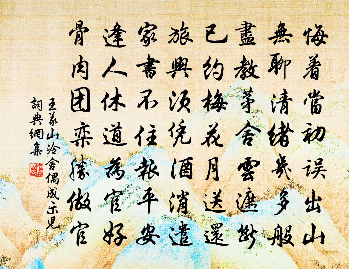 詩詞名句歷史字典書法欣賞書法字典國語詞典說文解字康熙字典古漢語字典標 題 作 者 詩 句 冷舍偶成示兒作者:王義山 朝代:宋代冷舍偶成示兒原文悔著當初誤出山,無聊清緒幾多般。盡教茅舍雲遮斷,已約梅花月送還。旅興須憑酒消遣,家書不住報平安。逢人休道為官好,骨肉團欒勝做官。詩詞問答問:冷舍偶成示兒的作者是誰?答:王義山問:冷舍偶成示兒寫於哪個朝代?答:宋代王義山冷舍偶成示兒書法欣賞冷舍偶成示兒書法作品詩詞推薦立春七首劉克莊〔宋代〕解凍依然風栗烈,鞭春才了雨廉纖。街坊遏密無儺鼓,村落豐登有酒帘。古岩釋紹曇〔宋代〕揭示先天那一機,孤危不立自孤危。懸崖撒手人無數,石爛松枯總不知。灘頭寺懷莫升之趙蕃〔宋代〕青衫縣尹沈泉久,黃綬尉曹華發多。重到灘頭舊遊寺,一觴獨舉奈愁何。藕花華岳〔宋代〕惜絲不肯織宮鞋,花月仙人謫不來。河伯借泥封玉腕,風神翻流沃香腮。無房不許蜂留宿,有蓋嘗令鷺自開。何事丹丘道中寄錢大資二首釋道舉〔宋代〕向來湯餅潑油蔥,思舊所懷惟此翁。日暮樓邊梅子雨,夜涼亭下藕花風。凌煙晉室謝文靖,陰德唐朝徐有功。二十送王鍊師赴王屋洞權德輿〔唐代〕稔歲在芝田,歸程入洞天。白雲辭上國,青鳥會群仙。自以棋銷日,寧資藥駐年。相看話離合,風馭忽泠然。句劉宏〔宋代〕黃茅苦露宜加意,莫累吾君殺諫臣。潛邸恭和御製淨明院梅岩詩宋孝宗〔宋代〕秀色環亭擁霽霞,修筠冰艷數枝斜。東君欲奉天顏喜,故遣融和放早花。素梅 其六王冕〔元代〕江南十月春色早,處處梅花當水開。玉笛一聲霜不小,滿天明月鶴飛來。句陳桷〔宋代〕神仙多是大羅客,我比大羅超一格。三衢阻雪至永豐道中又雪舒邦佐〔宋代〕前日堆銀凍未消,今朝滿地踏瓊瑤。一杯蘸甲寒威退,只要行人著酒澆。秋興吳龍起〔宋代〕定是憑高易得愁,客懷牢落怕登樓。不知昨夜梧桐雨,添得闌乾幾許秋。薌林五十詠雪台楊萬里〔宋代〕玉樹參差出,天花頃刻開。先生倚欄處,指點是瑤台。詠生子安應試新亭二詩鄭猷〔宋代〕前年諫獵出長楊,乞得新亭作醉鄉。好把青衫送酒媼,從教人識御眯香。次韻答吳阜之投贈項安世〔宋代〕沈沈寒甃綆千尋,澹澹疏弦瑟五音。讀罷自今三太息,箇中應有一生心。君真骨相超凡馬,我已情懷學展禽。肯為歐陽文忠公輓辭二首蘇頌〔宋代〕早向春闈遇品題,繼從留幕被恩知。何期瀔水緘書日,正是椒陵夢奠時。感舊緒言猶在耳,愴懷雙淚謾交頤。誰將郊外文同〔宋代〕城市壓壓土,高原聊振衣。晚雲多淺碧,秋樹半深緋。江氣雜輕靄,山光明落暉。因成求好景,更就野橋歸。叔父給事輓詞十首黃庭堅〔宋代〕曾發公家鉅萬錢,溝中襁褓卻生全。三齊水後皆禾稼,不殺耕牛更可傳。偈頌二十五首釋如淨〔宋代〕只個柴頭煨火種,諸方聿起競開爐。天童直截超宗處,爐與柴頭盡底無。恁麽卻有暖氣,正好猛做工夫。驀忽雷霆絕句閩清野人〔宋代〕偶與雲水會,不與雲水同。雲散水流去,杳然天地空。名句推薦傷心庾開府,老作北朝臣。司空曙《金陵懷古》 目前貧富非為準,久後窮通未可知。馮夢龍《醒世恆言·卷一》 是以動則必陷,為則必辱,是偏傷之患也。荀子《荀子·不苟》 有功於前,有敗於後,不為損刑。有善於前,有過於後,不為虧法。商鞅《商君書·賞刑》 節用儲蓄,以備凶災范曄《後漢書·本紀·肅宗孝章帝紀》 酒闌更喜團茶苦,夢斷偏宜瑞腦香。李清照《鷓鴣天·寒日蕭蕭上瑣窗》 責人勿厲,小惠或有大得。來俊臣《羅織經·保身卷第七》 城邊有古樹,日夕連秋聲。李白《沙丘城下寄杜甫》 月出驚山鳥,時鳴春澗中。王維《鳥鳴澗》 卻看妻子愁何在,漫捲詩書喜欲狂杜甫《聞官軍收河南河北》
