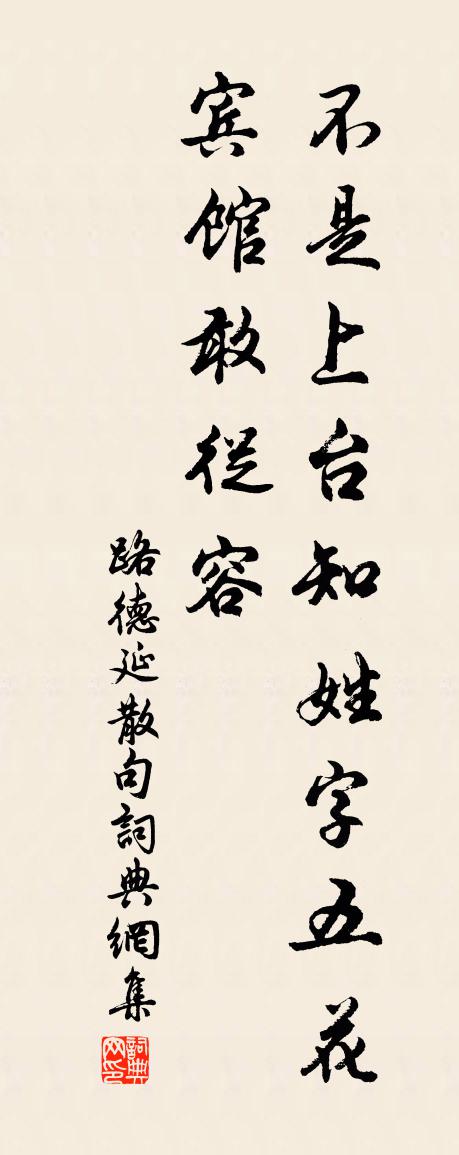 詩詞名句歷史字典書法欣賞書法字典國語詞典說文解字康熙字典古漢語字典標 題 作 者 詩 句 句作者:路德延 朝代:唐代句原文不是上台知姓字,五花賓館敢從容。詩詞問答問:句的作者是誰?答:路德延問:句寫於哪個朝代?答:唐代問:句是什麼體裁?答:句路德延句書法欣賞句書法作品注釋全唐詩:卷719-4詩詞推薦次友人示詩集姚勉〔宋代〕去歲春風客帝京,西湖煙雨過清明。蘇堤畫舫春三月,天竺清鍾夜五更。行李裹書歸舊隱,野花沽酒賞新晴。只緣崔侯燕城西高家亭複次韻陳造〔宋代〕昔人勝踐此興懷,復見西園游上才。譚麈生風容滿聽,酒觴插羽未須催。小令纖指鳴飛雹,卻遣紅檀趁落梅。更約感寓二首何夢桂〔宋代〕試向昆明問劫灰,幾看麋上蘇台。閒中曆日生青草,夢裡乾坤化大塊。塞雁南歸春又去,江潮東下暮還來。臨平山南歌子郭世模〔宋代〕玉盞浮瓊蟻,金奩吐翠虬。醉鄉歸路接溫柔。暗卜幽期低約、笑藏鬮。索去眉先鎖,將言淚已流。小窗移火更遲留仙水歸程王邁〔宋代〕九鯉湖邊路,重來盟未寒。折花挼水獻,策杖馭風還。宦海波濤惡,仙家日月間。前生丹在否,歲晚要重丸。賀新郎葛長庚〔宋代〕銀漢千絲雨。被東風作惡,吹落滿空柳絮。恰自江南訊息斷,才此六花飛舞。最好是、鵝毛鶴羽。萬頃平田三尺玉郊居秋日酬奚贊府見寄楊巨源〔唐代〕繁菊照深居,芳香春不如。聞尋周處士,知伴庾尚書。日晚汀洲曠,天晴草木疏。閒言揮麈柄,清步掩蝸廬。野老八絕詩白龍泉王禹偁〔宋代〕崖石何鑿鑿,渤潏涌山腳。含虛光可鑑,倒影壁如削。瀰漫到前溪,支脈通遠壑。白龍乃神物,胡此戀一勺。勢能戲書示黎教授歐陽修〔宋代〕古郡誰雲亳陋邦,我來仍值歲豐穰。烏銜棗實園林熟,蜂采檜花村落香。世治人方安◇畝,興闌吾欲反耕桑。若無樂壽縣君呂氏輓詞二首黃庭堅〔宋代〕剪髻賓筵盛,齊眉婦禮閒。謂宜俱白髮,忽去作青山。大夢驚蝴蠂,何時識佩環。哀歌行欲絕,丹旐雨斑斑。投贈福建桂常侍二首陳陶〔唐代〕後來台席更何人,都護朝天拜近臣。長笑當時漢卿士,等閒恩澤畫麒麟。匝地歌鐘鎮海隅,城池鞅掌舊名都。不知題崇蘭圖二首陳與義〔宋代〕奕奕天風吹角巾,松聲水色一時新。冊林從此不牢落,照影溪頭共六人。三峽聞猿慕幽〔唐代〕誰向茲來不恨生,聲聲都是斷腸聲。七千里外一家住,十二峰前獨自行。瘴雨晚藏神女廟,蠻煙寒鎖夜郎城。憑君道中二首宋祁〔宋代〕檥船清潁岸,岸豁見高原。桑柘寒煙路,牛羊落日村。扣舷魚艇集,爭食渚鳧喧。去去風波事,逢人未易言。挽吏部石似之虞儔〔宋代〕憂國囊封豈是疎,有才無命信何如。風回冊府三山遠,星殞郎牆一位虛。賈誼自傷終太傅,薛收若在必中書。哀哉巫山一段雲 長湍石壁李齊賢〔元代〕插水雲根聳,橫空黛壁開。魚龍吹浪轉隅隈。百里綠徘徊。日浸玻璃色,花分錦繡堆。畫船載酒管弦催。一日繞千錢湖州以箬下酒,李蘇州以五(酉殳)酒,相次白居易〔唐代〕勞將箬下忘憂物,寄與江城愛酒翁。鐺腳三州何處會,瓮頭一醆幾時同。傾如竹葉盈樽綠,飲作桃花上面紅。莫怪答殷堯藩贈罷涇源記室沈亞之〔唐代〕勞君輟雅話,聽說事疆場。提筆從征虜,飛書始伏羌。河流辭馬嶺,節臥聽龍驤。孤負平生劍,空憐射斗光。夏初湖村雜題陸游〔宋代〕寒泉自換菖蒲水,活火閒煎橄欖茶。自是閒人足閒趣,本無心學野僧家。松源和尚贊釋文禮〔宋代〕耳根聵兀如鴟,項頸縮拗如驢,有問東卻答西。未嘗許可,說甚傳持。臨行三轉語,自起一團疑。幾多吞不下,背名句推薦流光容易把人拋,紅了櫻桃,綠了芭蕉。蔣捷《一剪梅·舟過吳江》 念碎劈芳心,縈思千縷,贈將幽素,偷翦重雲。吳文英《風流子·黃鐘商芍藥》 人能弘道,焉知來者之不如昔也?王通《中說·卷五·問易篇》 生事且瀰漫,願為持竿叟。綦毋潛《春泛若耶溪》 山邊幽谷水邊村,曾被疏花斷客魂。張嵲《墨梅》 粉墮百花洲,香殘燕子樓。曹雪芹《唐多令·柳絮》 嘆江山如故,千村寥落。岳飛《滿江紅·登黃鶴樓有感》 生而不有,為而不恃,功成而弗居。夫唯弗居,是以不去。老子《老子·道經·第二章》 沽酒清陰時系馬,招涼短檻幾留題。許德溥《西橋柳色》 時來天地皆同力,運去英雄不自由。羅隱《籌筆驛》