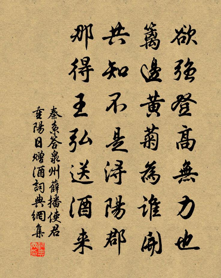 詩詞名句歷史字典書法欣賞書法字典國語詞典說文解字康熙字典古漢語字典標 題 作 者 詩 句 答泉州薛播使君重陽日贈酒作者:秦系 朝代:唐代答泉州薛播使君重陽日贈酒原文欲強登高無力也,籬邊黃1/1菊為誰開。共知不是潯陽郡,那得王弘送酒來。詩詞問答問:答泉州薛播使君重陽日贈酒的作者是誰?答:秦系問:答泉州薛播使君重陽日贈酒寫於哪個朝代?答:唐代問:答泉州薛播使君重陽日贈酒是什麼體裁?答:七絕秦系答泉州薛播使君重陽日贈酒書法欣賞答泉州薛播使君重陽日贈酒書法作品注釋全唐詩:卷260_29詩詞推薦夜尋盧處士耿湋〔唐代〕月高雞犬靜,門掩向寒塘。夜竹深茅宇,秋庭冷石床。住山年已遠,服藥壽偏長。虛棄如吾者,逢君益自傷。閒居雜興十首薛嵎〔宋代〕閉戶謝流俗,青山獨自看。淡交從古少,冷麵對人難。農圃元非學,神仙不在丹。孤懷無別想,回向此心觀。五音曲 角引沈約〔南北朝〕萌生觸發。歲在春。鹹池始奏。德尚仁。惉懘以息。和且均。過蒼嶺樓鑰〔宋代〕崇朝辛苦上孱顏,泥徑初平意暫閒。蒼嶺東頭移野步,眼前便得處州山。盧明府早秋宴張郎中海園即事,得秋字(一作盧象詩)孟浩然〔唐代〕邑有弦歌宰,翔鸞狎野鷗。眷言華省舊,暫拂海池游。郁島藏深竹,前溪對舞樓。更聞書即事,雲物是清秋。初聞雷聲高翥〔宋代〕二月寒猶在,春雲濕未開。灑窗終夜雨,發軔數聲雷。薺麥綠生臘,棠梨紅拆腮。西湖花事動,從此日裴回。宮詞一百首王建〔唐代〕蓬萊正殿壓金鰲,紅日初生碧海濤。閒著五門遙北望,柘黃新帕御床高。殿前傳點各依班,召對西來八詔蠻。上得蝶戀花晏殊〔宋代〕南雁依稀回側陣。雪霽牆陰,偏覺蘭牙嫩。中夜夢余消酒困。爐香卷穗燈生暈。急景流年都一瞬。往事前歡,未免句許玠〔宋代〕苔封曲徑無人到。鄭宋用前韻見示因亦和答四首韓元吉〔宋代〕九陌歌呼屬後游,一蓑風景付漁舟。相逢且向南溪看,玉作靈山萬石樓。西州城馬之純〔宋代〕運瀆居東西冶城,西州遺蹟甚分明。多言東晉才經始,或說孫吳已創成。池苑春風羅綺市,樓台夜月管弦聲。入門法界頌張嵲〔宋代〕自從仞得無邊界,宇宙方知狹陋生。時節短於羊胛熟,廣輪才似一牛鳴。三月三日登龍山張九齡〔唐代〕伊川與灞津,今日祓除人。豈似龍山上,還同湘水濱。衰顏憂更老,淑景望非春。禊飲豈吾事,聊將偶俗塵。癸未御前帖子三首曹勛〔宋代〕中原久已困膻腥,攻守知惟斷乃成。便有戎酋歸聖化,甘泉應得慰皇情。木蘭花慢 為張詹事壽王惲〔元代〕愛承華詹尹,盡明略,更雄襟。甚瀟灑清吟,半生夢寐,銅輦秋衾。莫論量,歸計早,恐未容、亭扁遂初心。共道挽鄭通判陳宓〔宋代〕厚重公清譽藹然,人言端似楚公賢。為官不取橫科勢,佐郡何妨二十年。徐貌價通常不變,陽城撫字已先傳。雙旌菩薩蠻朱彝尊〔清代〕低鬟十八雲初約,春衫剪就輕容薄。彈作墨痕飛,折枝花滿衣。羅裙百子褶,翠似新荷葉。小立斂風才,移時吹又句歐陽鈇〔宋代〕有客過門湖海士,隔籬呼酒咄嗟間。嵩山黃庶〔宋代〕峨峨鎮中夏,峻極萬尋隮。突兀磨天頂,窈窕入地臍。中林興夏雹,半壑臥秋霓。泉恐連清漢,峰疑擁碧圭。雲高句釋曉瑩〔宋代〕平章風物詩無敵。名句推薦杏樹壇邊漁父,桃花源里人家。王維《田園樂七首·其三》 淇則有岸,隰則有泮。佚名《氓》 大江東去,浪淘盡,千古風流人物。蘇軾《念奴嬌·赤壁懷古》 宣父猶能畏後生,丈夫未可輕年少。李白《上李邕》 盡信書,則不如無書。孟子《孟子·盡心章句下·第三節》 月有盈虧花有開謝,想人生最苦離別。張鳴善《普天樂·詠世》 知之者不如好之者,好之者不如樂之者。孔子弟子《論語·雍也篇》 東君也不愛惜,雪壓霜欺。晁沖之《漢宮春·梅》 重岡已隔紅塵斷,村落更年豐。元好問《人月圓·重岡已隔紅塵斷》 宣和舊日,臨安南渡,芳景猶自如故。劉辰翁《永遇樂·璧月初晴》